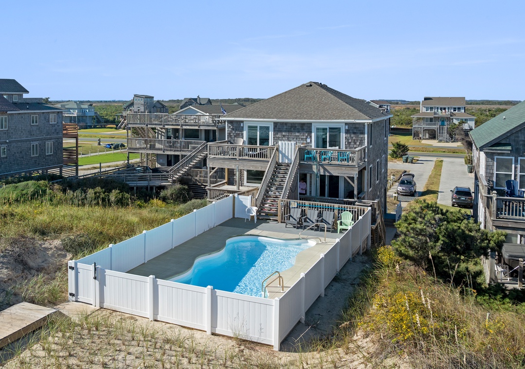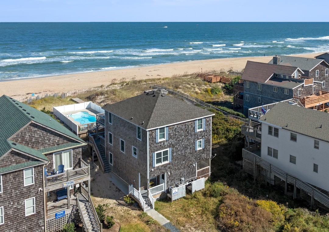 New to the Village Realty program for 2025! Make your way to Presidential Boardwalk, a classic oceanfront home in South Nags Head with fabulous views of the sparkling Atlantic and the nearby Outer Banks Fishing Pier. For non-stop fun in the sun, guests can easily transition from the saltwater pool to the beach using the private walkway. The pool can be heated certain times of the year, ideal for Spring and Fall getaways. An expansive east-facing deck with hot tub is where you can soak up the sun by day and lounge under the stars at night. With six bedrooms and over 3,000 square feet of well-maintained living space, this oceanfront retreat is the perfect choice for extended families or multiple groups vacationing together. Dogs are welcome, so even your canine companions can join you.