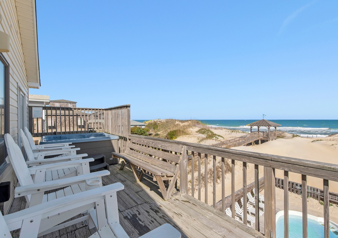 A reverse floor plan takes full advantage of the panoramic ocean views, which can be enjoyed from all the common areas on the top level. Stylish, wide-plank LVP flooring is installed throughout, and the open-concept layout allows everyone to spend quality time together. Vaulted ceilings with skylights make the space feel bright and airy, while the original juniper paneling maintains the home's original warmth and character. A spacious living area spans the width of the house and provides plenty of comfortable seating. It leads out to an expansive oceanfront deck where you can take a relaxing soak in the bubbly hot tub while enjoying the ocean view. Back inside, everyone can pitch in with meal prep using the newly remodeled kitchen boasting stunning quartz countertops and stainless steel appliances. With two dining tables that seat a total of twelve and bar seating for eight, there's more than enough room for everyone to sit down and enjoy meals together. The primary bedroom is also located on the top level and includes a king bed, ensuite bath and private deck. All other bedrooms are situated on the lower level, including a second ensuite. Three of the mid-level bedrooms feature deck access for fresh ocean breezes and falling asleep to the sound of crashing waves. There's also a den that can serve as a second hangout space with convenient access to a wet bar and mini fridge.