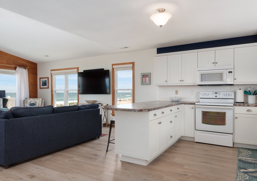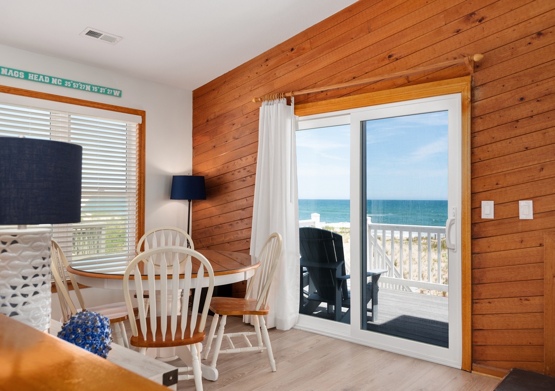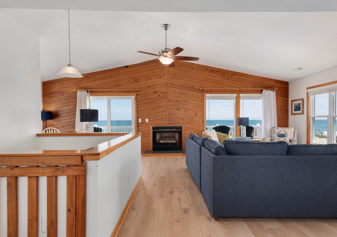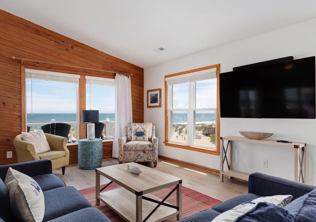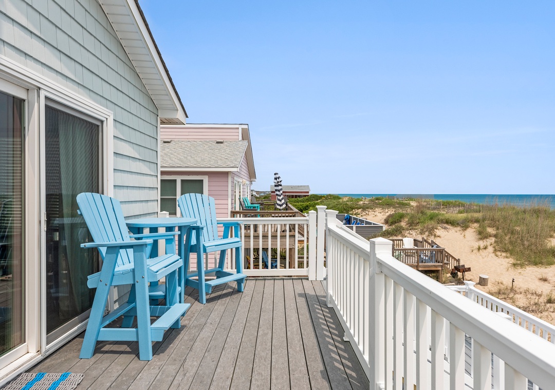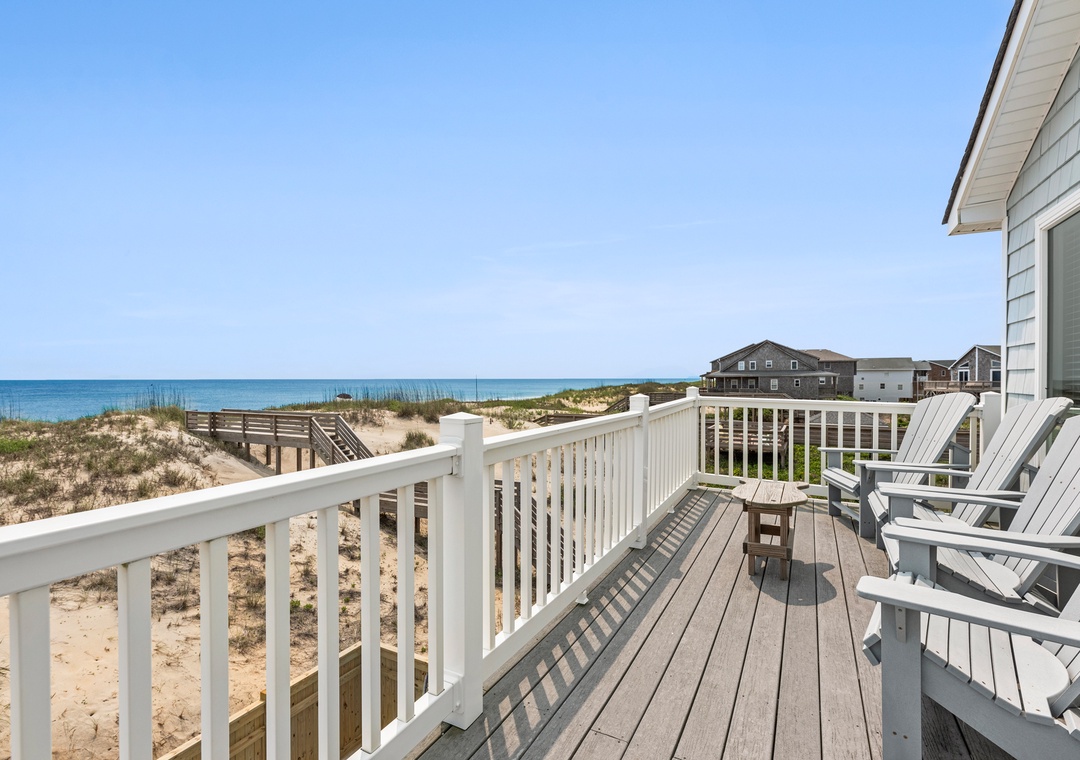 The reverse floor plan at Shell Cottage takes full advantage of the panoramic ocean views, which can be enjoyed from every room on the top level. Stylish and beach-friendly LVT flooring is installed throughout, and the open-concept layout allows everyone to spend quality time together even while preparing meals in the kitchen. Dine al fresco on the screened porch while watching the sun go down. After dinner, mix cocktails at the wet bar to serve on the oceanfront deck. Take the stairs down to the mid-level and use the private walkway to the beach for an evening stroll by the shore break.