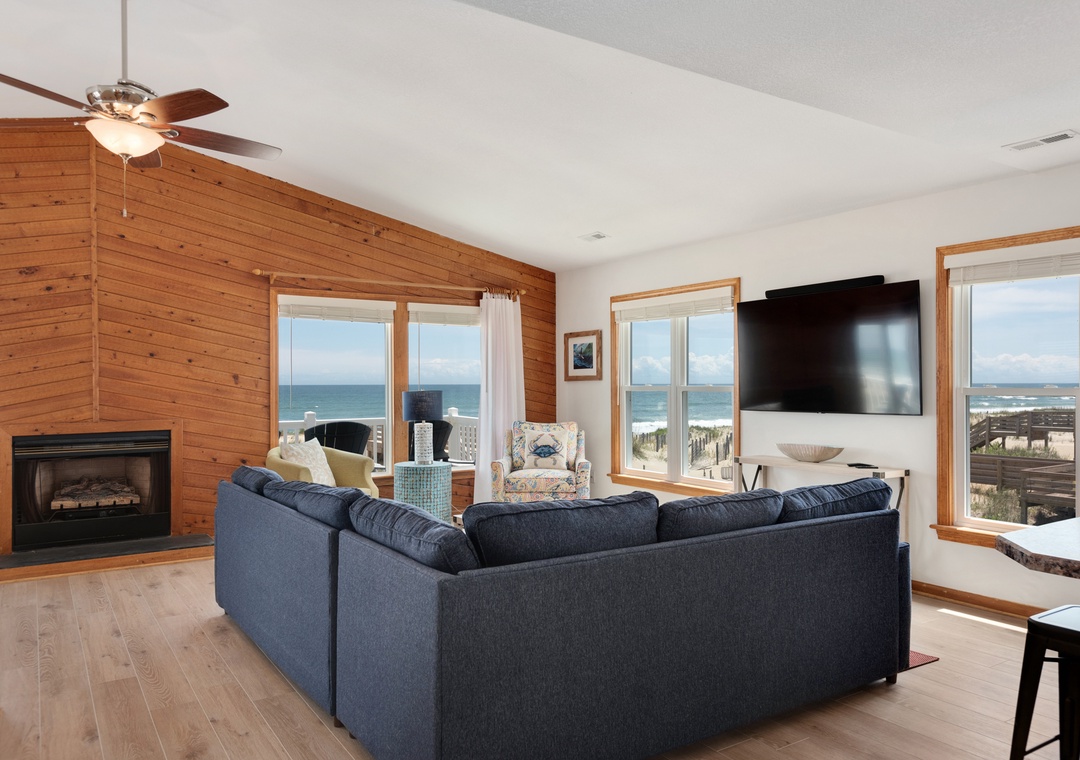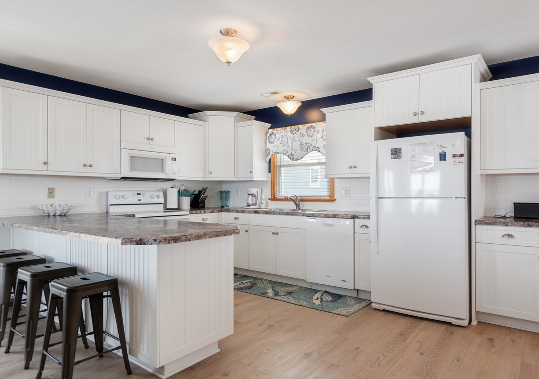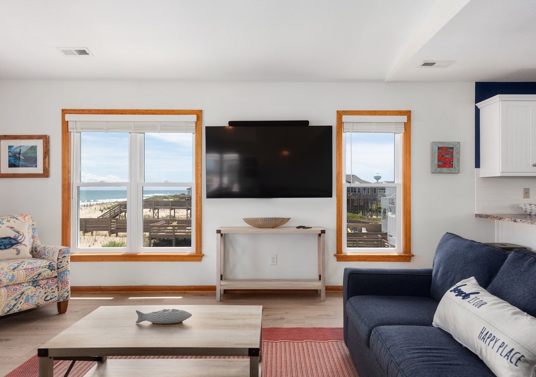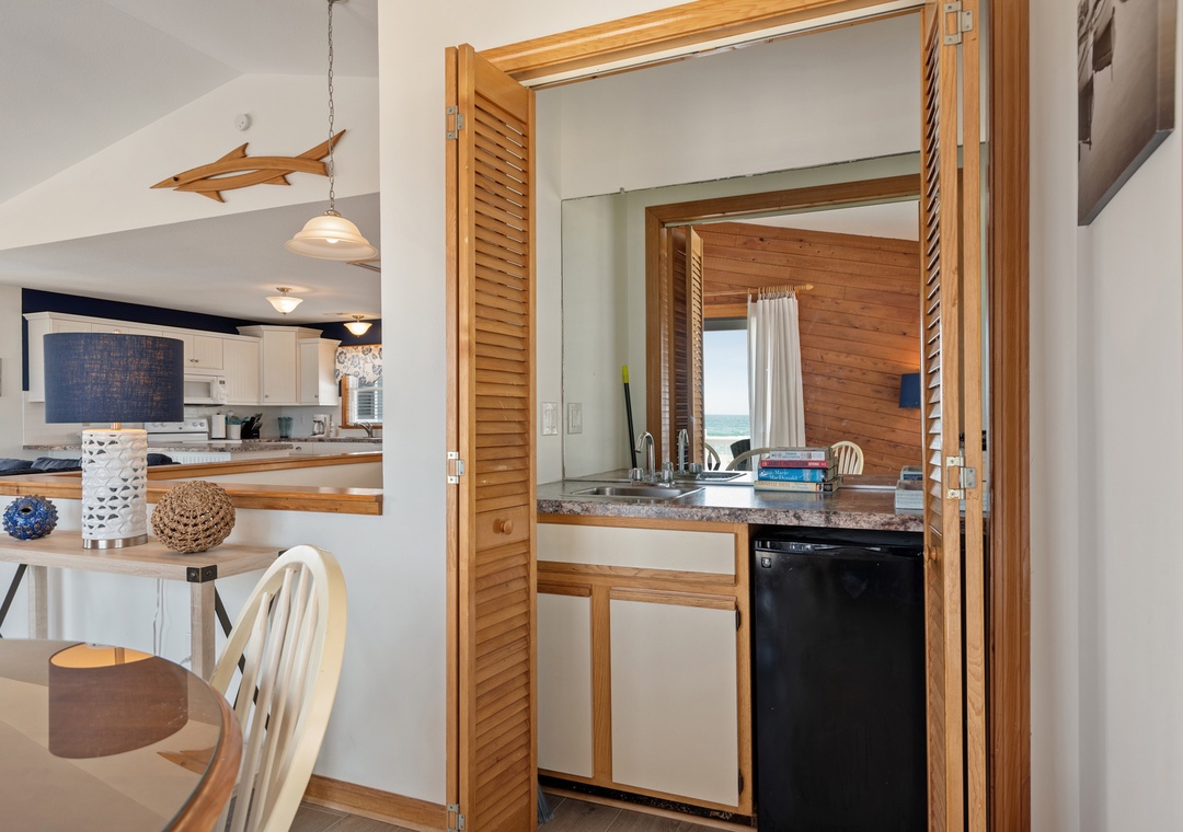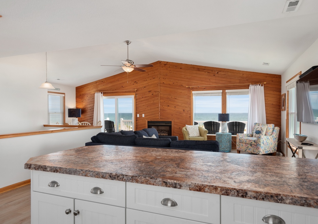 The reverse floor plan at Shell Cottage takes full advantage of the panoramic ocean views, which can be enjoyed from every room on the top level. Stylish and beach-friendly LVT flooring is installed throughout, and the open-concept layout allows everyone to spend quality time together even while preparing meals in the kitchen. Dine al fresco on the screened porch while watching the sun go down. After dinner, mix cocktails at the wet bar to serve on the oceanfront deck. Take the stairs down to the mid-level and use the private walkway to the beach for an evening stroll by the shore break.