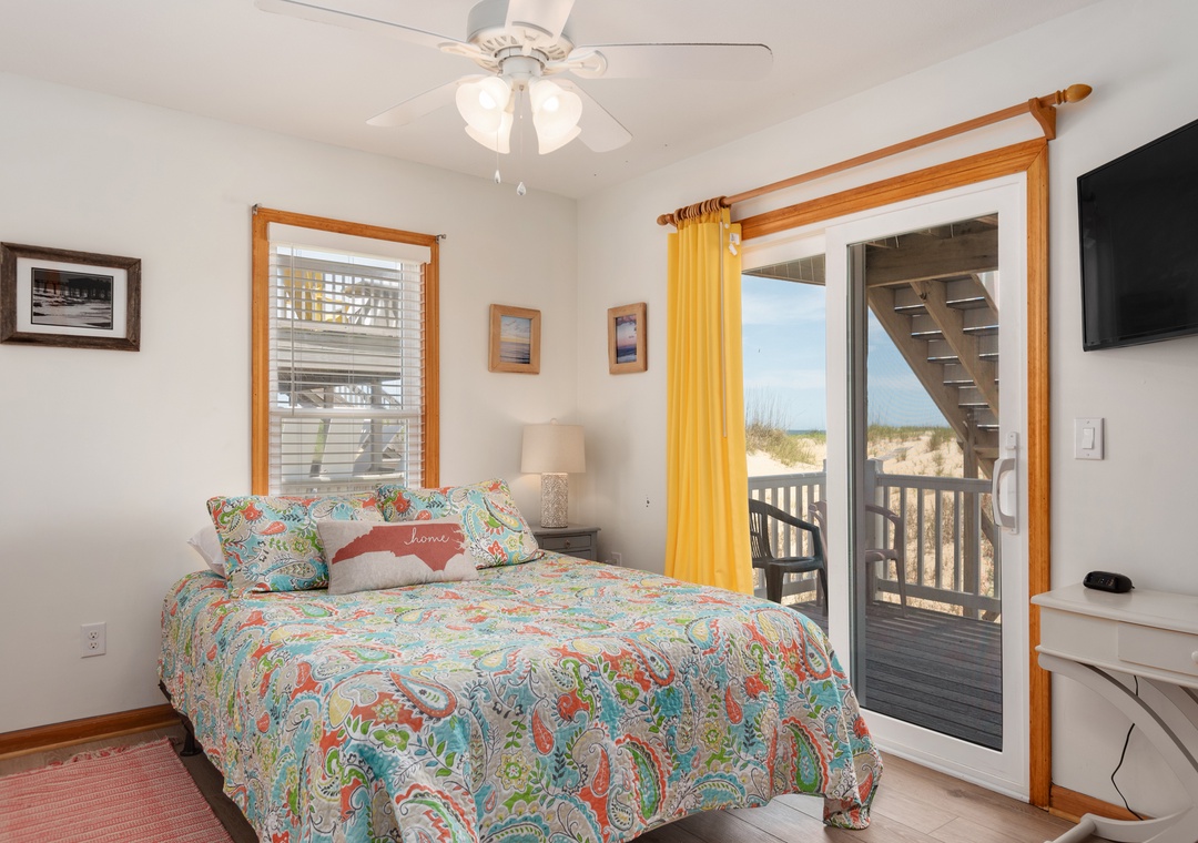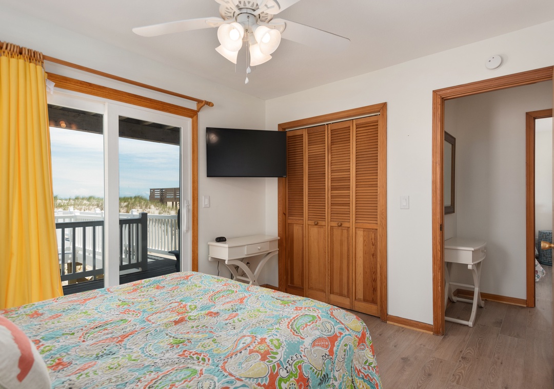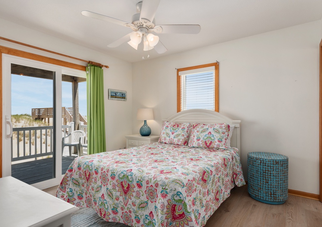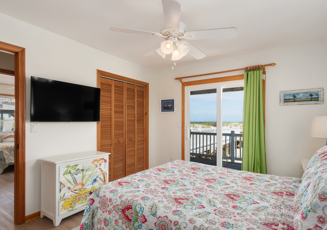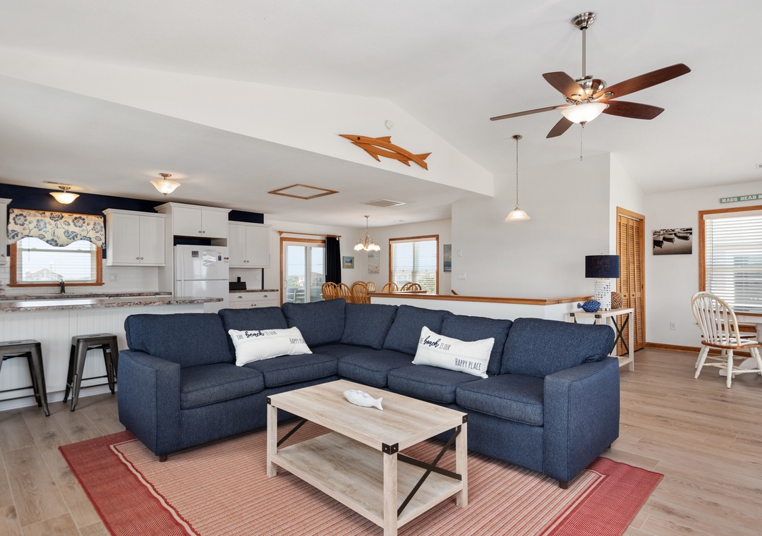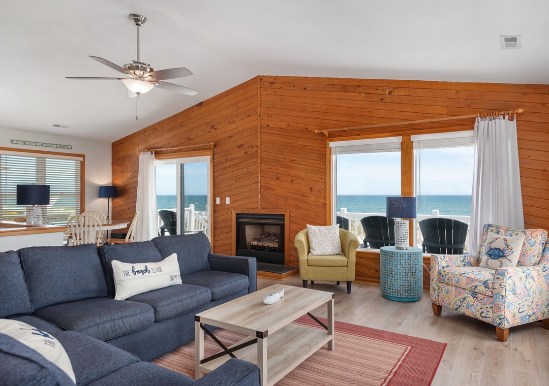 The reverse floor plan at Shell Cottage takes full advantage of the panoramic ocean views, which can be enjoyed from every room on the top level. Stylish and beach-friendly LVT flooring is installed throughout, and the open-concept layout allows everyone to spend quality time together even while preparing meals in the kitchen. Dine al fresco on the screened porch while watching the sun go down. After dinner, mix cocktails at the wet bar to serve on the oceanfront deck. Take the stairs down to the mid-level and use the private walkway to the beach for an evening stroll by the shore break.