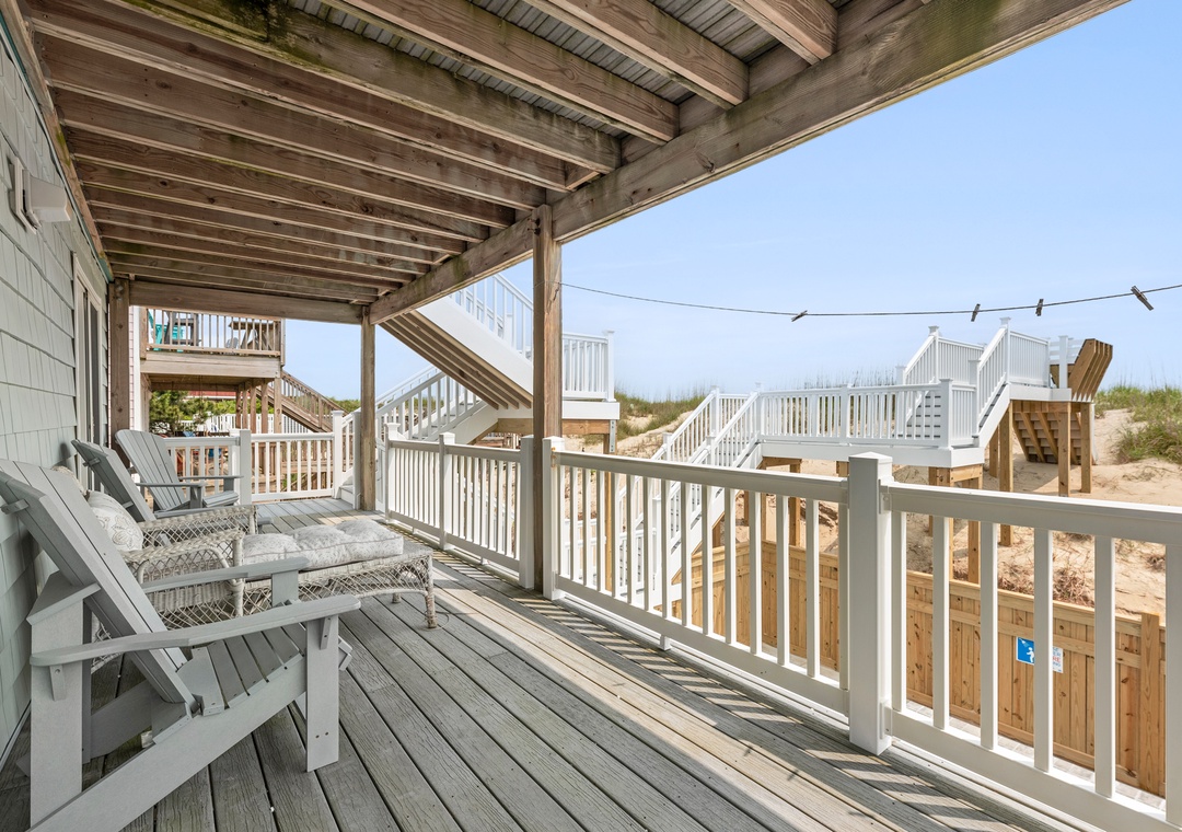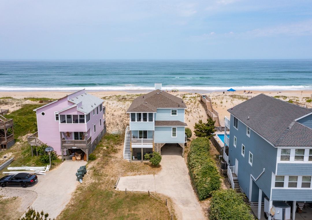 All four bedrooms are conveniently located on the mid-level, and the two master suites provide direct access to a covered oceanfront deck. Rinse off in the enclosed outdoor shower on your way back from the beach and use the dry entry from the ground level, where you can drop off your towels and swimsuits in the laundry area.