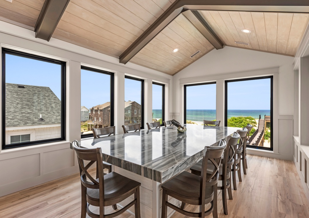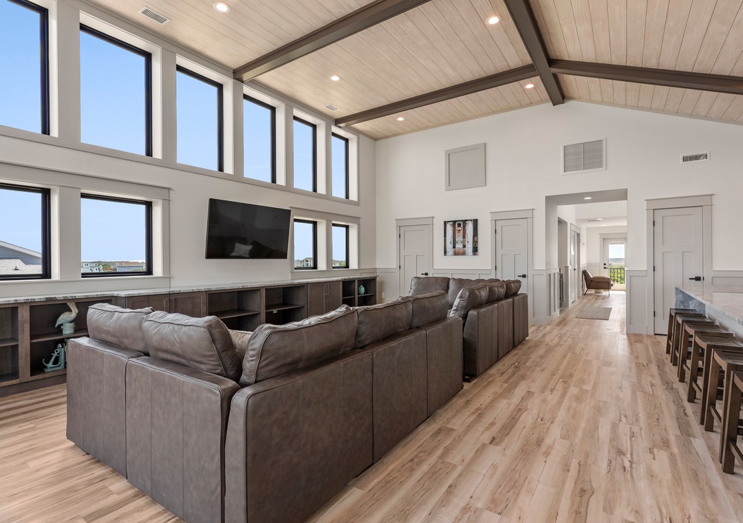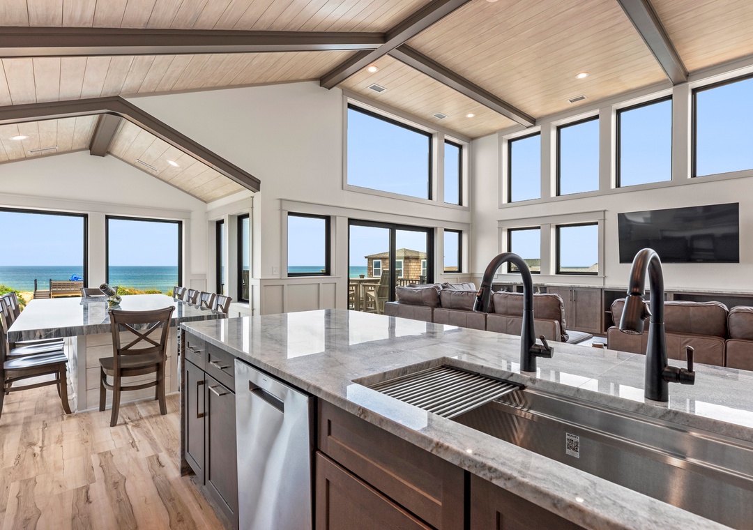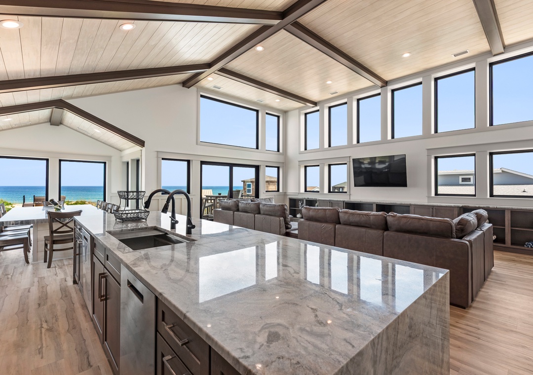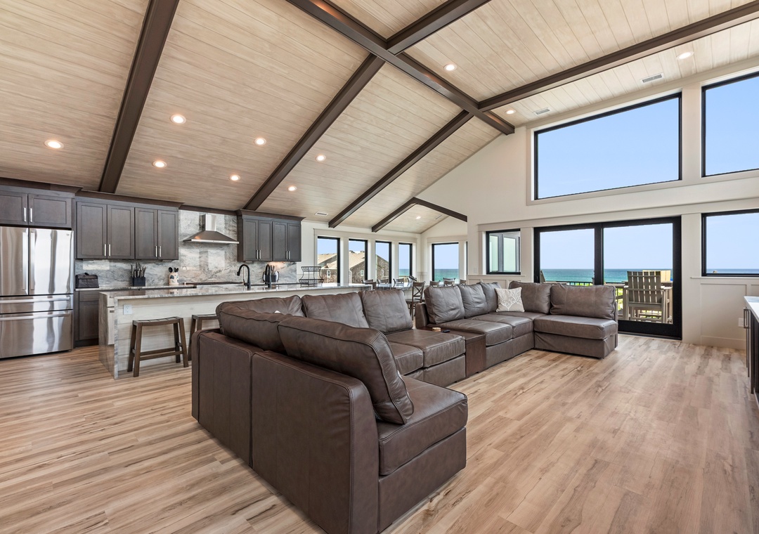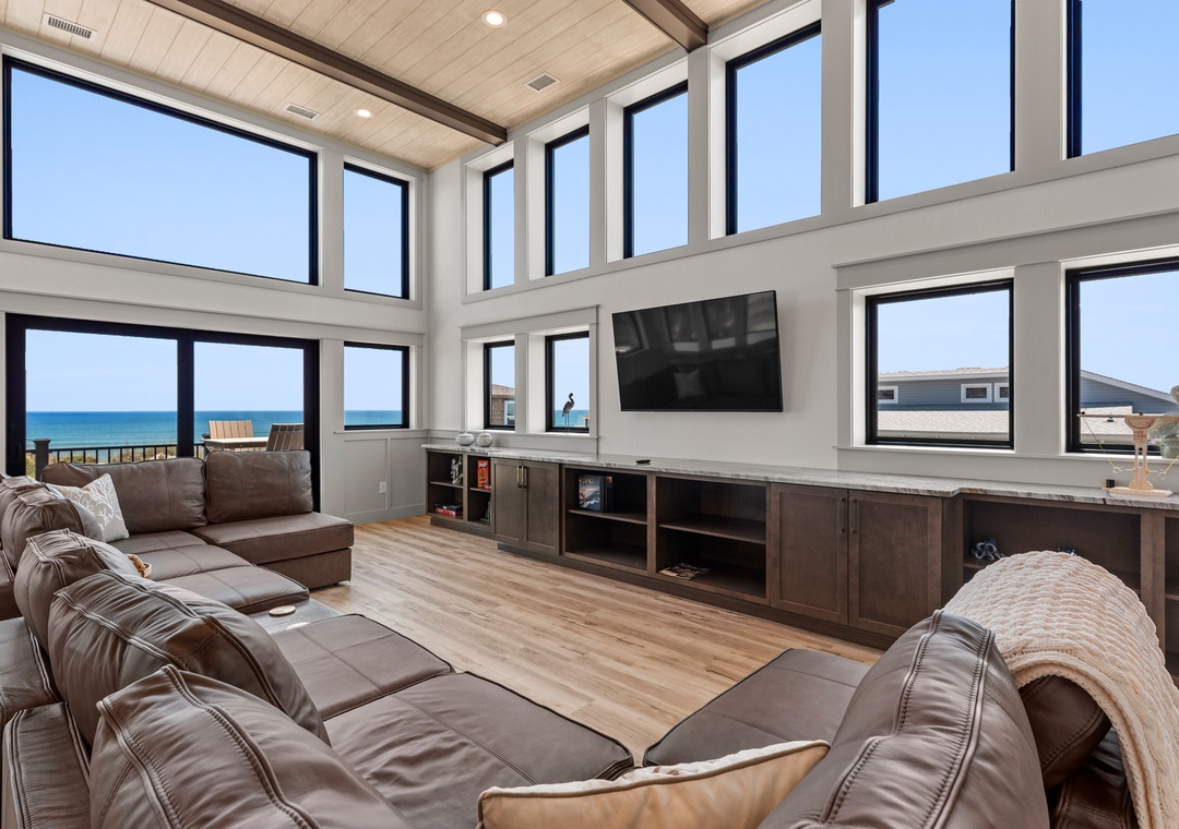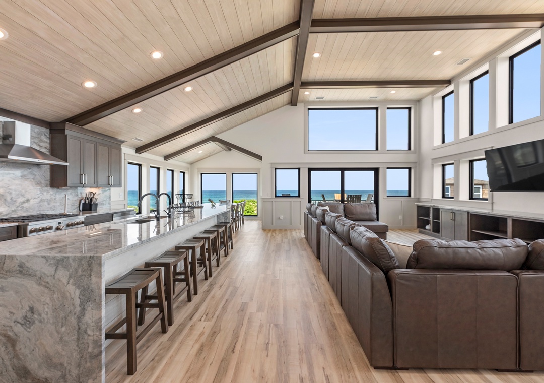 The main gathering space on the top level was designed for entertaining and spending time with loved ones, with a two-story wall of east-facing windows showcasing the panoramic ocean views. The living area leads out to an oceanfront deck where you can catch the sunrise with your morning coffee, watch your family play in the pool below, or simply take in the salty ocean breezes. When it's time to eat, embrace your inner chef using the expansive kitchen with large island for plenty of prep space. Or grab a drink and head over to the Sunset Lounge on the west side of the top floor where you can admire the dazzling skies in the evenings. One of the seven ensuite bedrooms is also located on the top level and includes a private bath with walk-in shower and dual vanity.