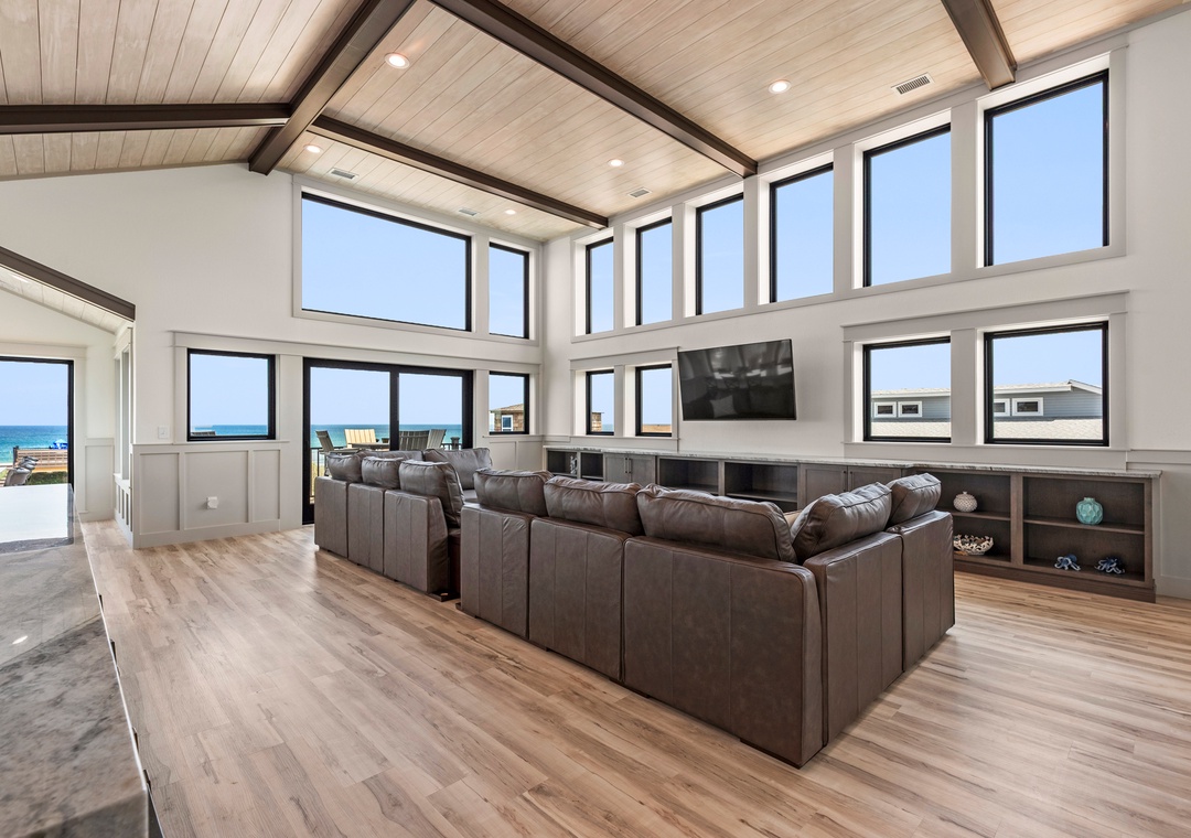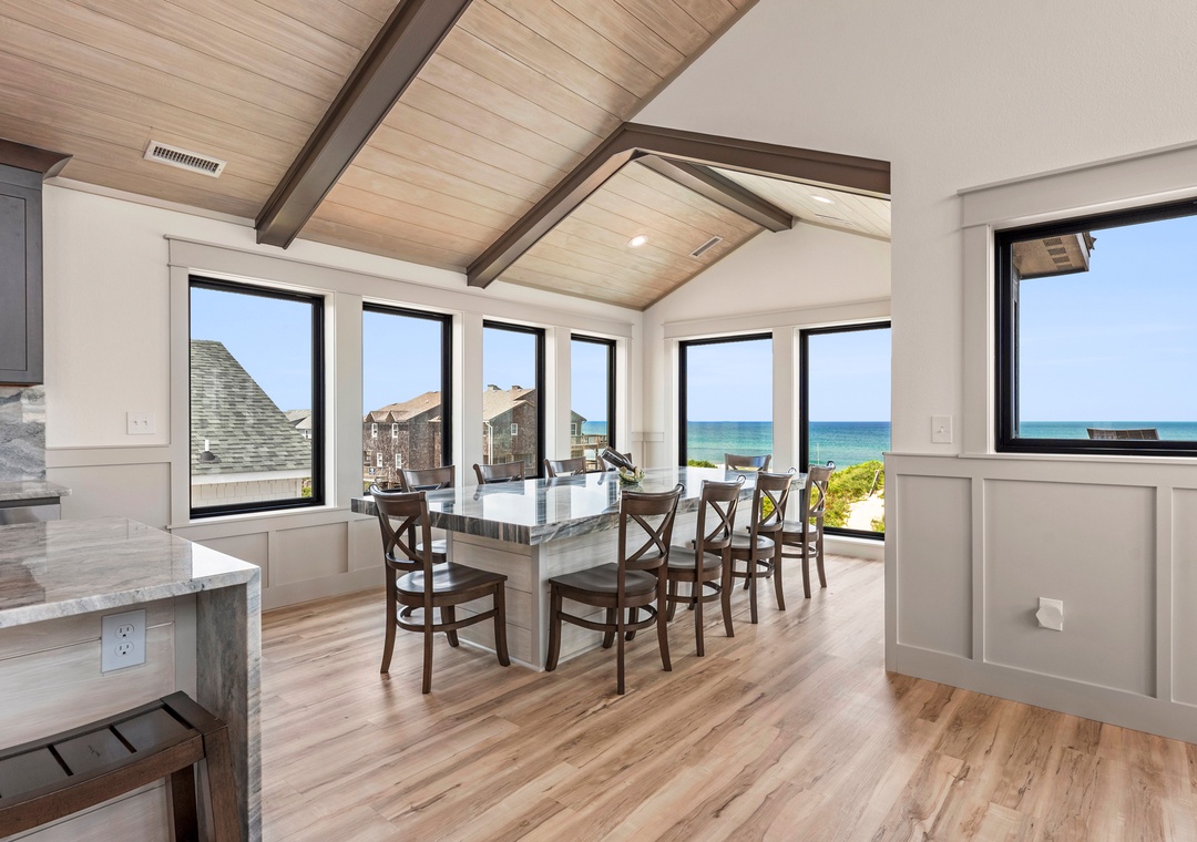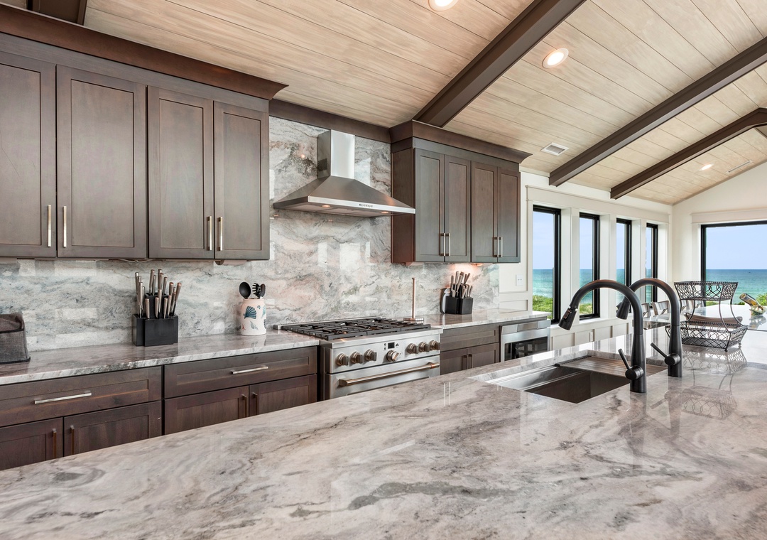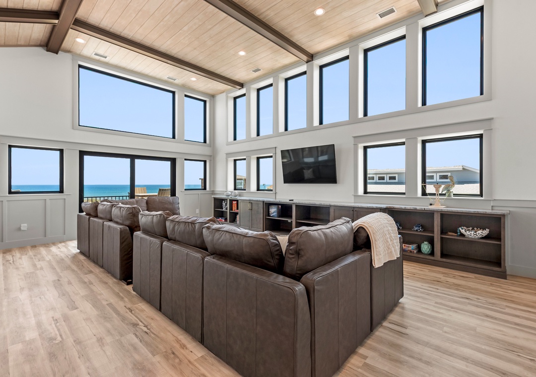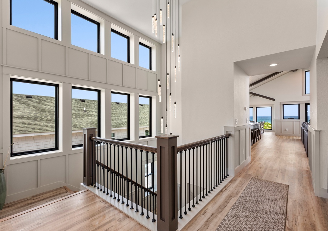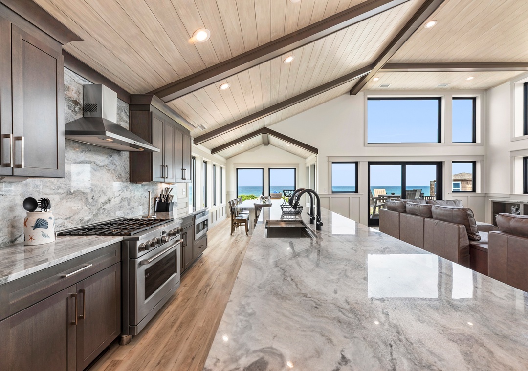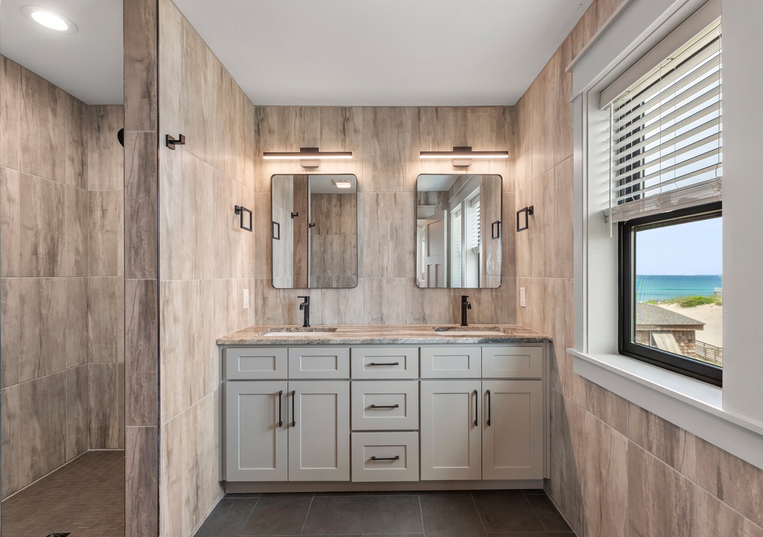 The main gathering space on the top level was designed for entertaining and spending time with loved ones, with a two-story wall of east-facing windows showcasing the panoramic ocean views. The living area leads out to an oceanfront deck where you can catch the sunrise with your morning coffee, watch your family play in the pool below, or simply take in the salty ocean breezes. When it's time to eat, embrace your inner chef using the expansive kitchen with large island for plenty of prep space. Or grab a drink and head over to the Sunset Lounge on the west side of the top floor where you can admire the dazzling skies in the evenings. One of the seven ensuite bedrooms is also located on the top level and includes a private bath with walk-in shower and dual vanity.