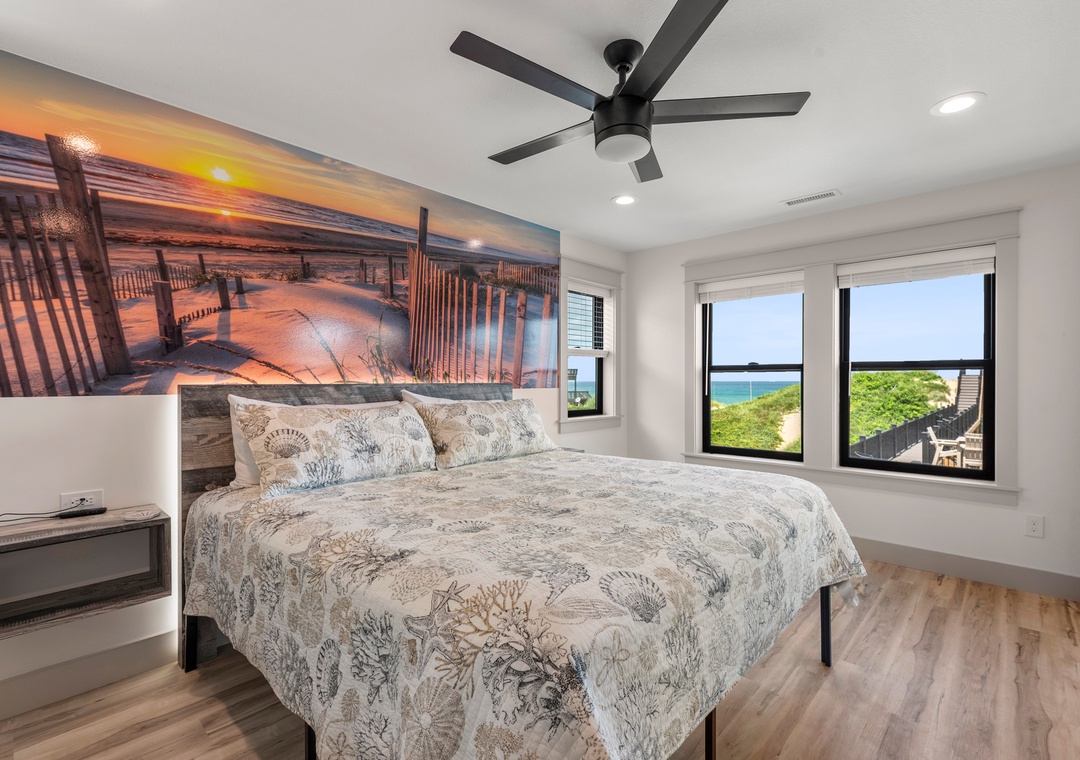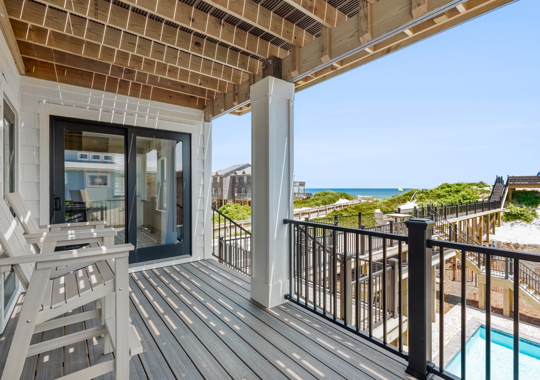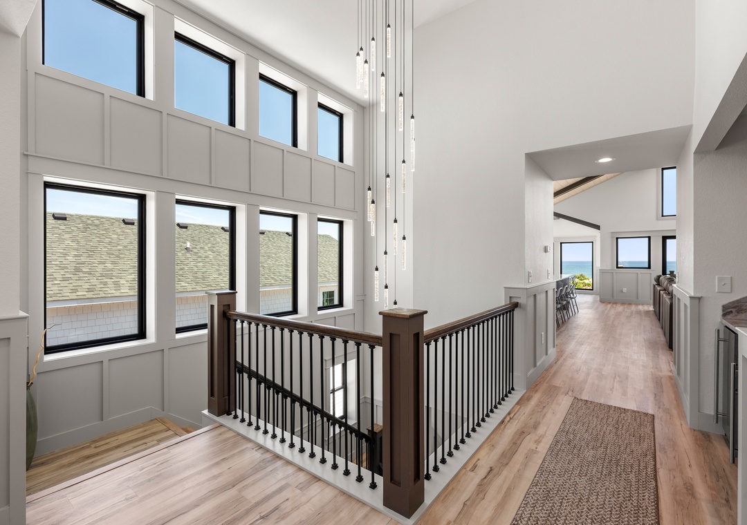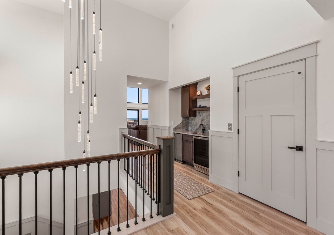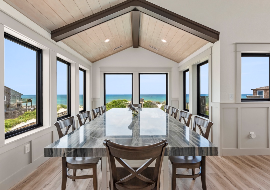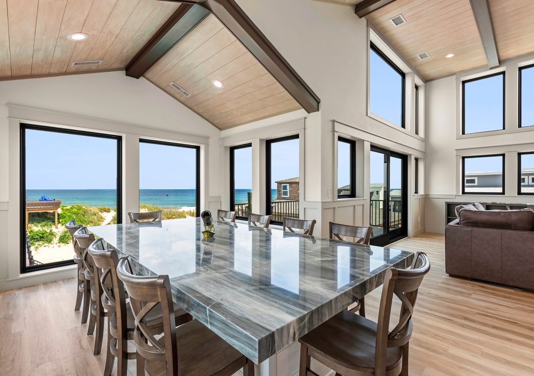 The main gathering space on the top level was designed for entertaining and spending time with loved ones, with a two-story wall of east-facing windows showcasing the panoramic ocean views. The living area leads out to an oceanfront deck where you can catch the sunrise with your morning coffee, watch your family play in the pool below, or simply take in the salty ocean breezes. When it's time to eat, embrace your inner chef using the expansive kitchen with large island for plenty of prep space. Or grab a drink and head over to the Sunset Lounge on the west side of the top floor where you can admire the dazzling skies in the evenings. One of the seven ensuite bedrooms is also located on the top level and includes a private bath with walk-in shower and dual vanity.