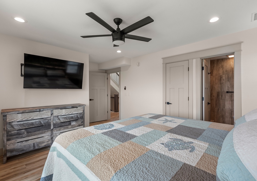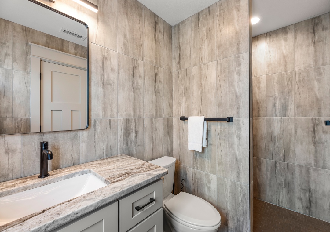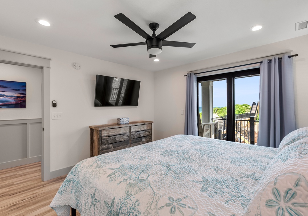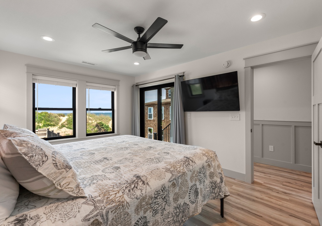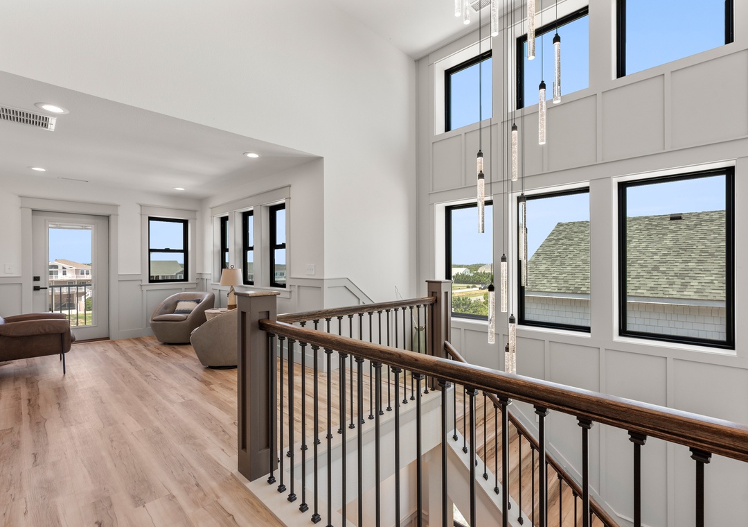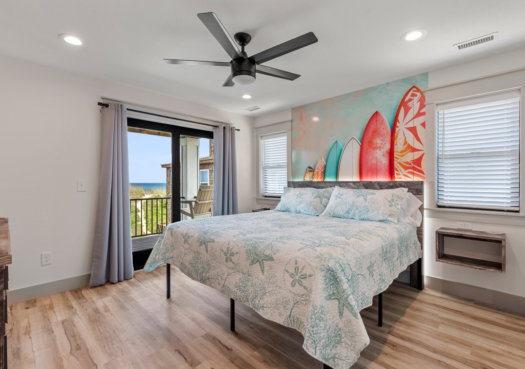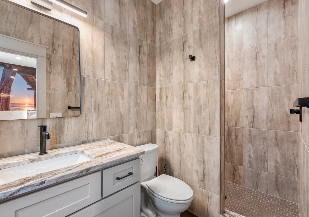 The main gathering space on the top level was designed for entertaining and spending time with loved ones, with a two-story wall of east-facing windows showcasing the panoramic ocean views. The living area leads out to an oceanfront deck where you can catch the sunrise with your morning coffee, watch your family play in the pool below, or simply take in the salty ocean breezes. When it's time to eat, embrace your inner chef using the expansive kitchen with large island for plenty of prep space. Or grab a drink and head over to the Sunset Lounge on the west side of the top floor where you can admire the dazzling skies in the evenings. One of the seven ensuite bedrooms is also located on the top level and includes a private bath with walk-in shower and dual vanity.