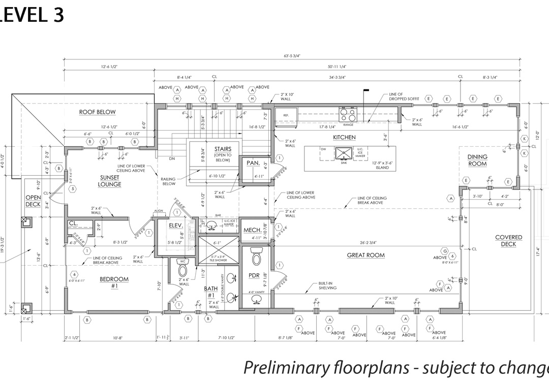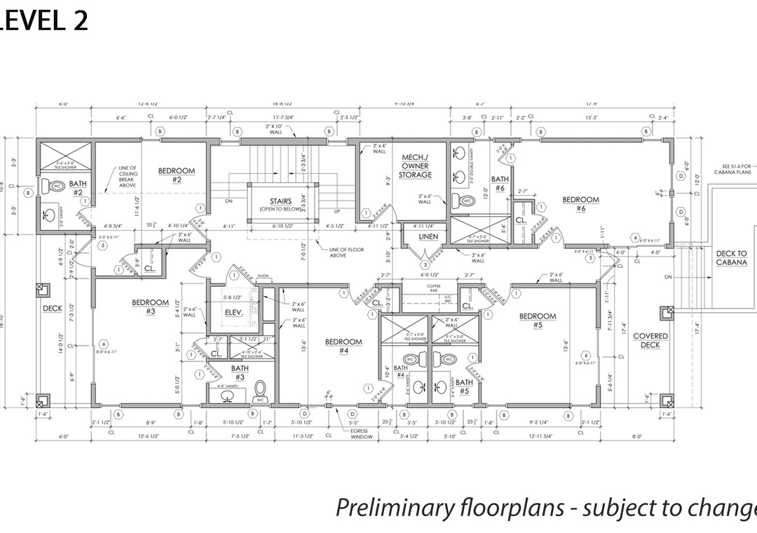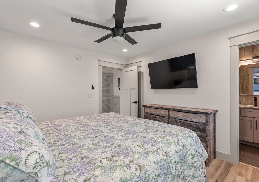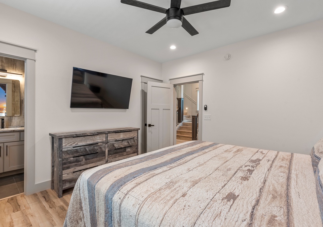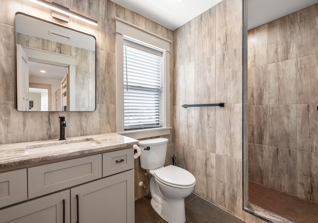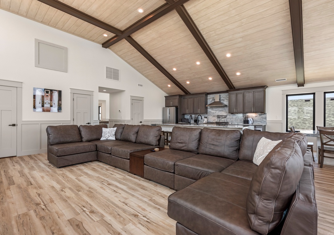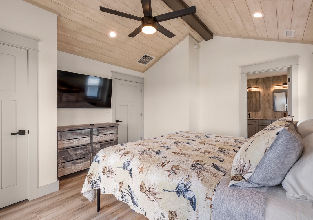 The main gathering space on the top level was designed for entertaining and spending time with loved ones, with a two-story wall of east-facing windows showcasing the panoramic ocean views. The living area leads out to an oceanfront deck where you can catch the sunrise with your morning coffee, watch your family play in the pool below, or simply take in the salty ocean breezes. When it's time to eat, embrace your inner chef using the expansive kitchen with large island for plenty of prep space. Or grab a drink and head over to the Sunset Lounge on the west side of the top floor where you can admire the dazzling skies in the evenings. One of the seven ensuite bedrooms is also located on the top level and includes a private bath with walk-in shower and dual vanity.