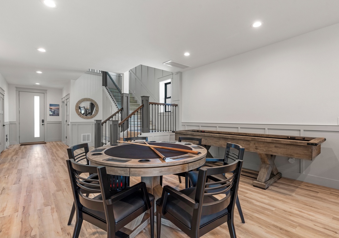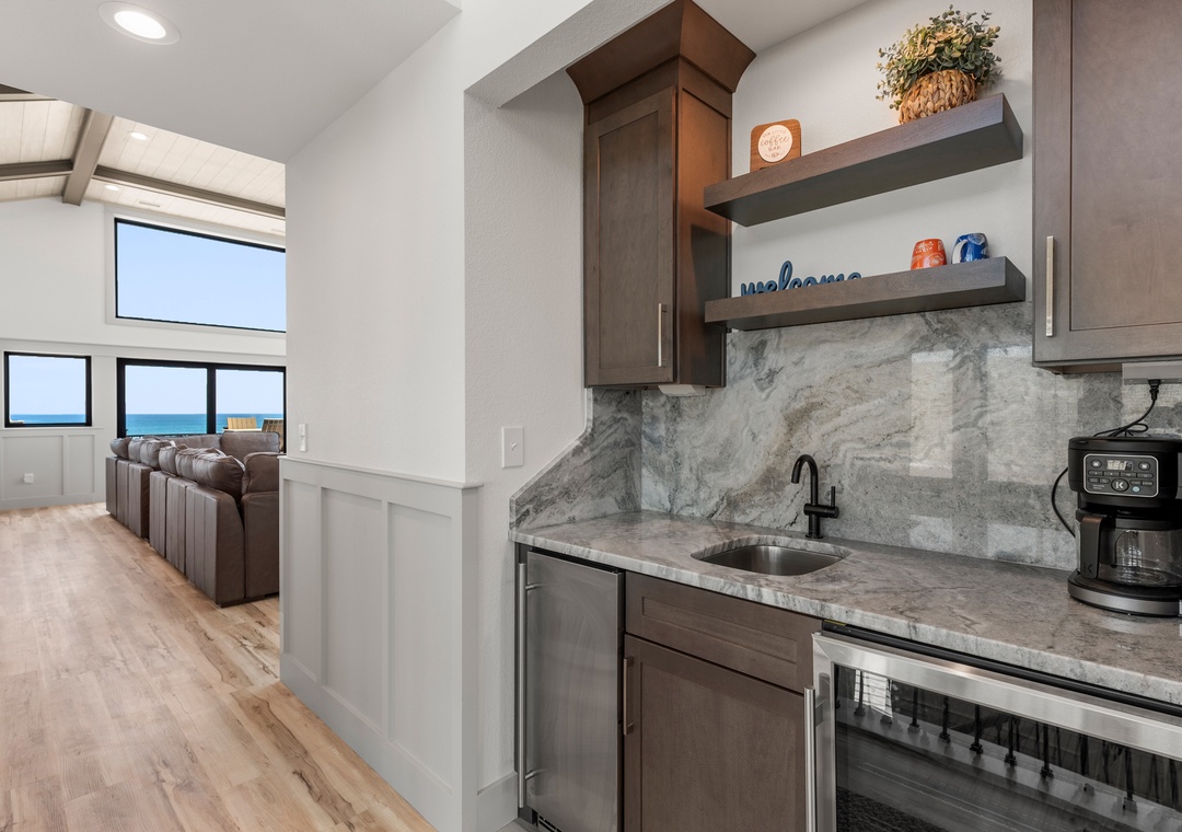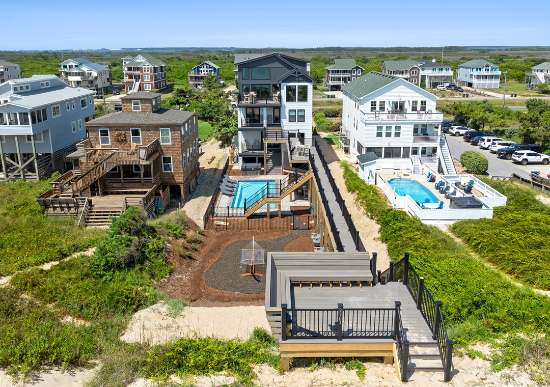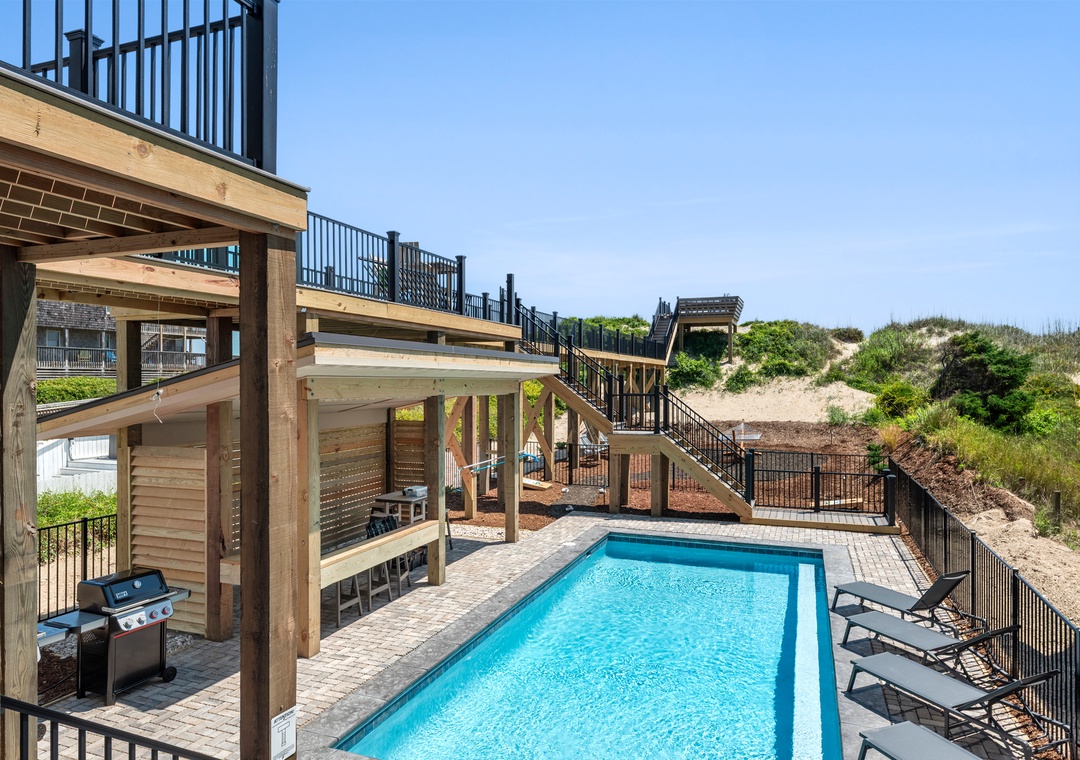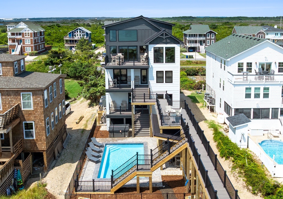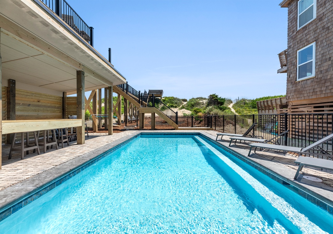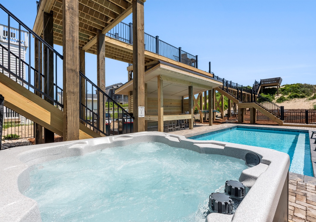On the mid-level you'll find five more ensuite bedrooms, two of which are ocean-facing with deck access, as well as a convenient coffee bar with mini fridge. Two more bedrooms are located downstairs, along with a rec room that can serve as an additional hangout space. Between the shuffleboard table, bumper pool and arcade game, everyone in your group can flex their skills or discover a talent they never knew they had. The ground level kitchenette is equipped with a full-size fridge for storing extra groceries, refilling your drink without having to go upstairs, or grabbing a snack to enjoy poolside. The fabulous backyard oasis is located just outside the rec room and features a stunning 30' x 14' private pool and cabana. After a refreshing dip in the pool, make your way into the bubbly hot tub for a soak!