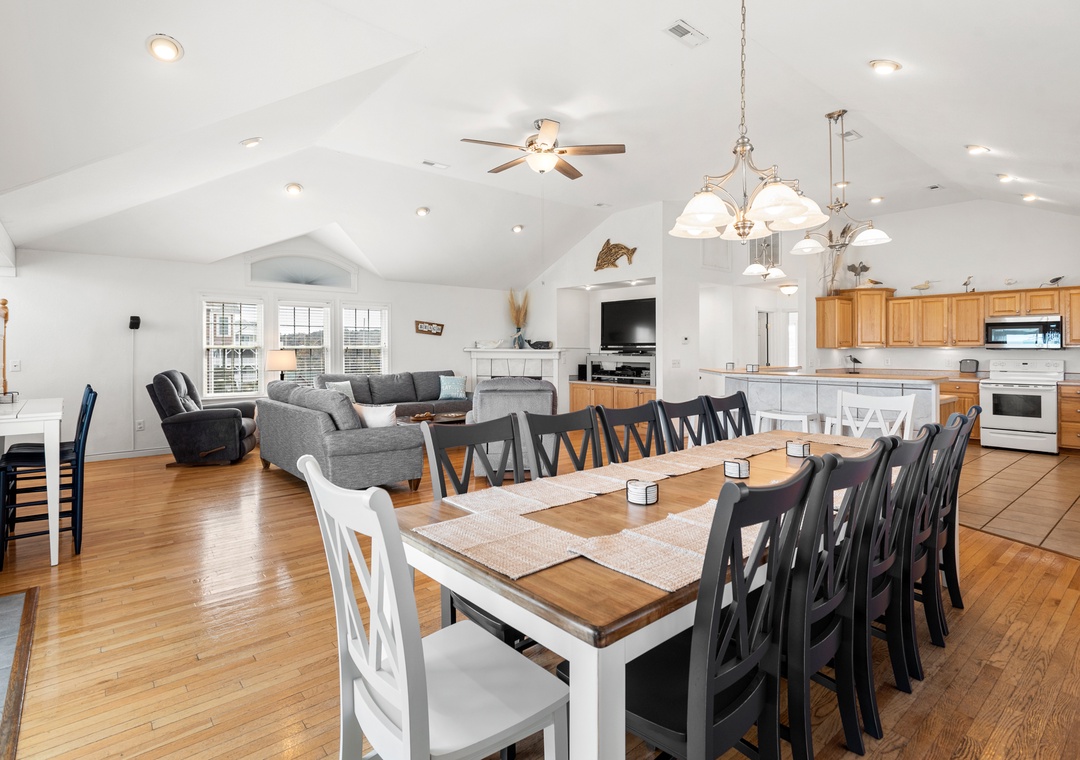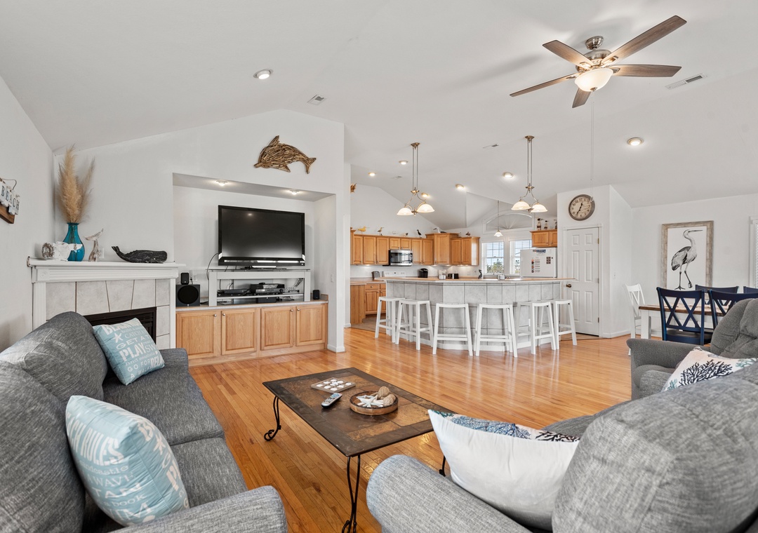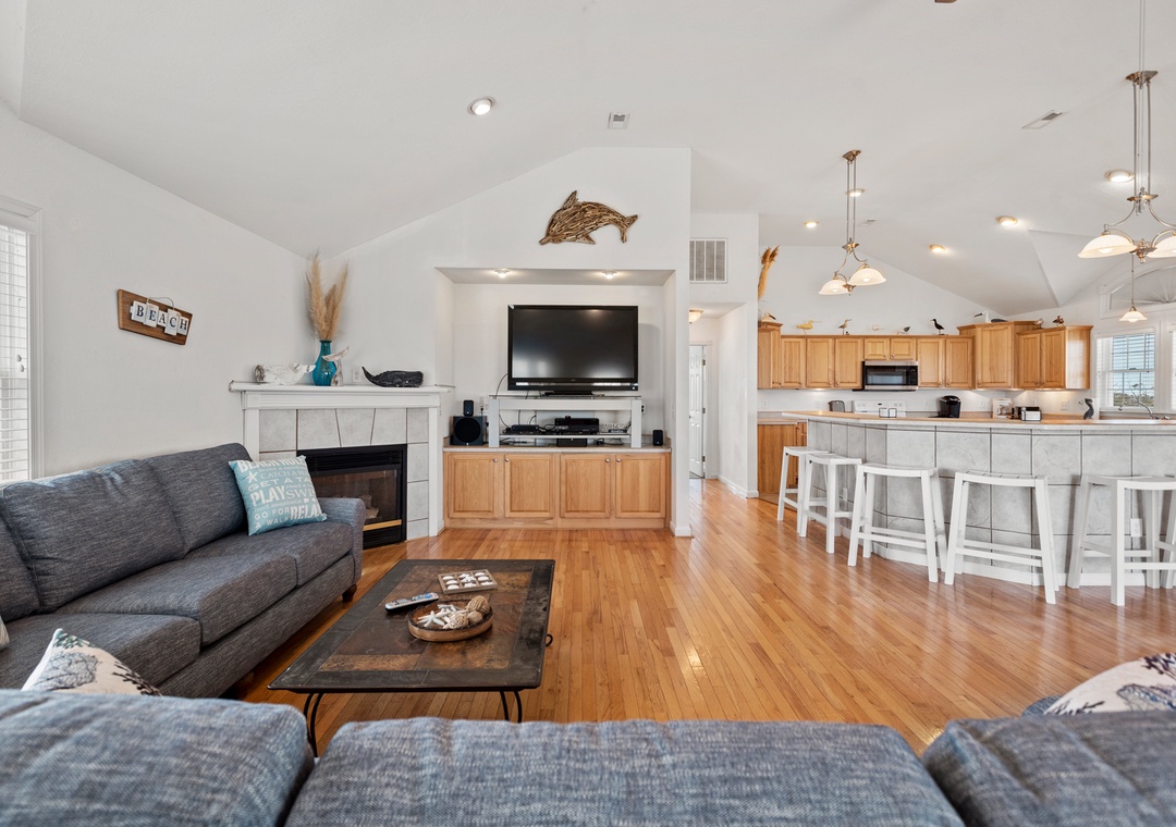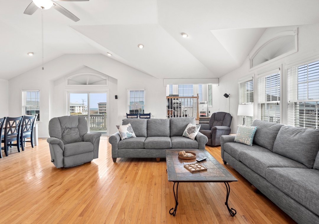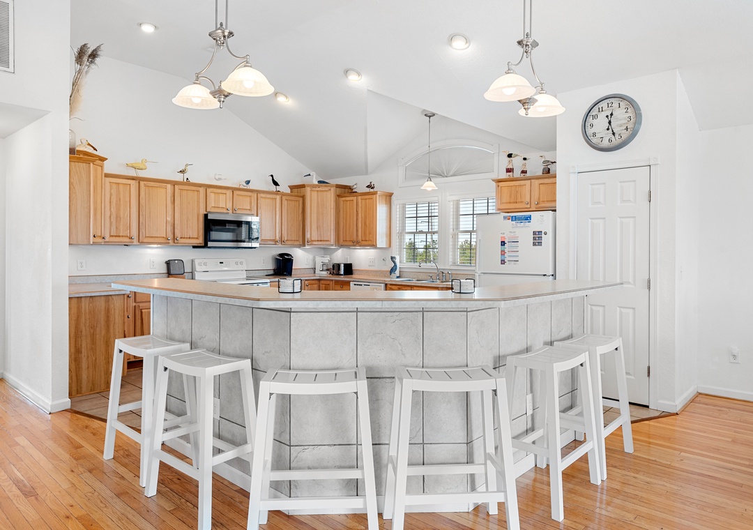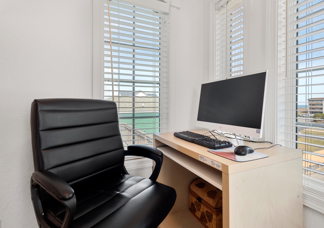 The spacious great room boasts vaulted ceilings and hardwood floors throughout, with an open-concept layout encouraging quality time spent together. When you're not eating out, a dining table for 12 and bar seating at the kitchen for six more allow everyone to enjoy meals together. A sun deck is located directly off the great room for effortless indoor/outdoor living, offering a fantastic view of the ocean. The loft space is set up as an office with complimentary high speed internet, which can be used for remote work or school. All TV's throughout the home provide both streaming capabilities and local cable channels.