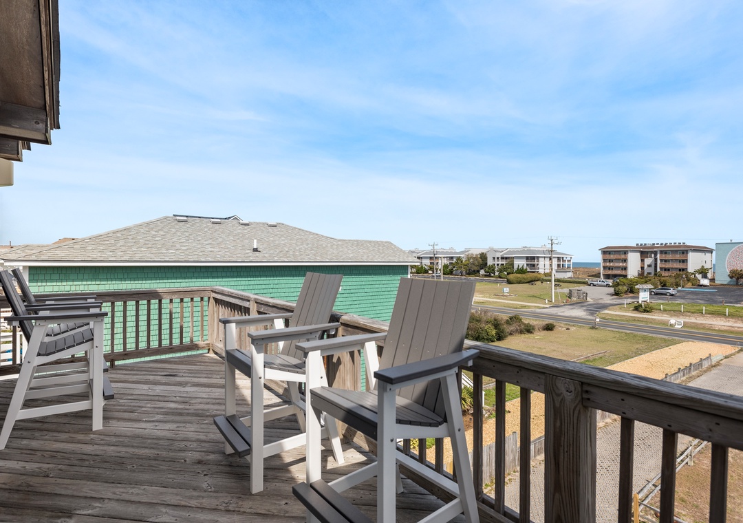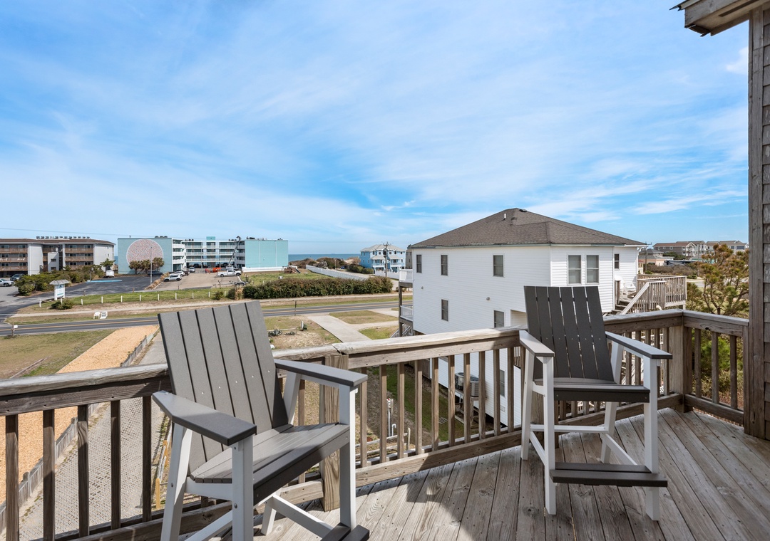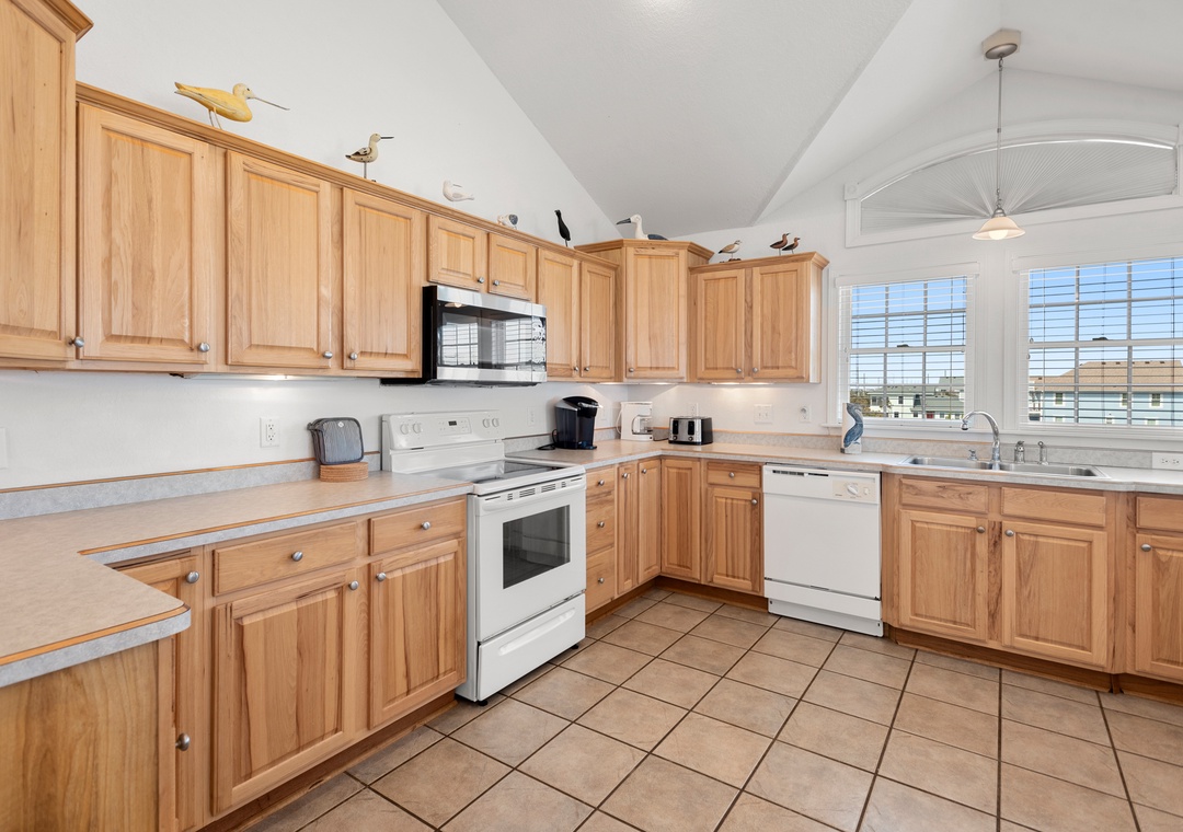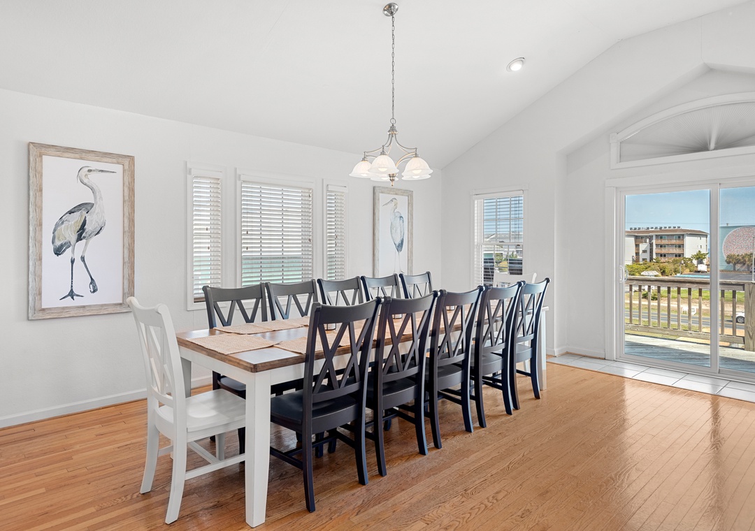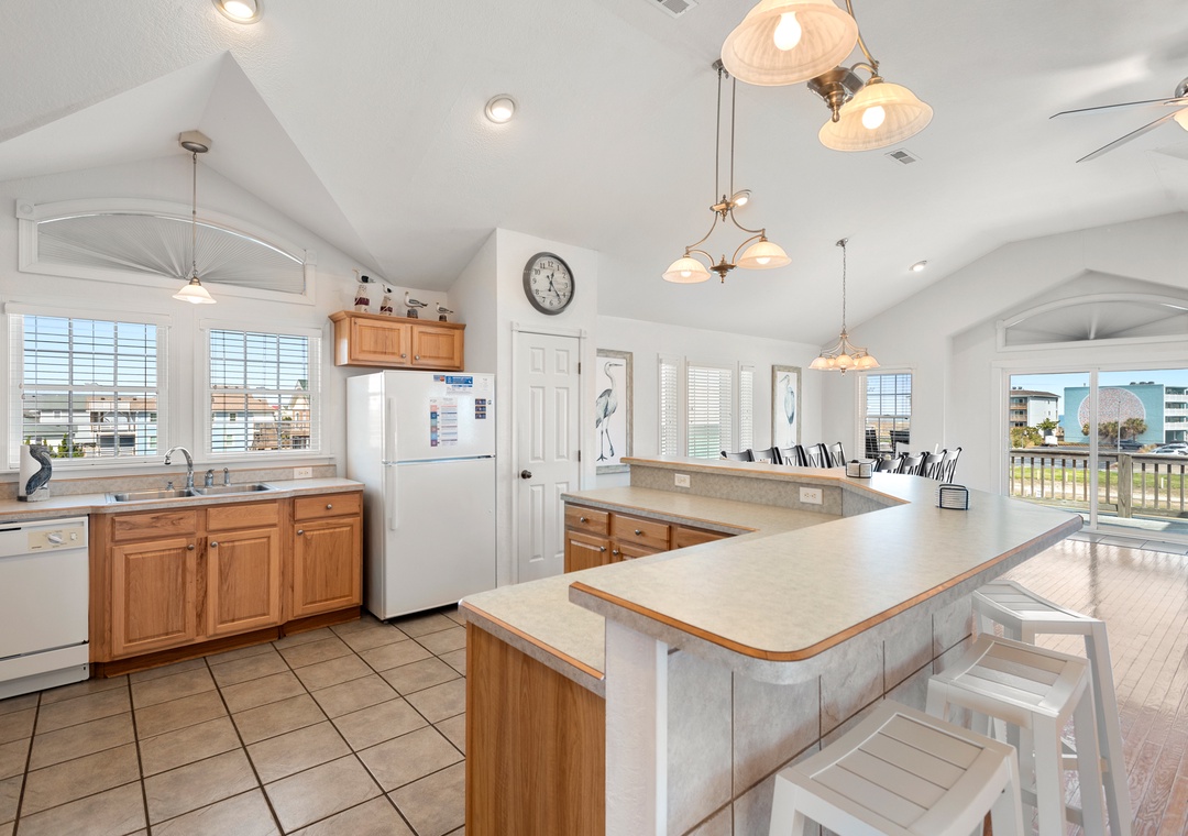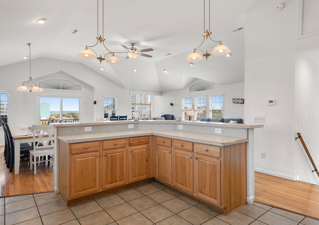 The spacious great room boasts vaulted ceilings and hardwood floors throughout, with an open-concept layout encouraging quality time spent together. When you're not eating out, a dining table for 12 and bar seating at the kitchen for six more allow everyone to enjoy meals together. A sun deck is located directly off the great room for effortless indoor/outdoor living, offering a fantastic view of the ocean. The loft space is set up as an office with complimentary high speed internet, which can be used for remote work or school. All TV's throughout the home provide both streaming capabilities and local cable channels.