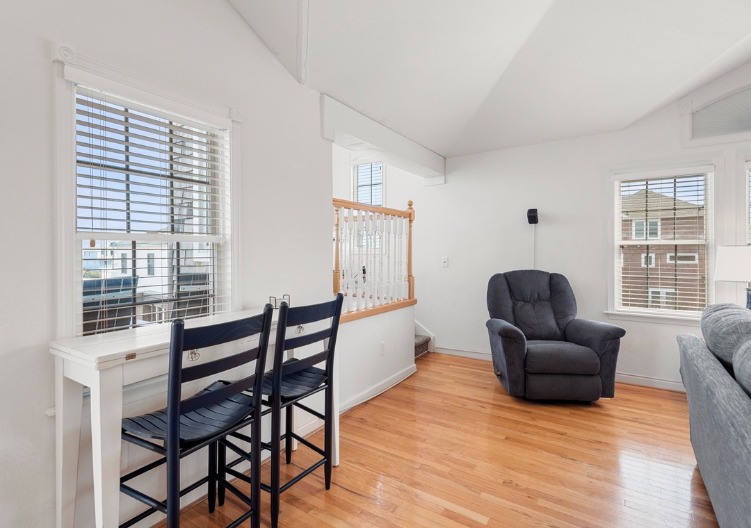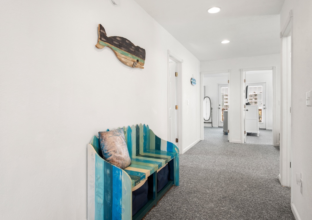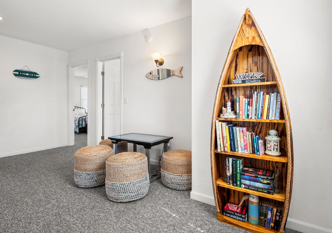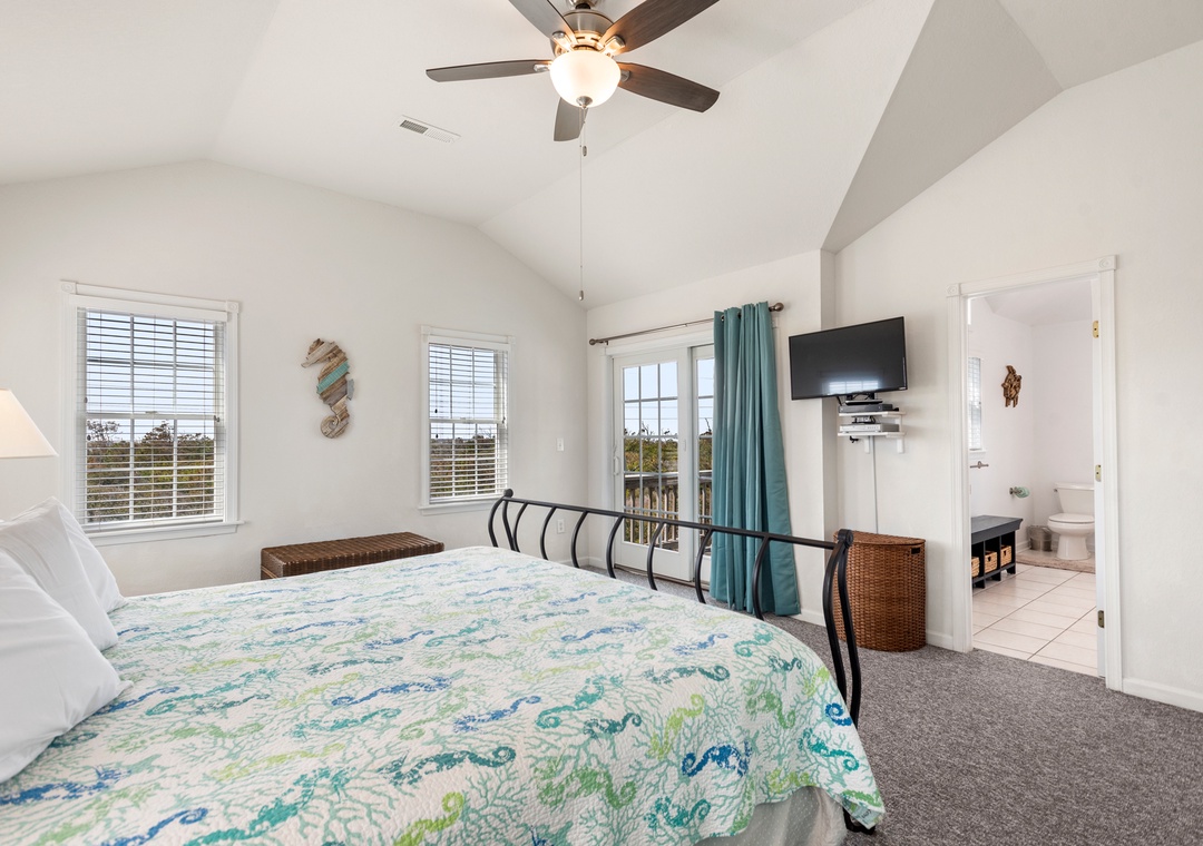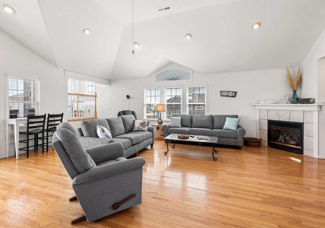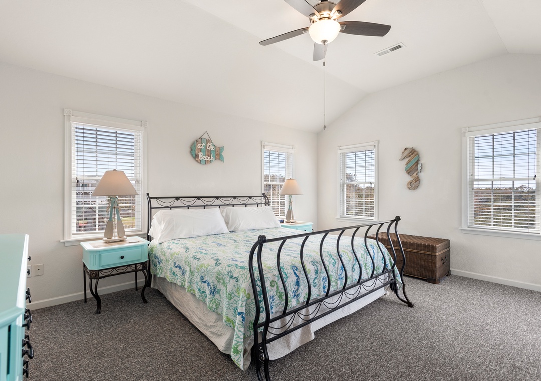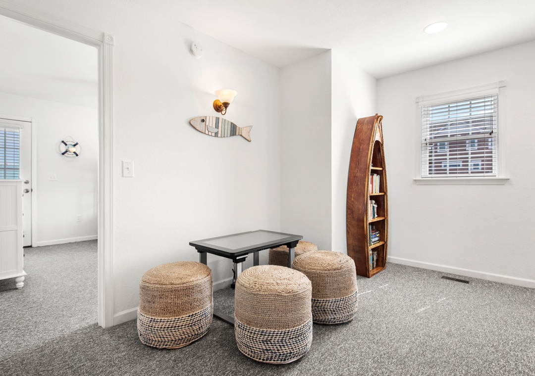 The spacious great room boasts vaulted ceilings and hardwood floors throughout, with an open-concept layout encouraging quality time spent together. When you're not eating out, a dining table for 12 and bar seating at the kitchen for six more allow everyone to enjoy meals together. A sun deck is located directly off the great room for effortless indoor/outdoor living, offering a fantastic view of the ocean. The loft space is set up as an office with complimentary high speed internet, which can be used for remote work or school. All TV's throughout the home provide both streaming capabilities and local cable channels.