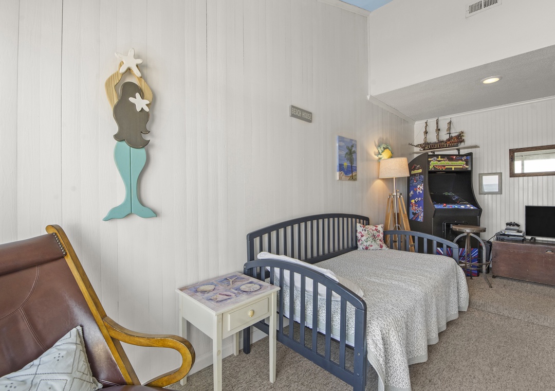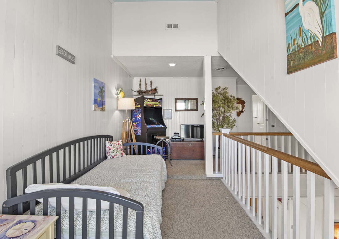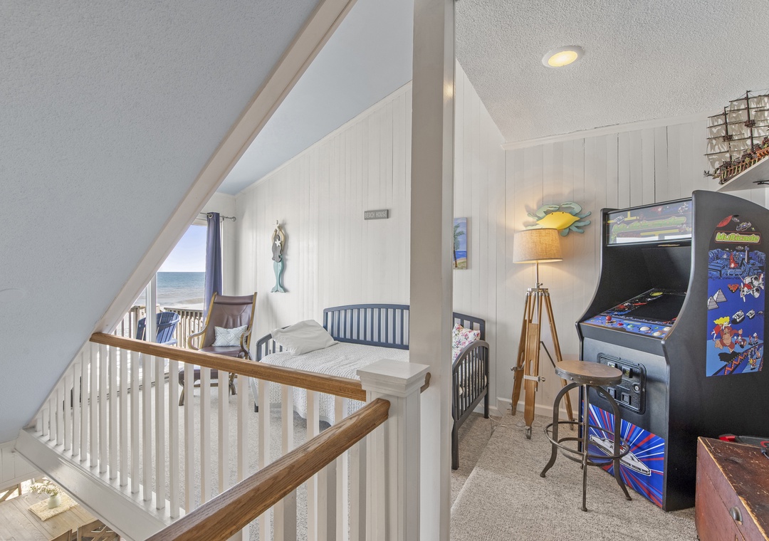 On the top level, enjoy a peaceful king bedroom and a charming room with a full-size bed. Need extra sleeping space? The loft area includes a comfy daybed—great for kids or extra guests. And for a bit of nostalgic fun, challenge your crew to a game on the classic video arcade machine!