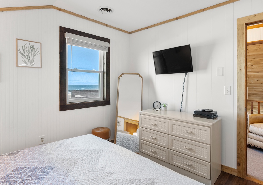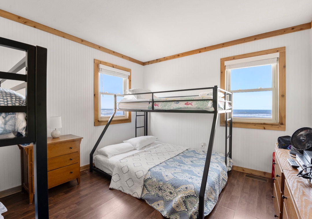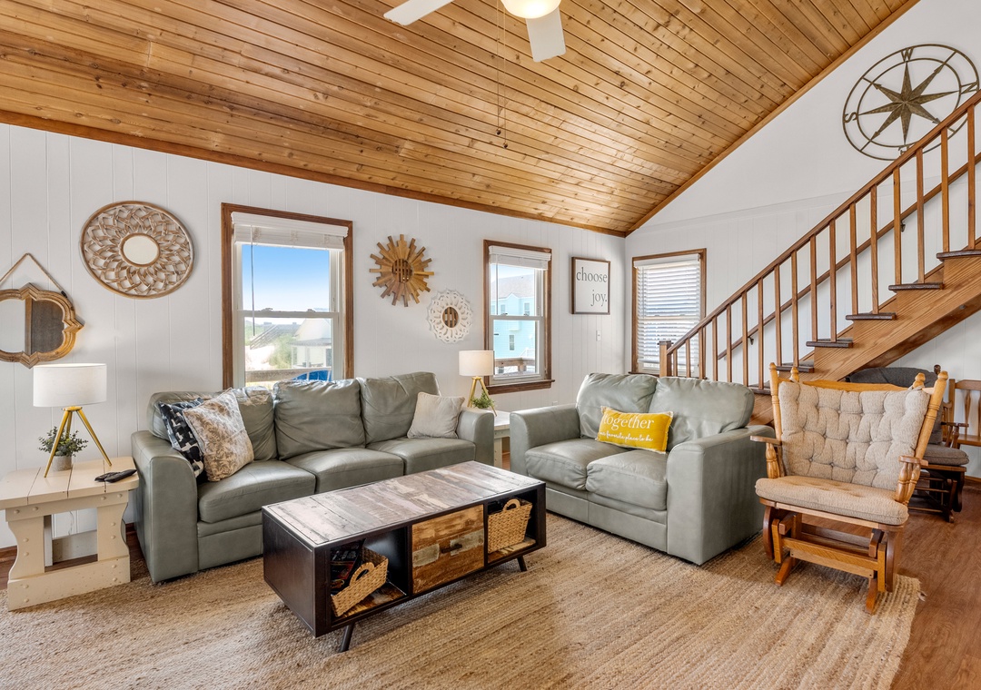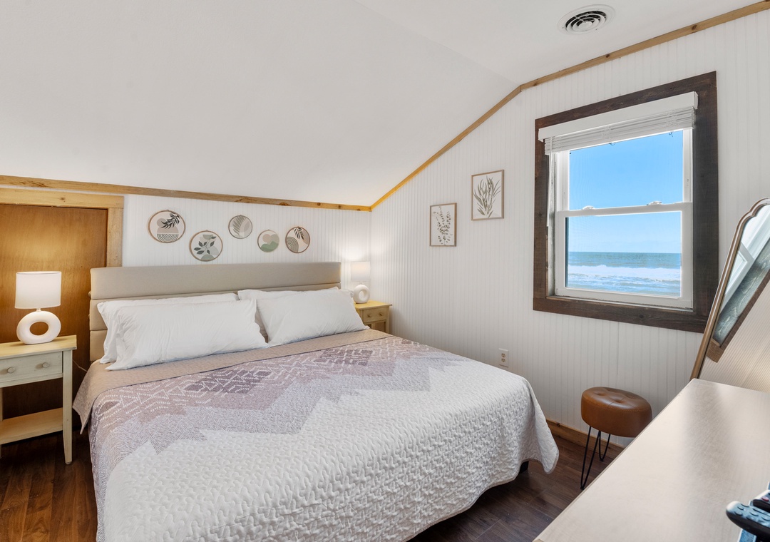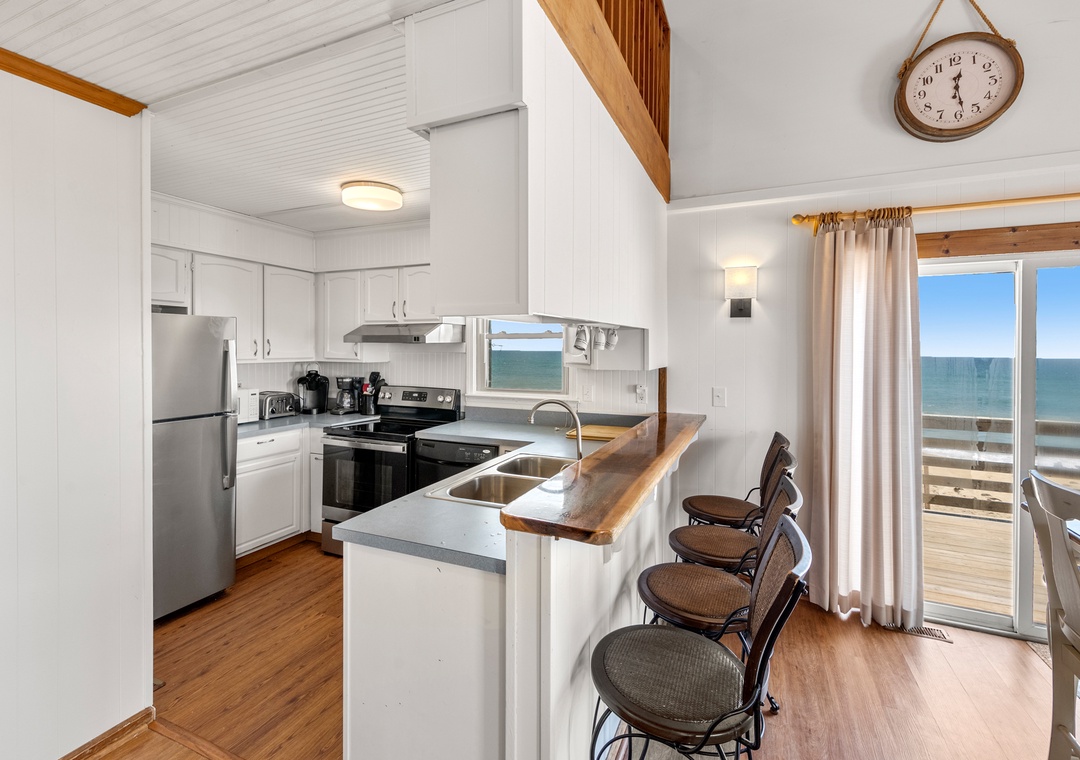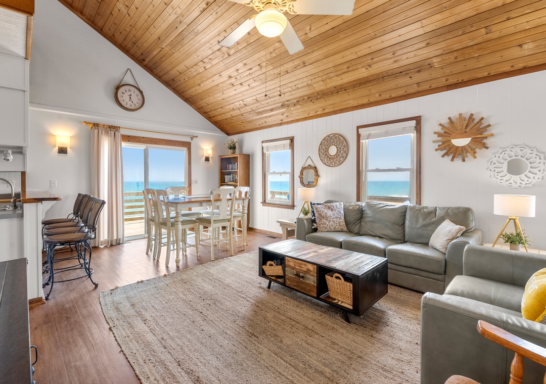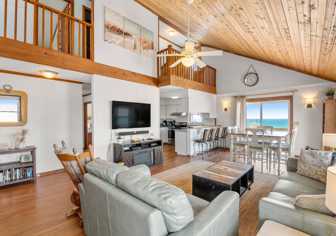 The open-concept layout on the main level takes full advantage of the home's prime location. Enjoy direct ocean views from all the common spaces of the home, even while preparing meals in the kitchen. Beach-friendly LVP flooring is installed throughout, ideal for kids and pets. Thoughtfully decorated with original artwork and eclectic accents, Torchsong is brimming with character while still providing all the comforts of home.