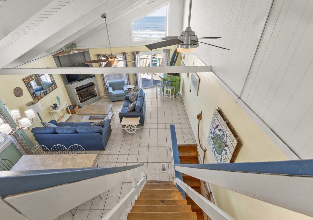 Upstairs, the open concept living, dining, and kitchen area is bright and welcoming, with easy access to the deck for al fresco dining or sunset watching. A full bathroom is located on this level and tucked away above is a cozy loft with a queen bed, perfect for a quiet retreat or extra sleeping space.