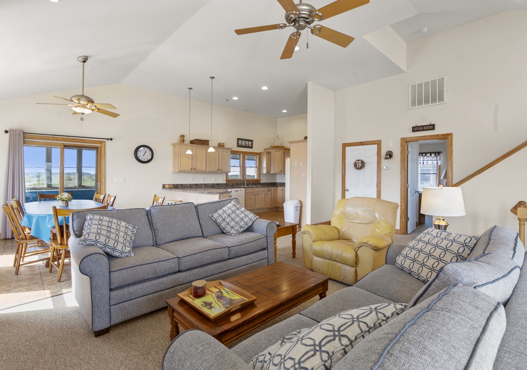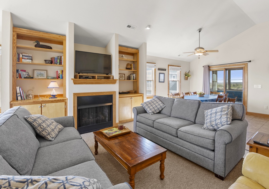 Upstairs, the living room welcomes you with vaulted ceilings, a cozy gas fireplace, and a treasure trove of entertainment including a Smart TV, video library, books, and games. The dining area seats eight, and the kitchen bar adds three more spots for morning coffee or evening cocktails. Another queen master suite awaits with private bath and deck access, and the screened porch is perfect for breezy meals at the picnic table.