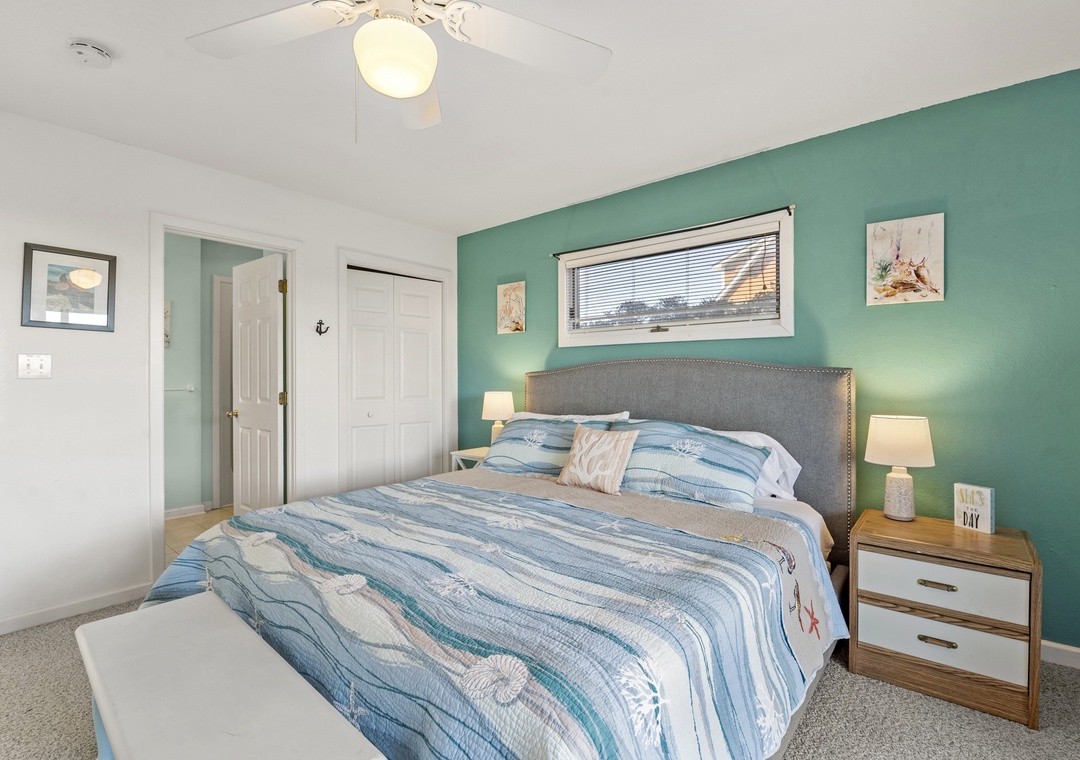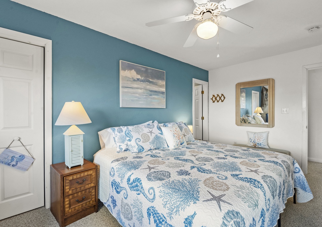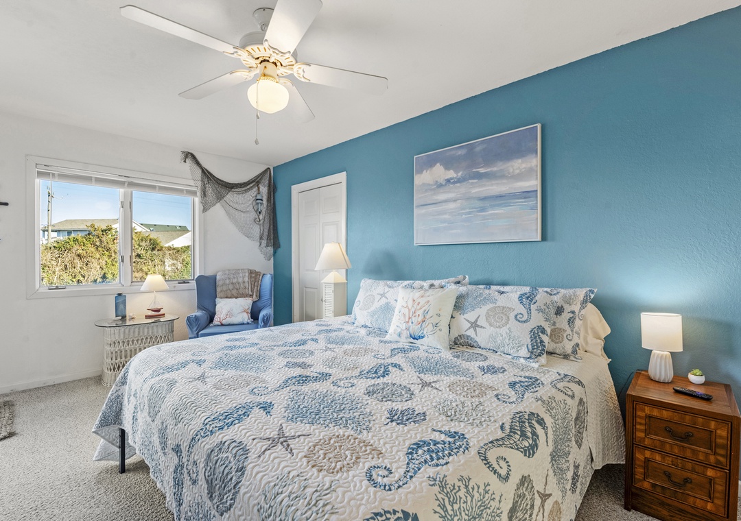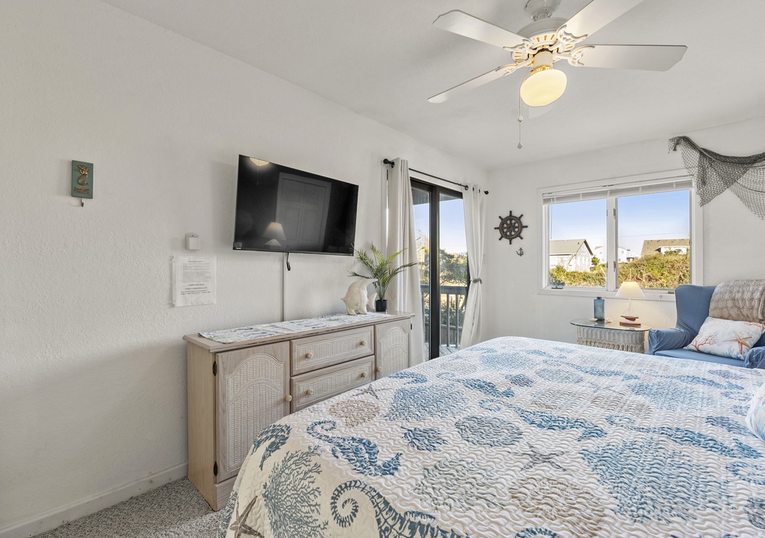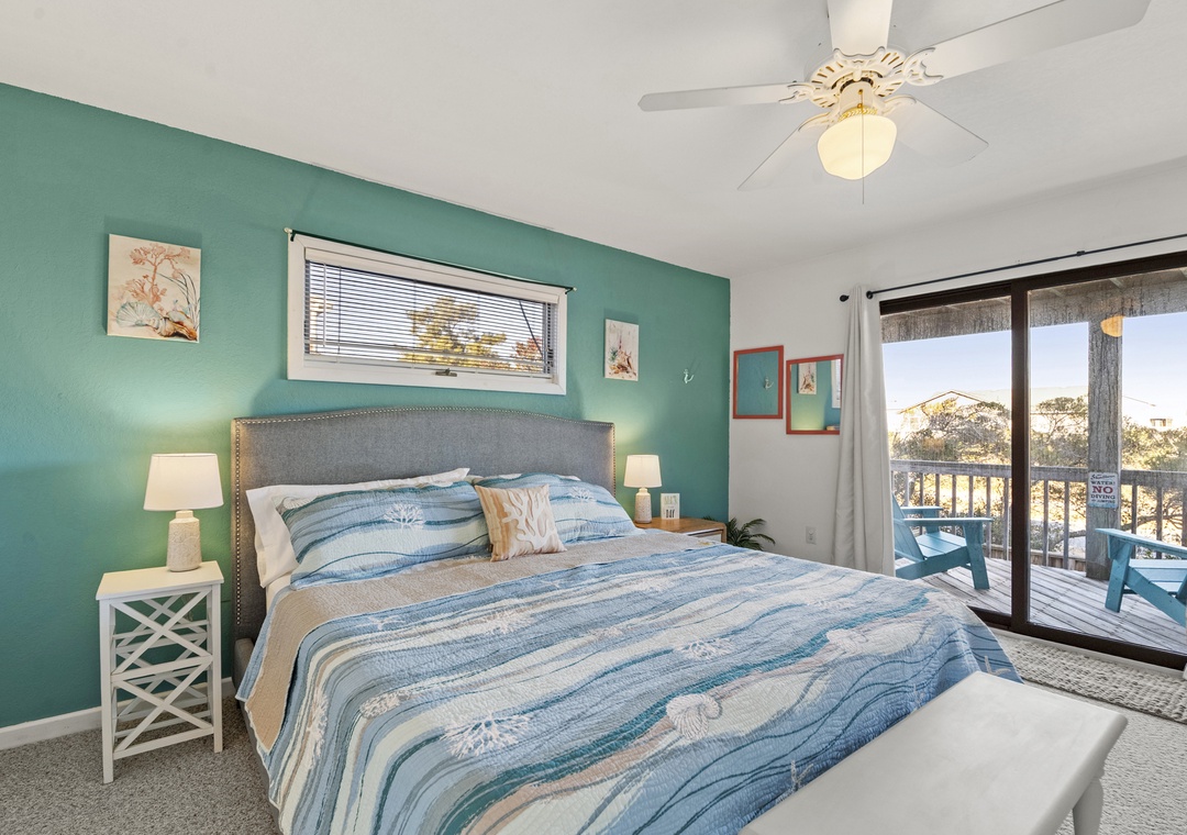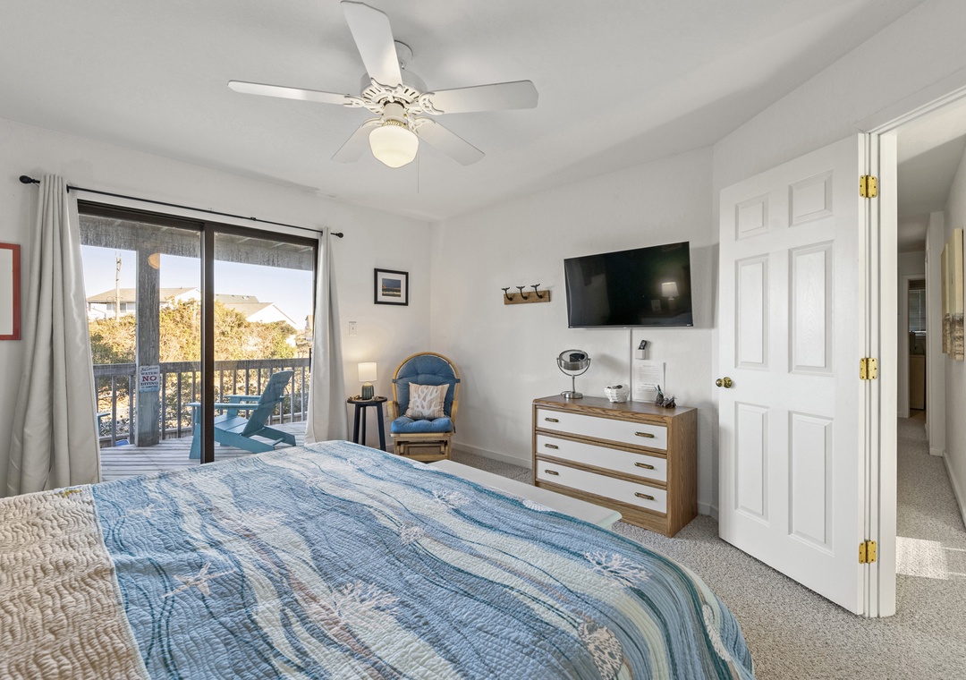 On the top level, you’ll discover the heart of the home with a bright and open kitchen, a comfortable living room, and a half bath. The primary bedroom suite is located here, offering a luxurious king bed and a bathroom for ultimate relaxation.