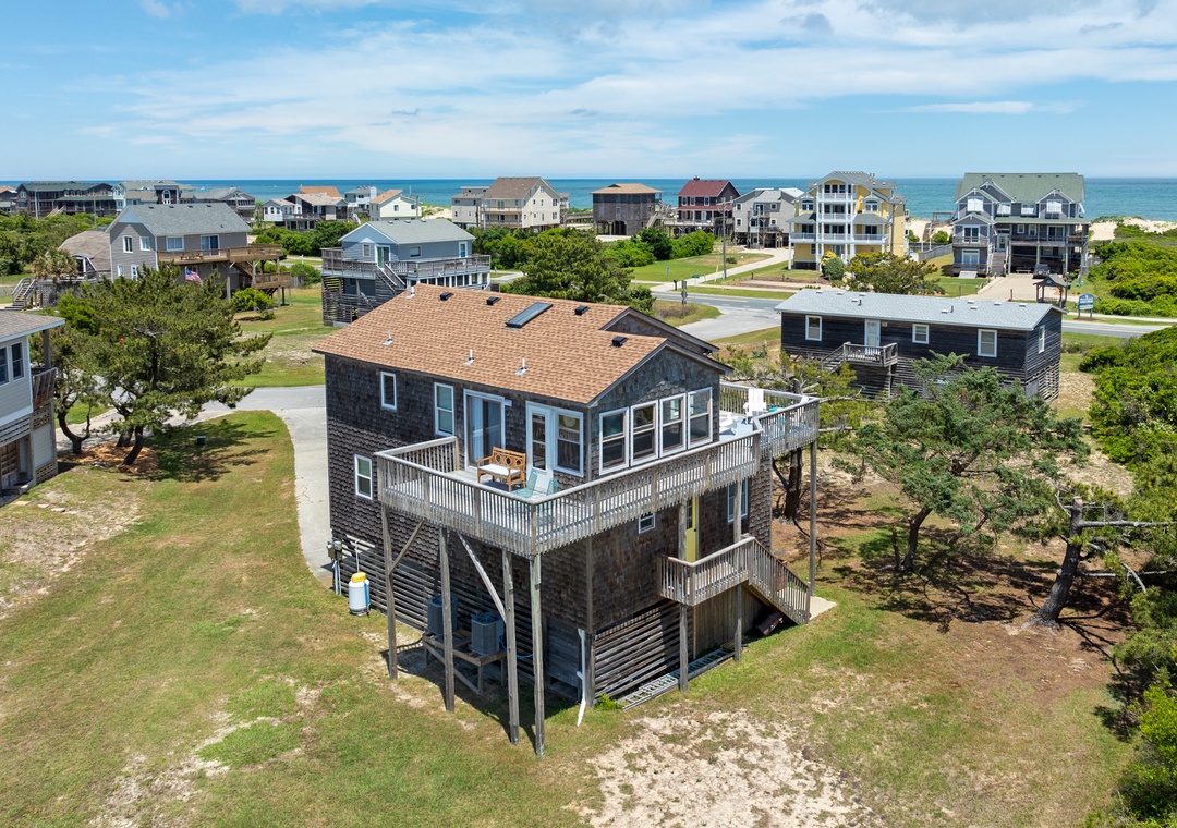 There's something good waiting down this road! Drive south down Old Oregon Inlet where you'll find Runnin' Down A Dream, a charming and dog-friendly beach cottage that offers an unbeatable location for your next Outer Banks vacation. Runnin' Down A Dream is the southernmost home in Nags Head, situated in the all-residential Colony South subdivision and backing up onto National Park Service land for ultimate seclusion and natural surroundings. A reverse floorplan means you'll enjoy views of the ocean, sound, marsh and spectacular sunsets from the top-level great room. Original pine paneling preserves the warmth and coastal character of this classic Nags Head style home, while the open-concept layout makes the space feel bright, airy and ideal for gathering. In addition to a sunroom for indoor/outdoor living, two levels of wrap-around decks provide plenty of room for soaking up the Vitamin D, relaxing in the shade, or simply breathing in the salty ocean air. With a a public beach access located five hundred feet from the house, you'll be just a two-minute walk to the sparkling Atlantic. Dogs are welcome at Runnin' Down a Dream, so your canine companions can join you on the pet-friendly beaches of Nags Head. Your furry friends will also love running around in the expansive yard without having to worry about traffic. If you're in the mood for some outdoor adventure, hop in the car and take a short drive to Coquina beach, a hidden gem that's a local's favorite spot for fishing and surfing. From there, explore Bodie Island Lighthouse or head south for a day trip to Ocracoke.