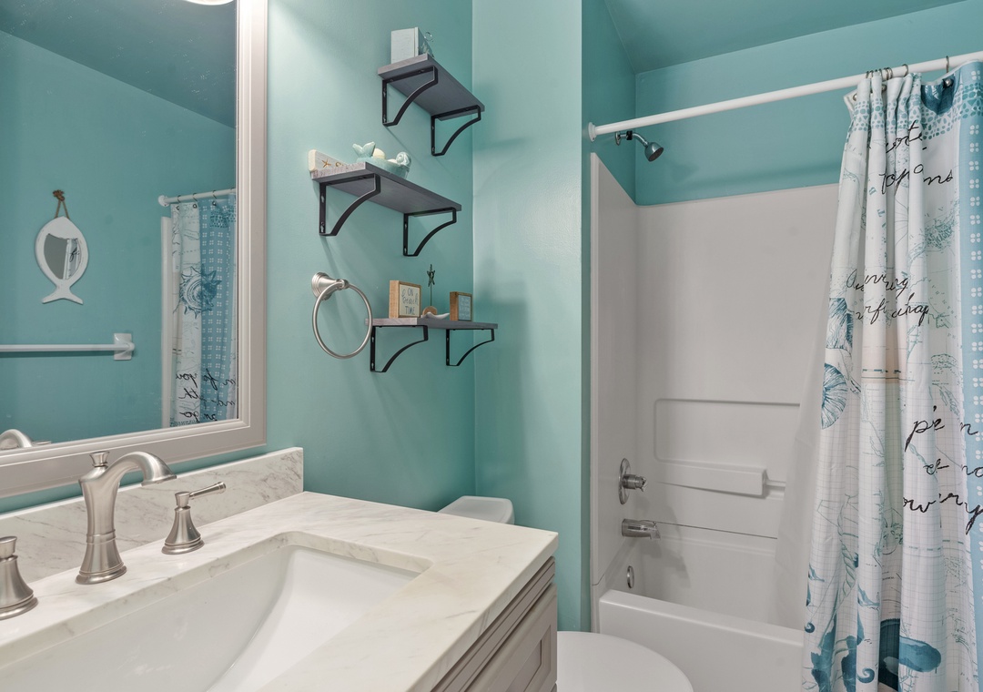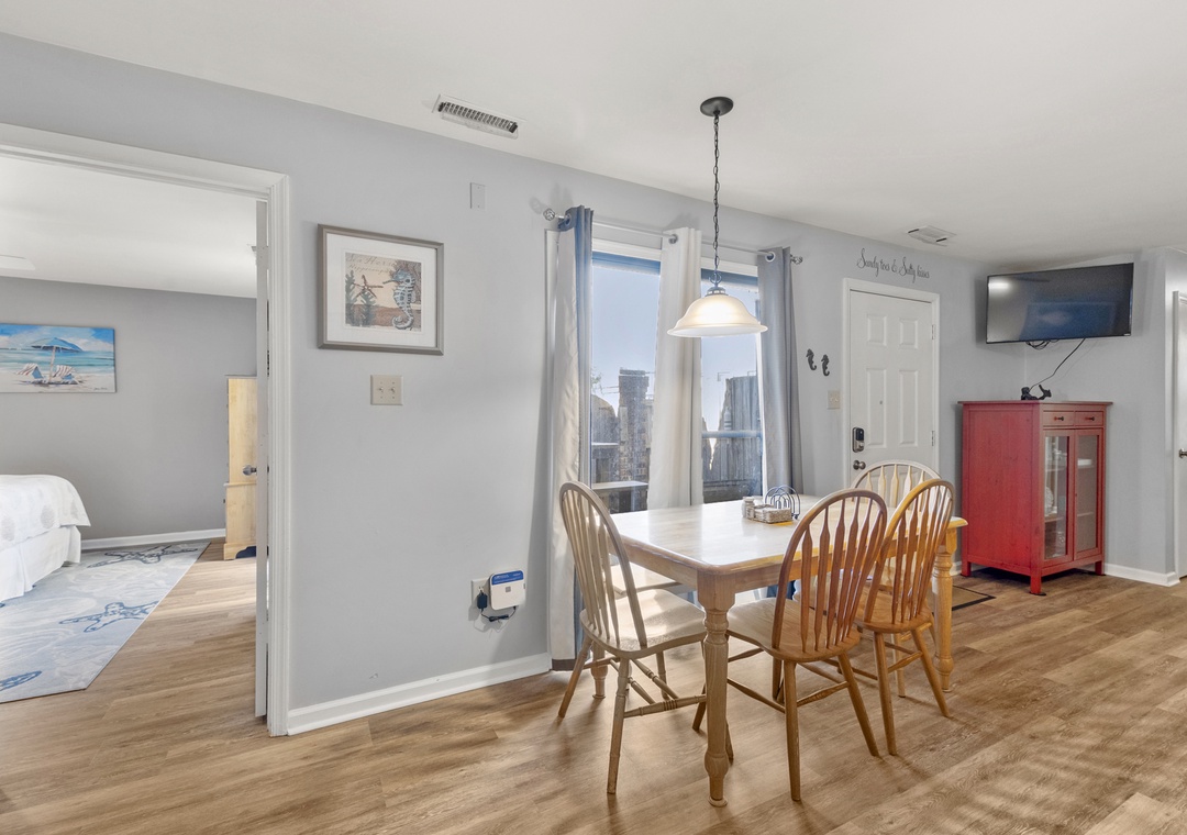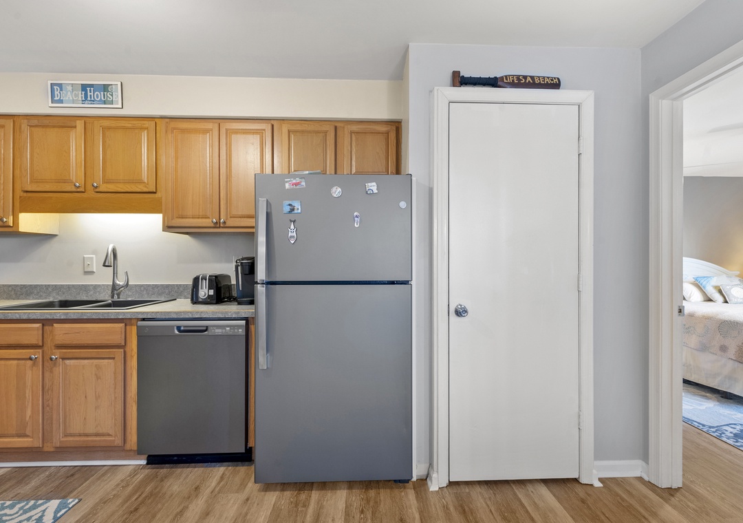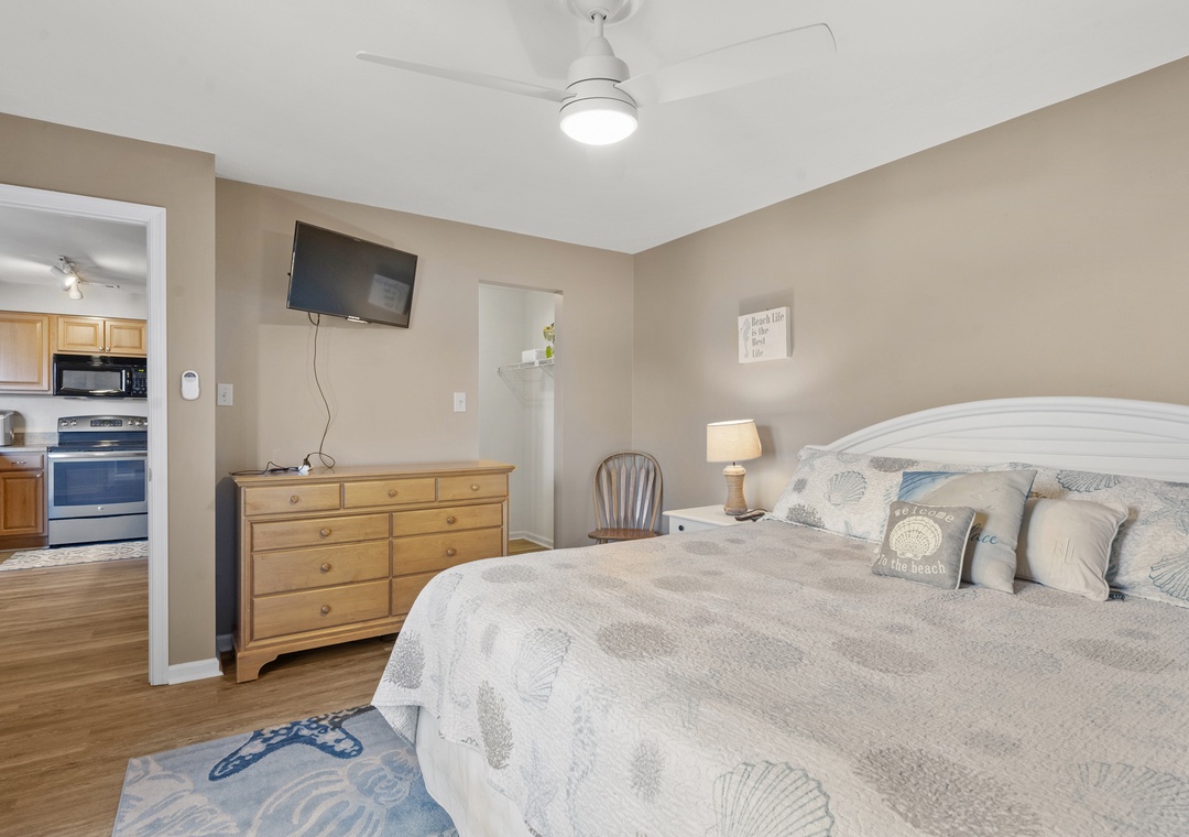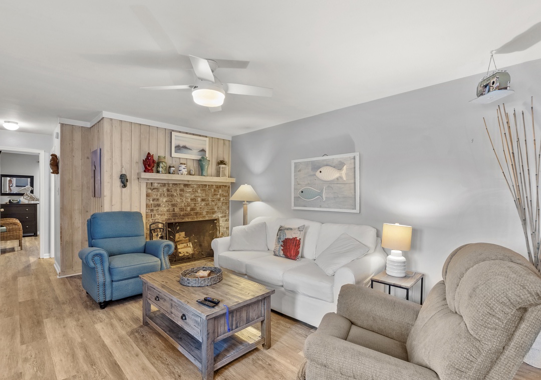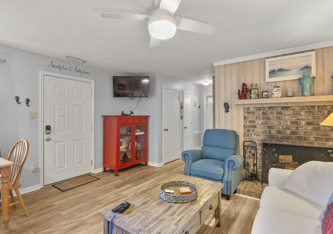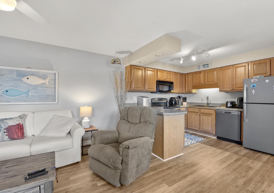 The open-concept living area invites relaxation with a cozy couch and recliner, while the fully equipped kitchen makes meal prep a breeze. Whether you're enjoying a quiet morning coffee or winding down after a day at the beach, this condo offers the perfect blend of convenience and comfort.