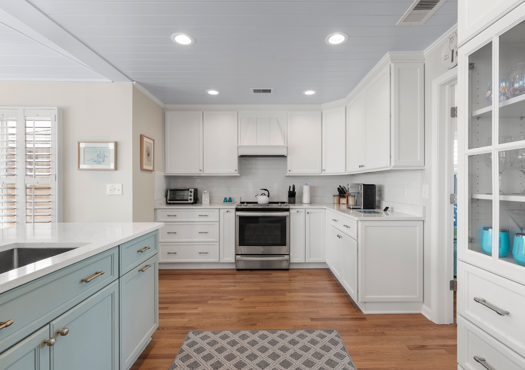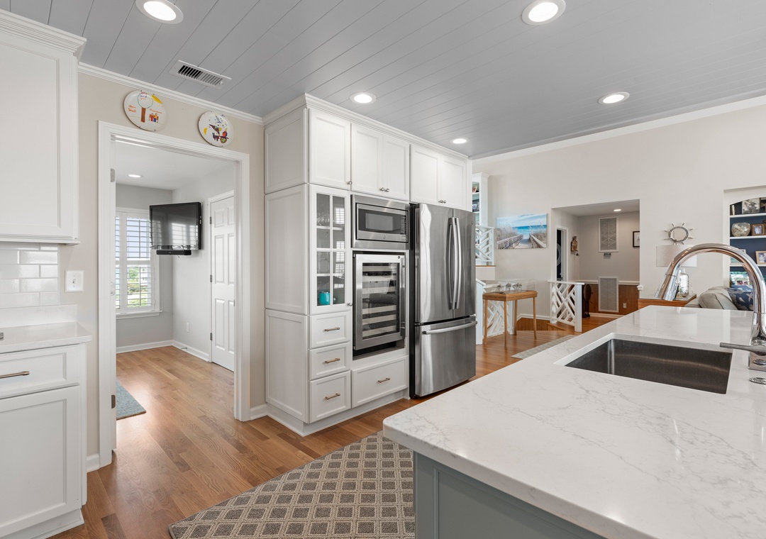 The modern kitchen is well equipped with a wine refrigerator, Keurig coffee maker, blender, mixer, toaster oven, microwave, modern and deep sink, very large seafood boing pot, crab picking tools, and so much more. Also in the kitchen by the Keurig is a charging docking station for your multiple charging needs.
