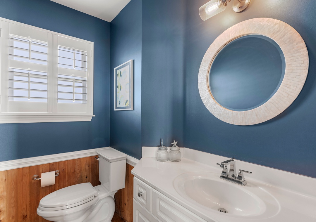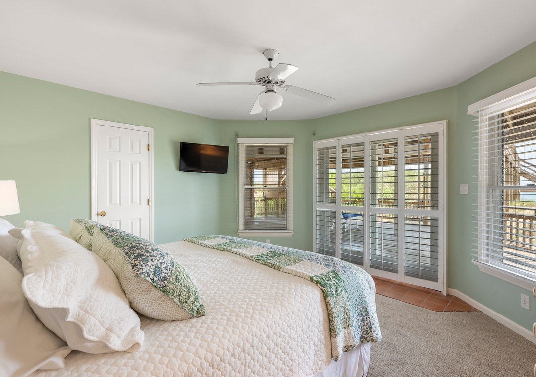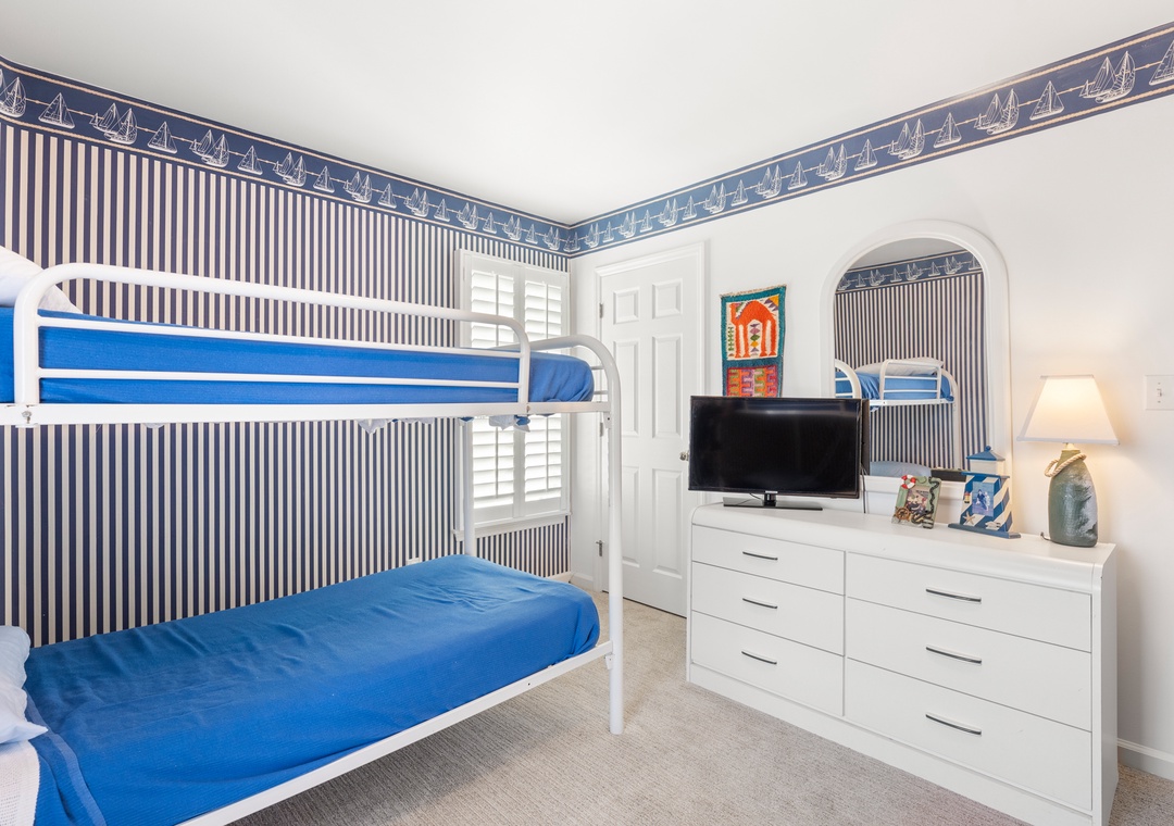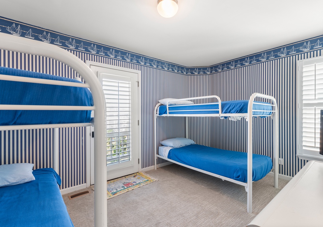 All five bedrooms have their own access to the deck connected to the private, dedicate walkway leading straight to the beach so guests can enjoy the convenience of direct access to the shore. Every bedroom has a smart TV with Roku (don’t forget your streaming passwords). The master ensuite bedroom on the main level has a king bed, dual sink bathroom and shower with two shower heads. The level below has an ensuite bedroom with a king bed and bathroom with a shower/supersized tub. This level also has another ensuite bedroom with a queen bed. The third bedroom on this level has a queen bed and shares a bathroom with the fourth bedroom, “the kids room” which has 4 beds – 2 bunkbeds. The shared bathroom has a sink area and a pull door to separate the toilet/shower space. The bunk beds have side rails for the top bunks and a ladder for each top bunk and there is a baby gate (in the closet) and a pack-n-play.