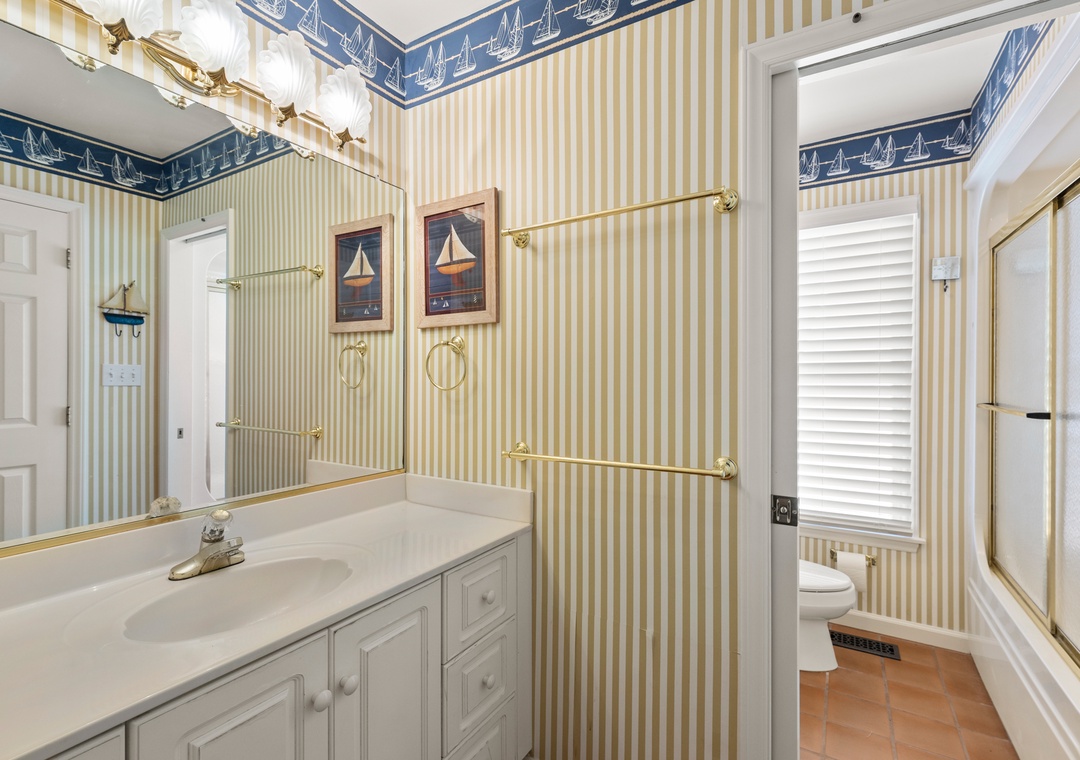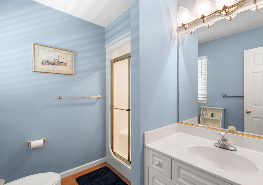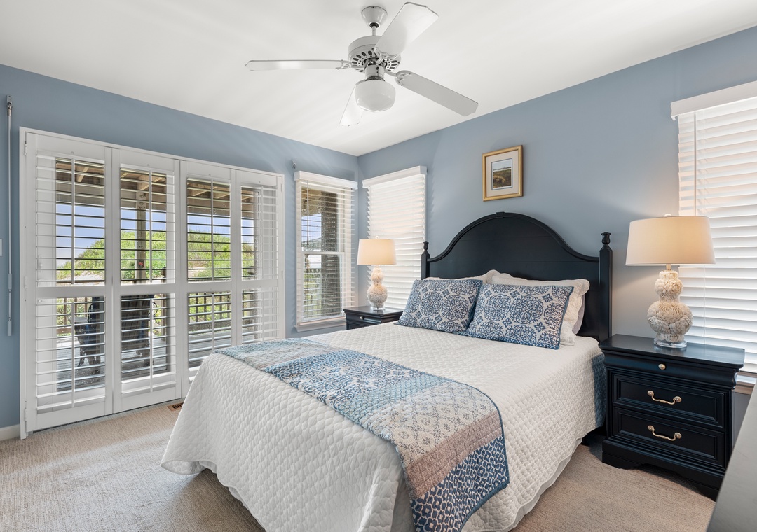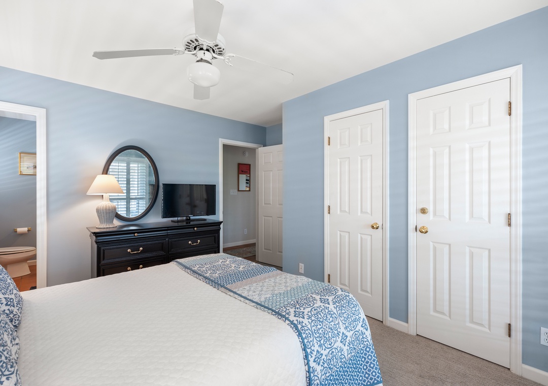 All five bedrooms have their own access to the deck connected to the private, dedicate walkway leading straight to the beach so guests can enjoy the convenience of direct access to the shore. Every bedroom has a smart TV with Roku (don’t forget your streaming passwords). The master ensuite bedroom on the main level has a king bed, dual sink bathroom and shower with two shower heads. The level below has an ensuite bedroom with a king bed and bathroom with a shower/supersized tub. This level also has another ensuite bedroom with a queen bed. The third bedroom on this level has a queen bed and shares a bathroom with the fourth bedroom, “the kids room” which has 4 beds – 2 bunkbeds. The shared bathroom has a sink area and a pull door to separate the toilet/shower space. The bunk beds have side rails for the top bunks and a ladder for each top bunk and there is a baby gate (in the closet) and a pack-n-play.