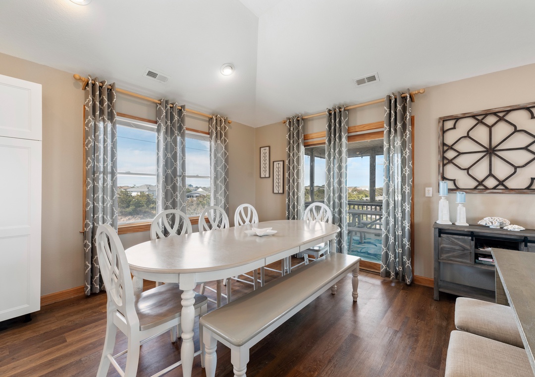 Value find of the year! This place was the perfect place to entertain family in and out over the week while entertaining several young kids. The beach access is closer than described and made multiple times with a 3 year old in tow. Seating for 8 at the dinning table and some great deck space. We could see the ocean from the living room. Hot tub was very clean and private. Great bedrooms and plenty of private bathrooms for a variety of stays. The house is on a very low trafficed road in a nice community but does back up to the highway so road noise was heard but never a nuisance even with Bike Week at the end of the week. Would use this place for family getaways, guys golf trips (half a mile to Nags Head Golf), bachelor bachelorette parties…WooCasa and Duck Donuts were right across the main highway so plenty to eat. This off peak week is perfect for us and the value we found made this an 11/10 stay for us.- Reviewed On: 4/29/2023