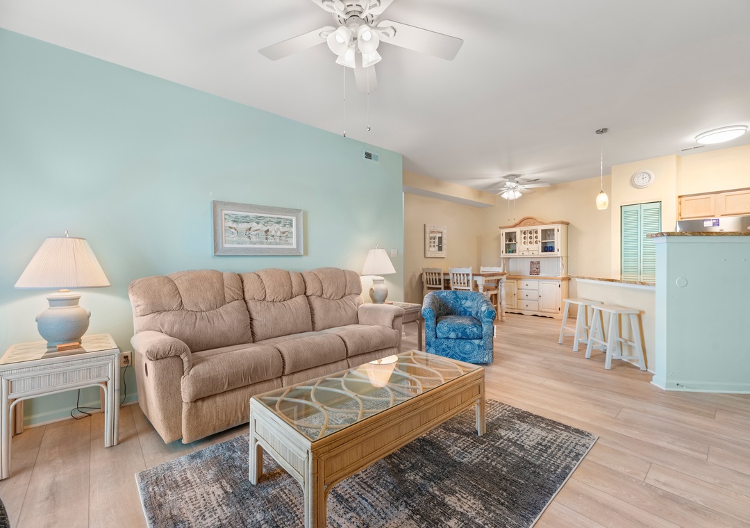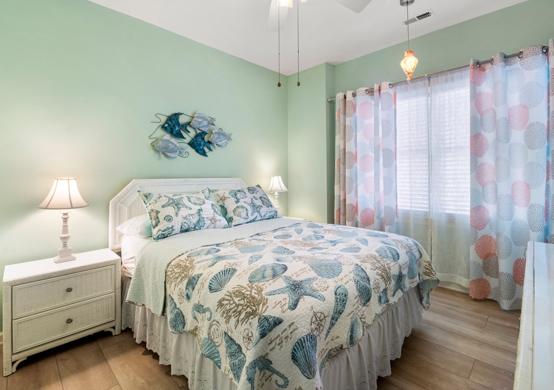 With two bedrooms and two full baths, Purple Shells Only is the perfect choice for small/intergenerational families or couples getaway who are interested in a truly relaxing vacation versus the stress of sharing a vacation with their closest 30 friends or family. The open-concept living area with 9' ceilings opens up onto a private covered balcony where you can relax in the shade while enjoying the salty ocean breeze, gorgeous sunsets, and a view of the pool. Guests will have access to the Sundune Village community amenities which include an outdoor pool, picnic area with grills, and gazebo.