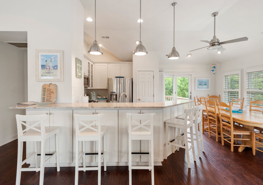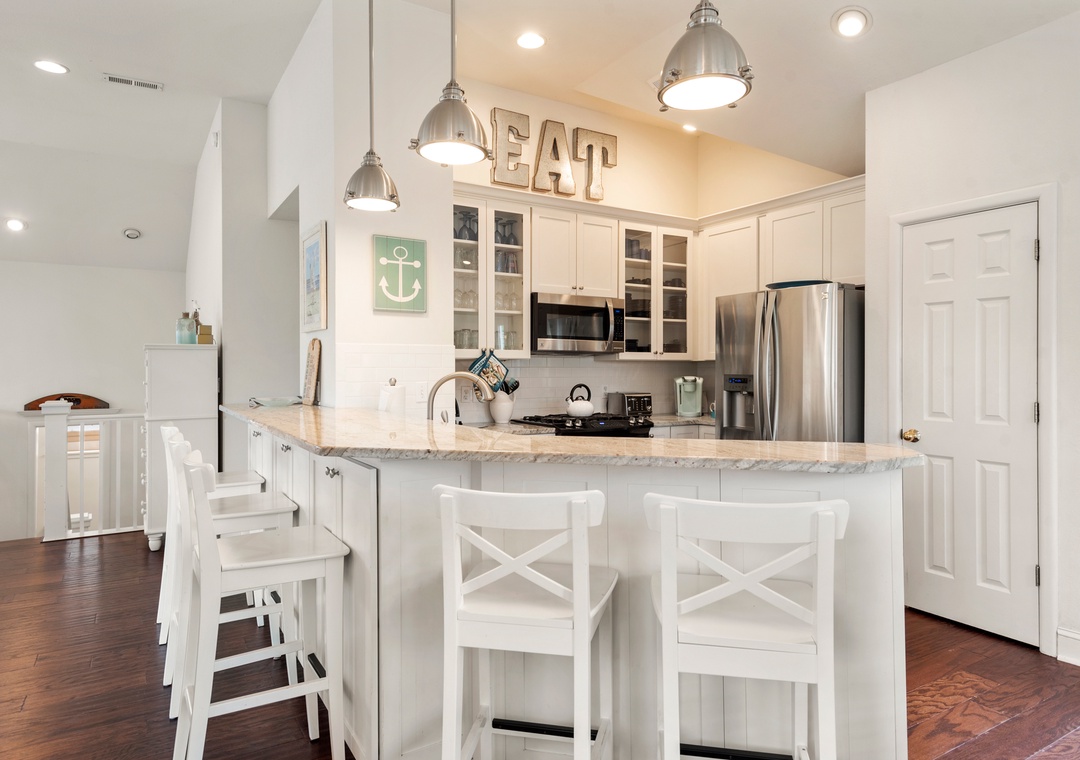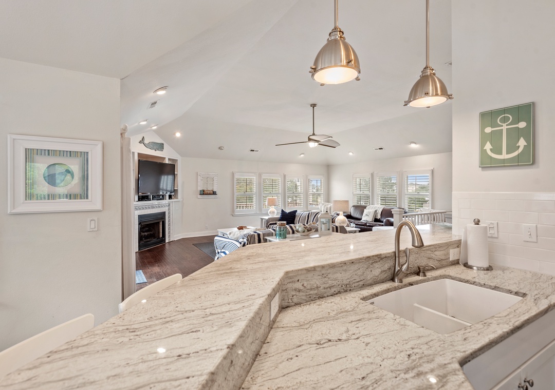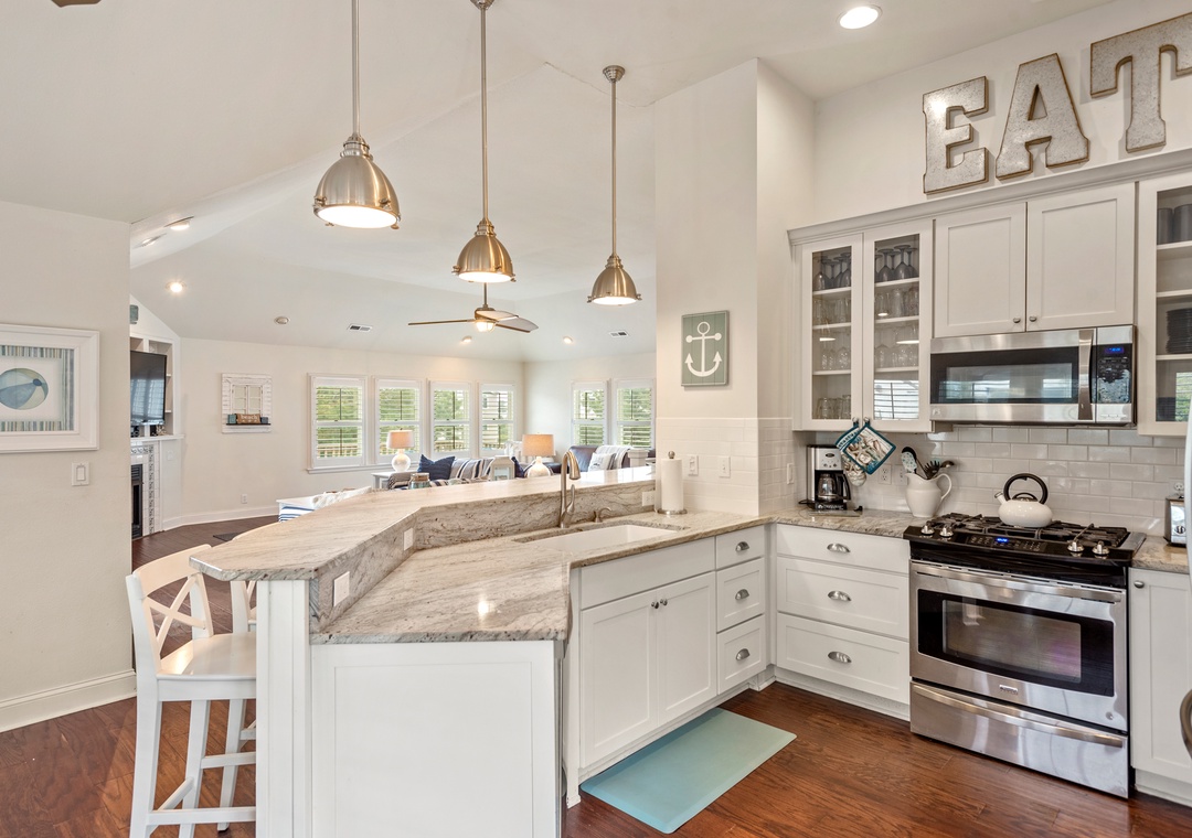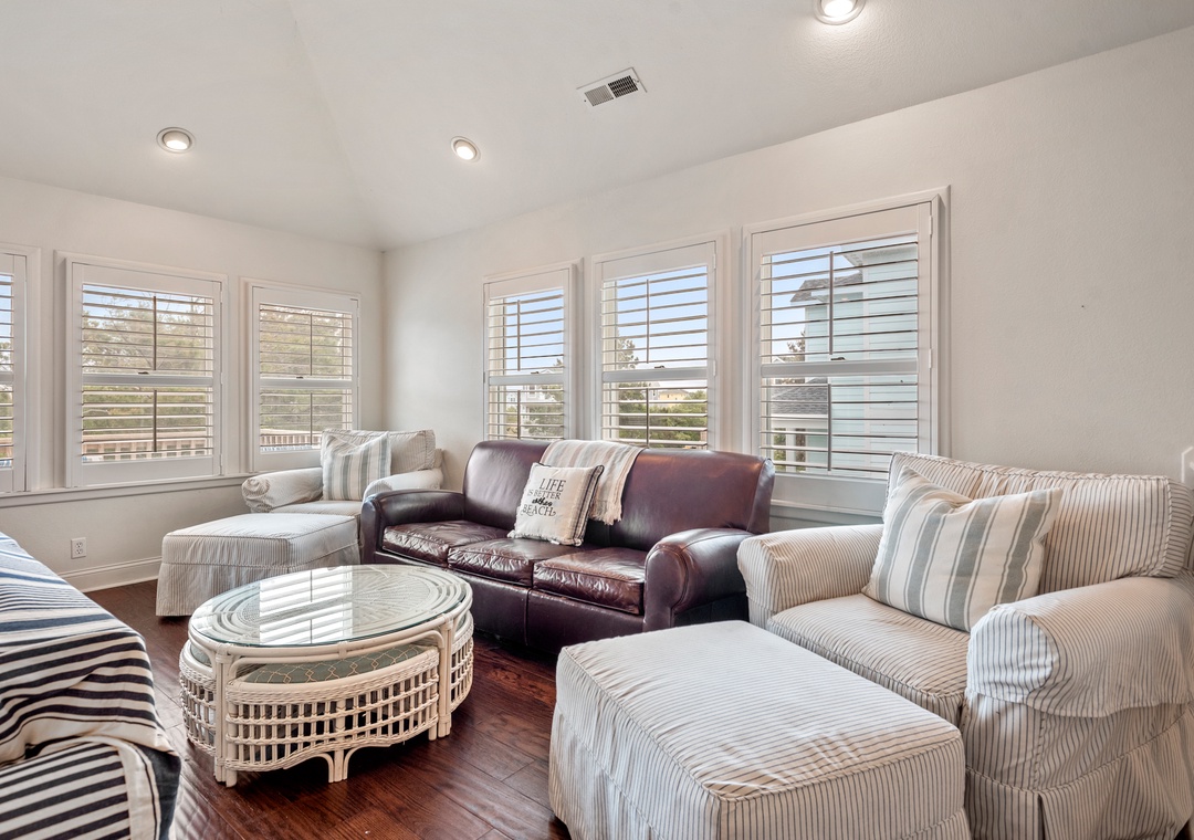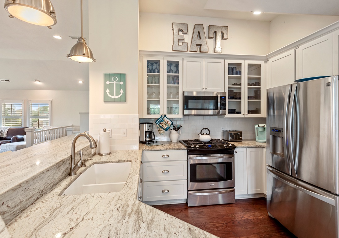 Upstairs in the main living area, there's plenty of comfortable seating plus an open-concept layout to encourage quality time spent together with family and friends. Vaulted ceilings and a neutral color palette create a bright and airy space with abundant natural light. The great room also features a cozy gas fireplace, practical hardwood flooring throughout, and coastal accents including plantation shutters for the ultimate beach house vibes. The chef in the family will appreciate the well-equipped kitchen that boasts custom cabinetry, granite countertops and stainless-steel appliances. With a dining table that seats up to ten plus bar seating at the kitchen for four more, everyone can enjoy meals together. Hidden Gem provides three levels and over 3,000 square feet of living space, ideal for multiple or extended families. Three of the six bedrooms include ensuite baths for plenty of privacy, and the ground level rec room offers an additional space to unwind and hangout.