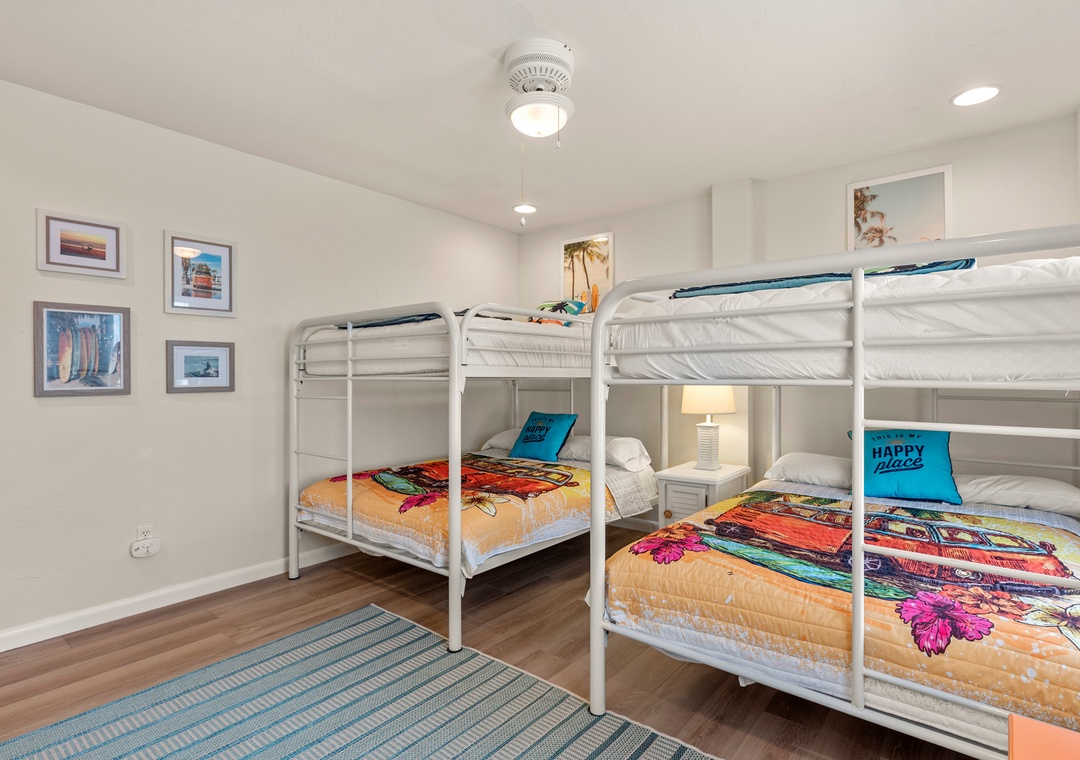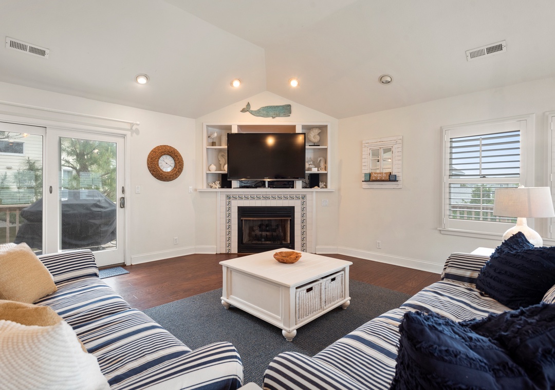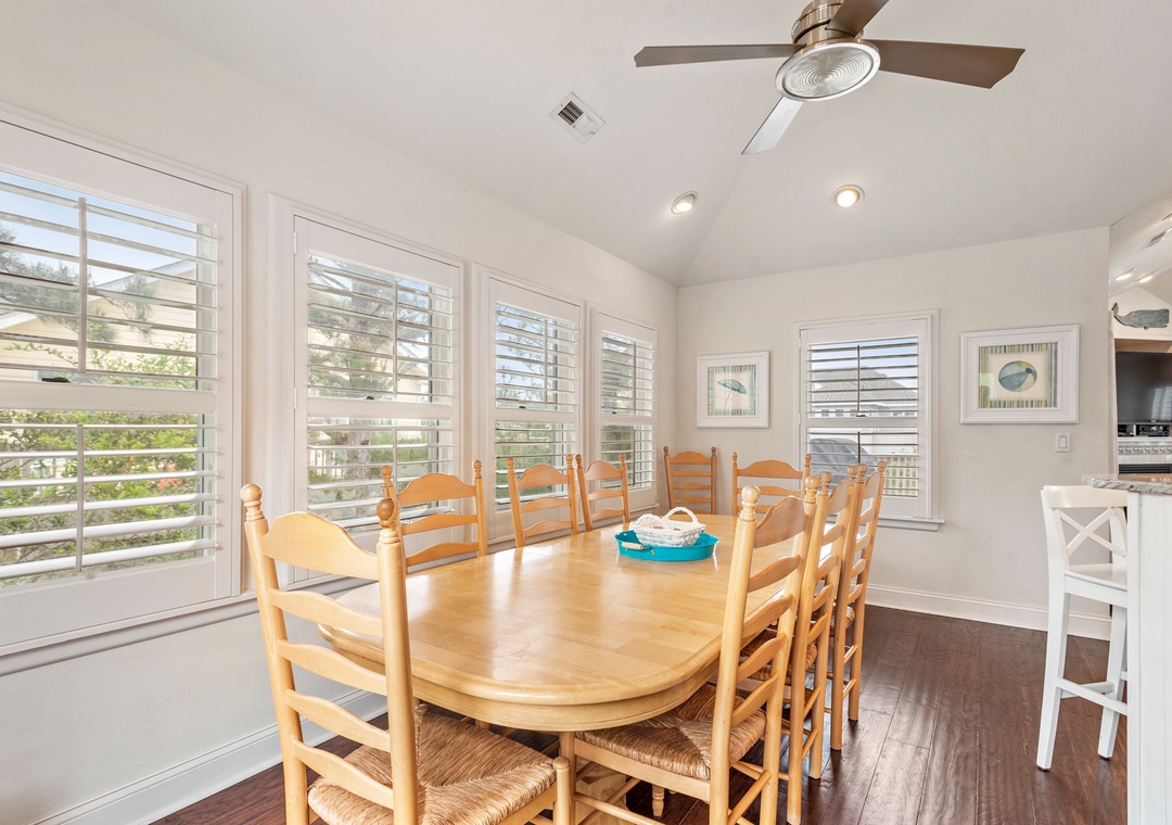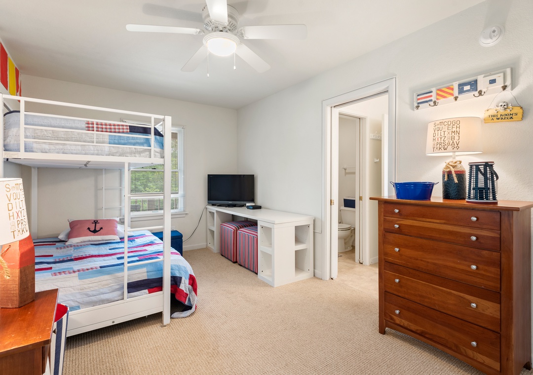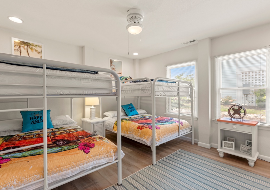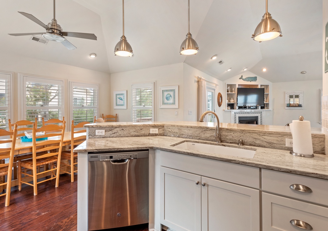 Upstairs in the main living area, there's plenty of comfortable seating plus an open-concept layout to encourage quality time spent together with family and friends. Vaulted ceilings and a neutral color palette create a bright and airy space with abundant natural light. The great room also features a cozy gas fireplace, practical hardwood flooring throughout, and coastal accents including plantation shutters for the ultimate beach house vibes. The chef in the family will appreciate the well-equipped kitchen that boasts custom cabinetry, granite countertops and stainless-steel appliances. With a dining table that seats up to ten plus bar seating at the kitchen for four more, everyone can enjoy meals together. Hidden Gem provides three levels and over 3,000 square feet of living space, ideal for multiple or extended families. Three of the six bedrooms include ensuite baths for plenty of privacy, and the ground level rec room offers an additional space to unwind and hangout.