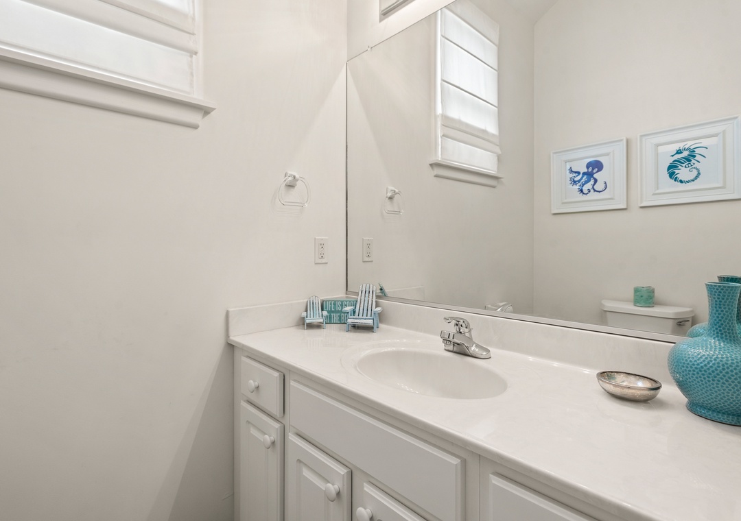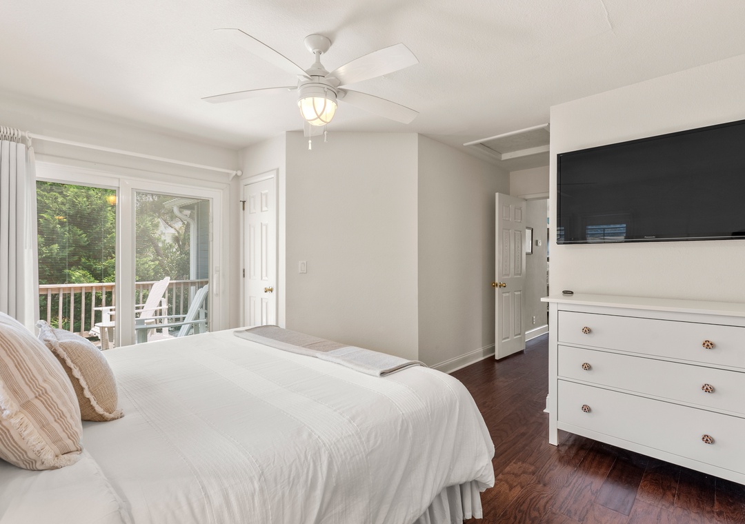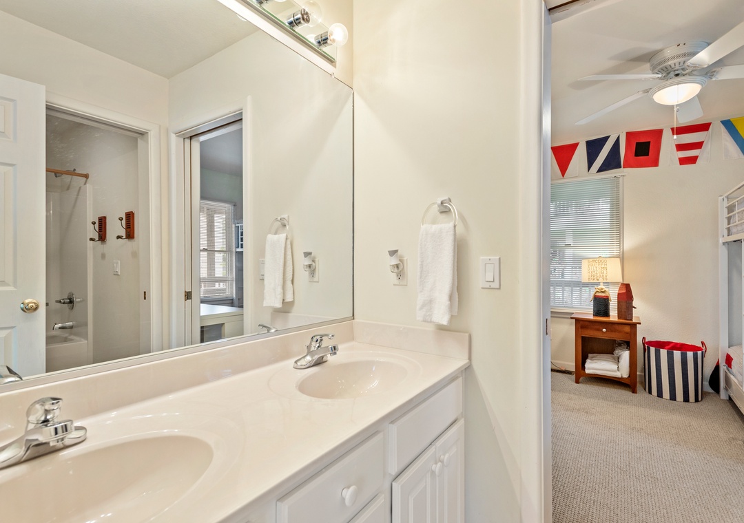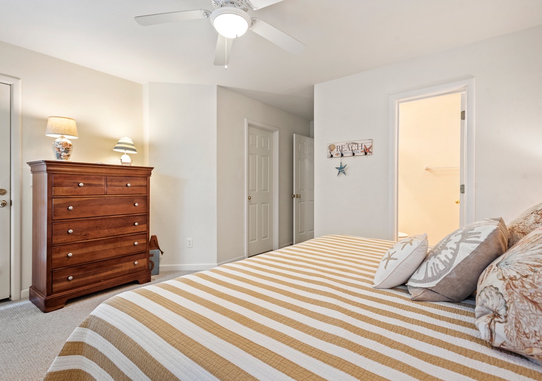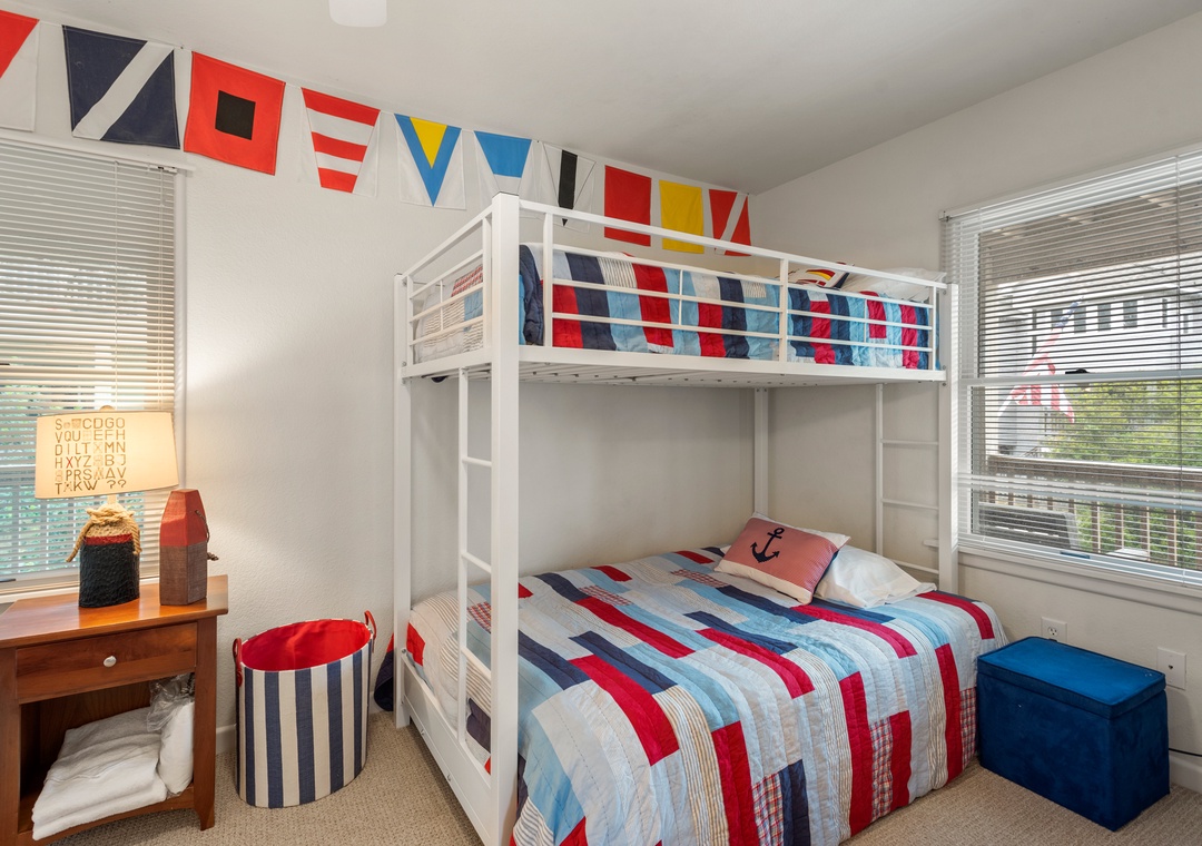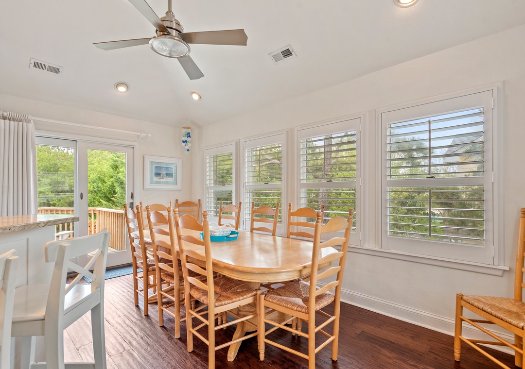 Upstairs in the main living area, there's plenty of comfortable seating plus an open-concept layout to encourage quality time spent together with family and friends. Vaulted ceilings and a neutral color palette create a bright and airy space with abundant natural light. The great room also features a cozy gas fireplace, practical hardwood flooring throughout, and coastal accents including plantation shutters for the ultimate beach house vibes. The chef in the family will appreciate the well-equipped kitchen that boasts custom cabinetry, granite countertops and stainless-steel appliances. With a dining table that seats up to ten plus bar seating at the kitchen for four more, everyone can enjoy meals together. Hidden Gem provides three levels and over 3,000 square feet of living space, ideal for multiple or extended families. Three of the six bedrooms include ensuite baths for plenty of privacy, and the ground level rec room offers an additional space to unwind and hangout.
