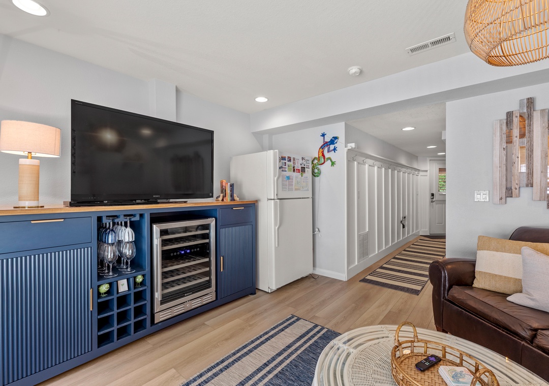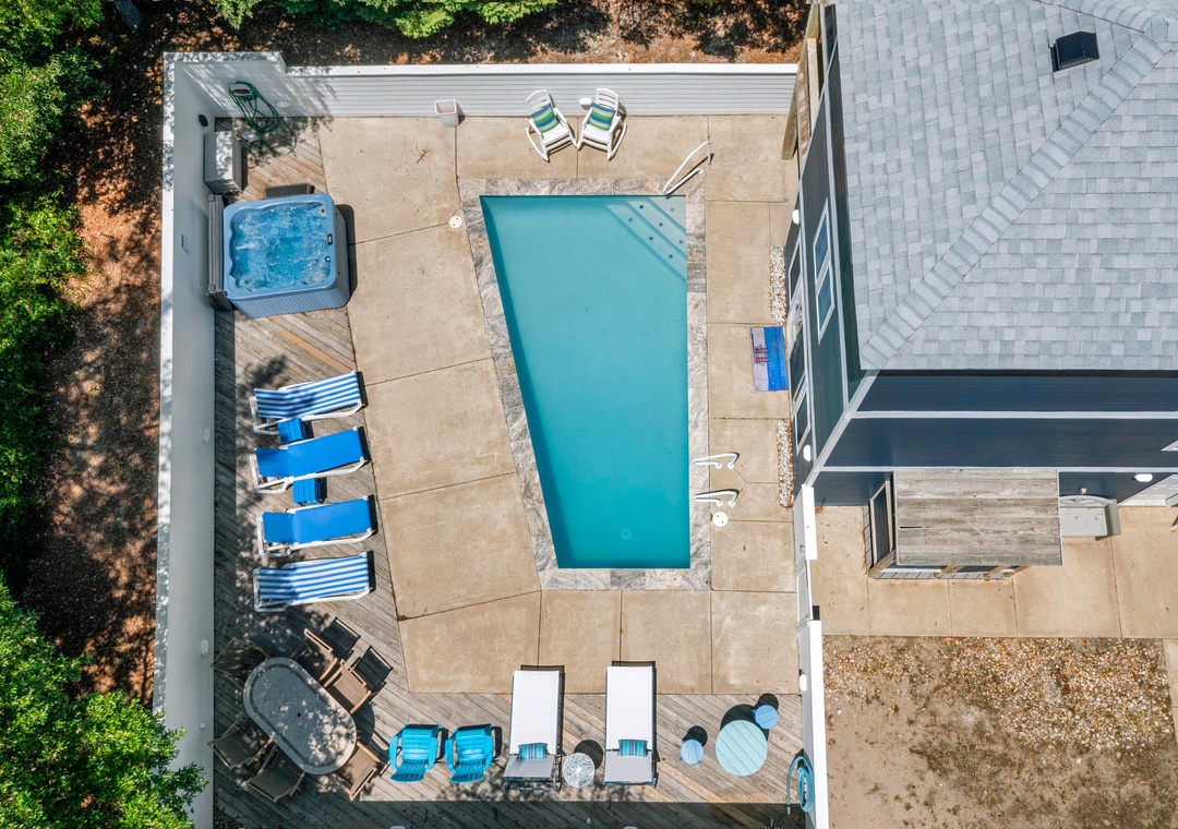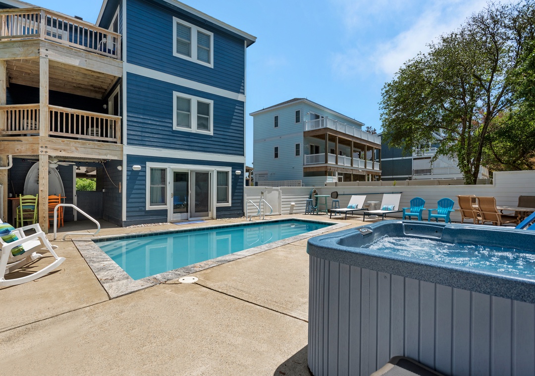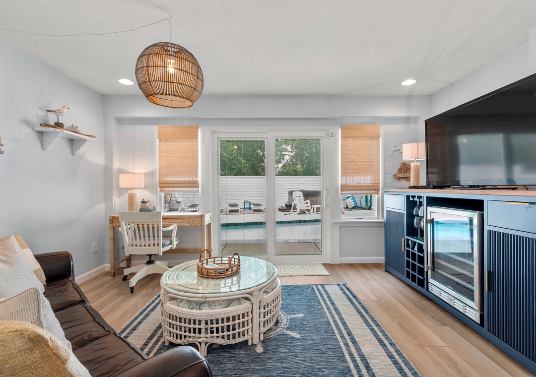 In the evenings after a day at the beach or exploring Corolla, the outdoor fun can continue in your own private pool area. Unwind in the hot tub or enjoy a cocktail at the custom-built tiki bar. The ground level rec room is conveniently located only steps away from the pool area. Featuring a wine fridge, perfect for unwinding after a day in the sun, and a designated workspace to balance productivity with relaxation during your OBX getaway.