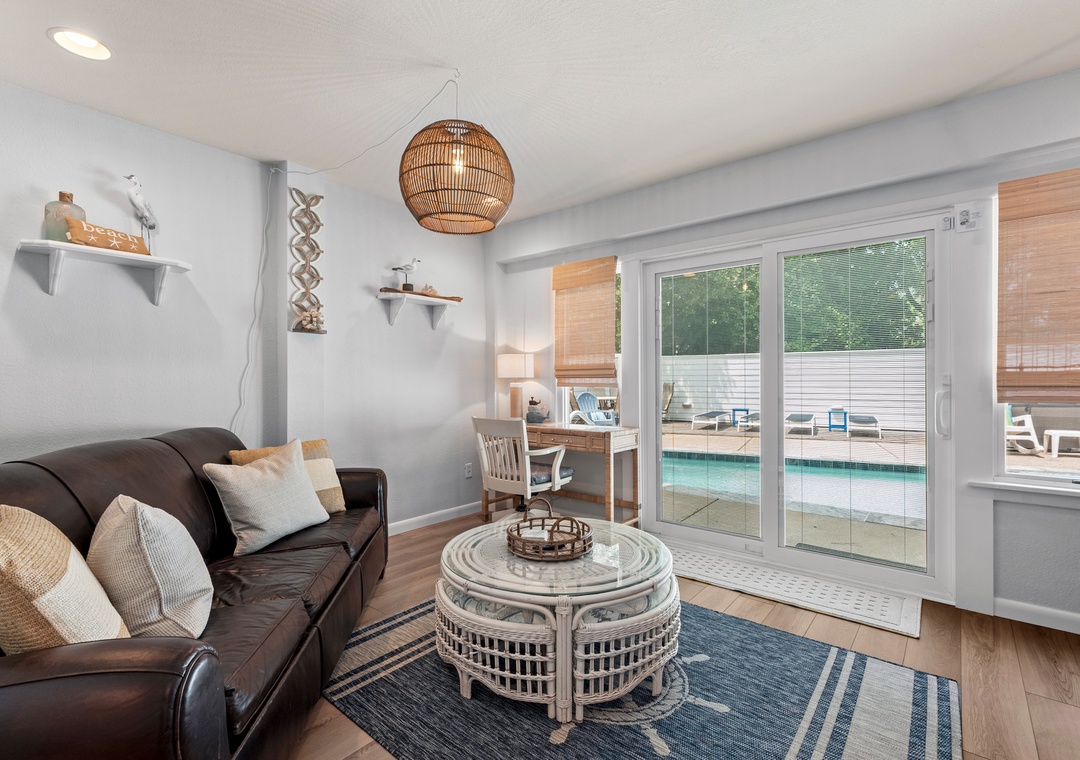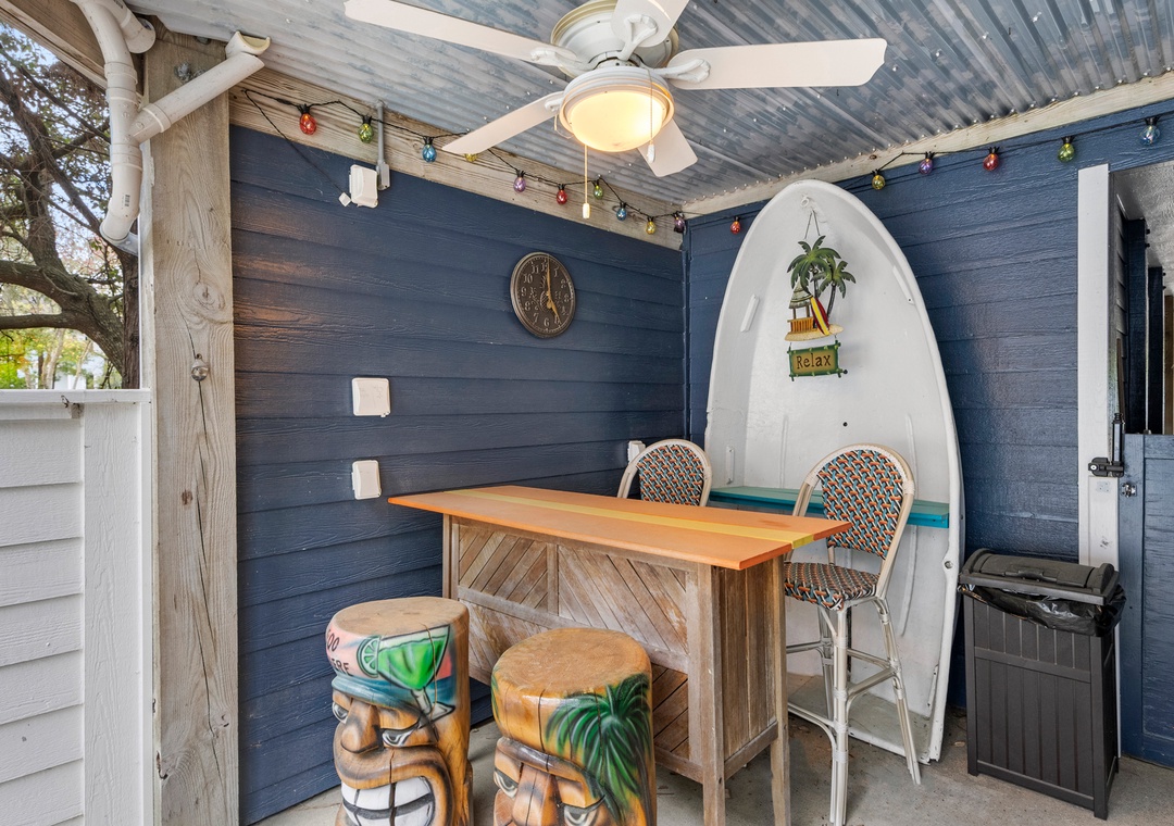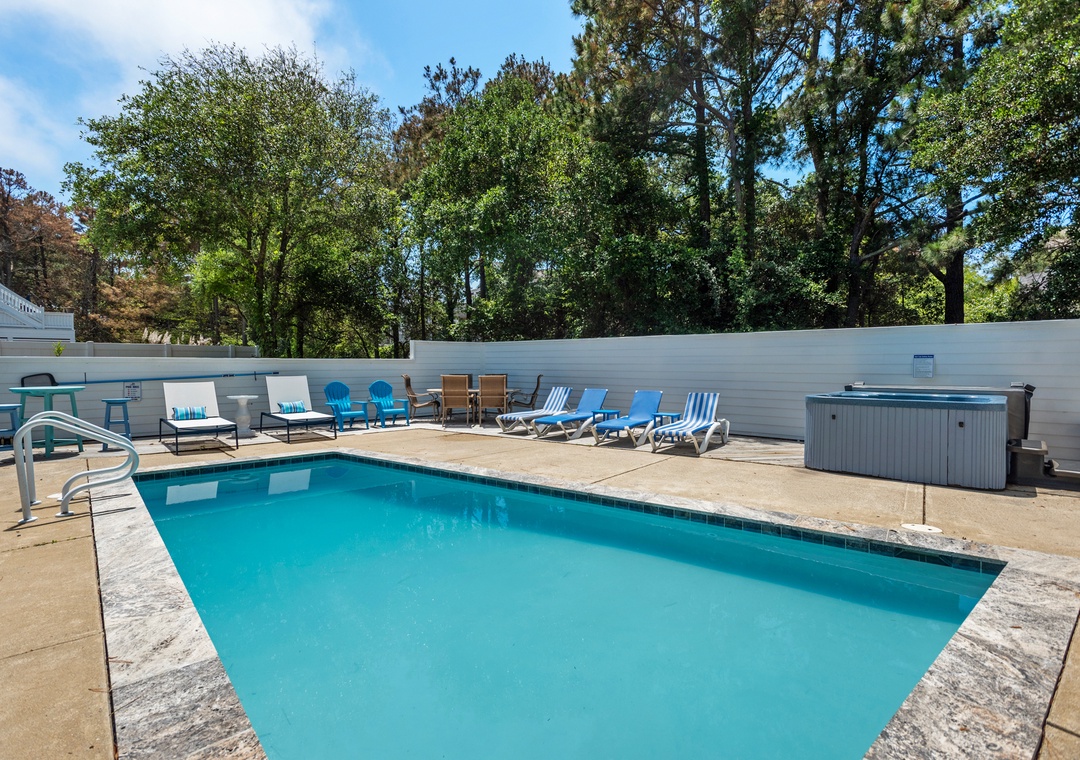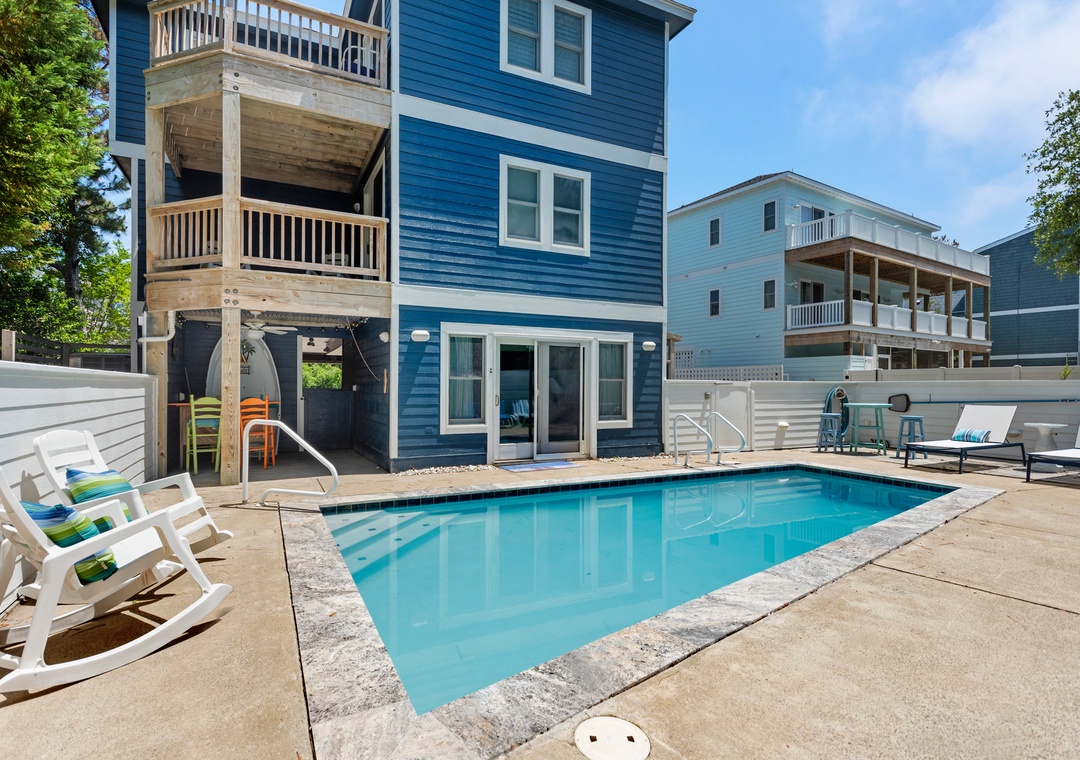 In the evenings after a day at the beach or exploring Corolla, the outdoor fun can continue in your own private pool area. Unwind in the hot tub or enjoy a cocktail at the custom-built tiki bar. The ground level rec room is conveniently located only steps away from the pool area. Featuring a wine fridge, perfect for unwinding after a day in the sun, and a designated workspace to balance productivity with relaxation during your OBX getaway.