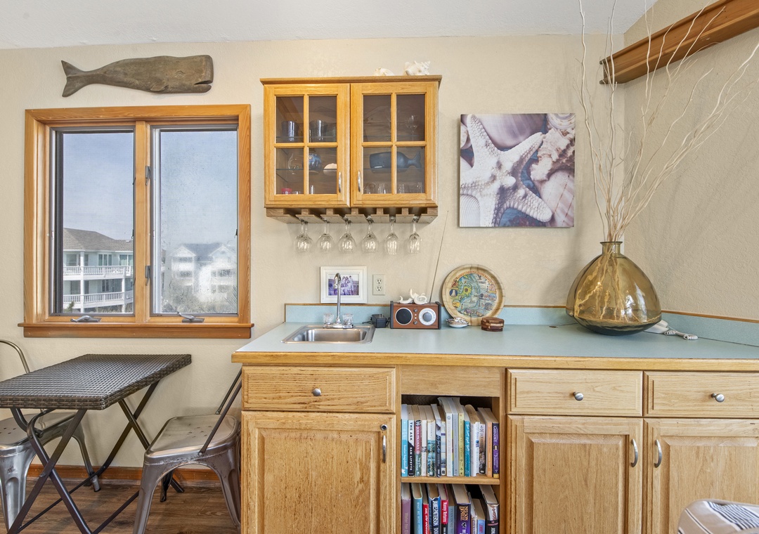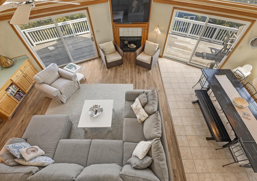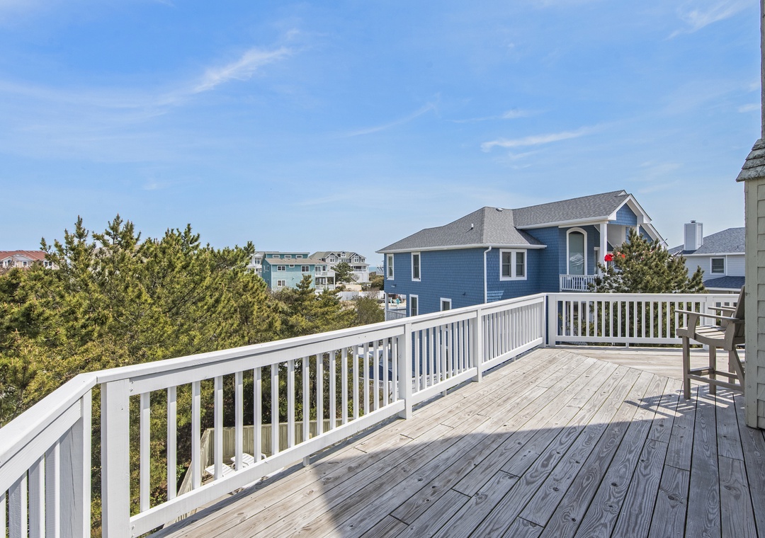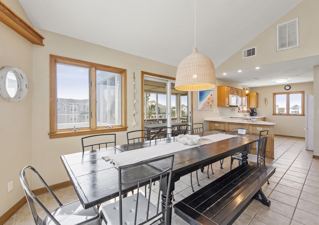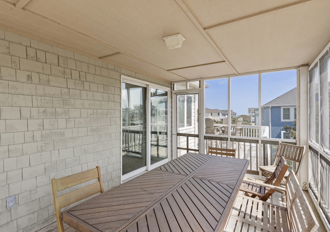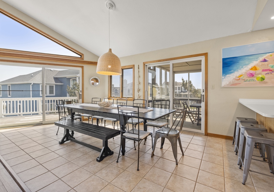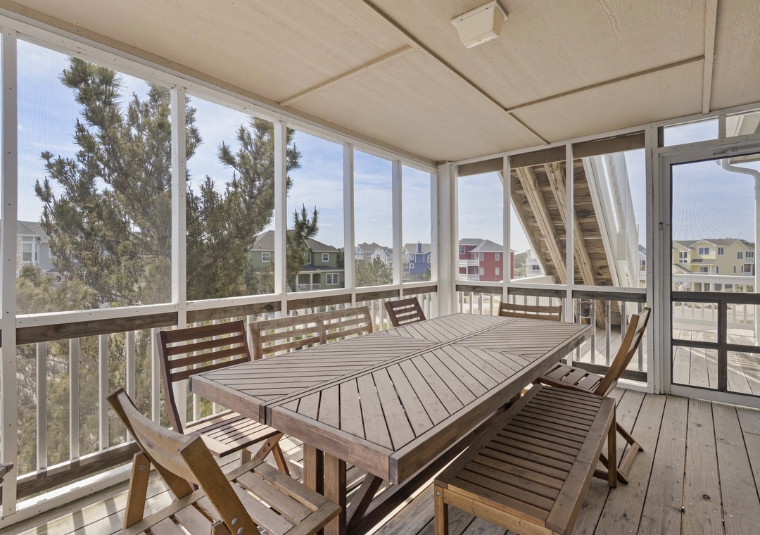 The open-concept great room on the top level opens up to a sun deck overlooking the pool below, as well as a screened porch with outdoor dining area. When you're not trying out one of Corolla's fabulous restaurants, the chef in the family will appreciate the well-equipped kitchen with breakfast bar. Three of the six bedrooms include ensuite baths for plenty of privacy, ideal for multiple or extended families. On the ground level, you'll find a den with a wet bar and additional full-sized fridge for storing extra groceries or the catch of the day.