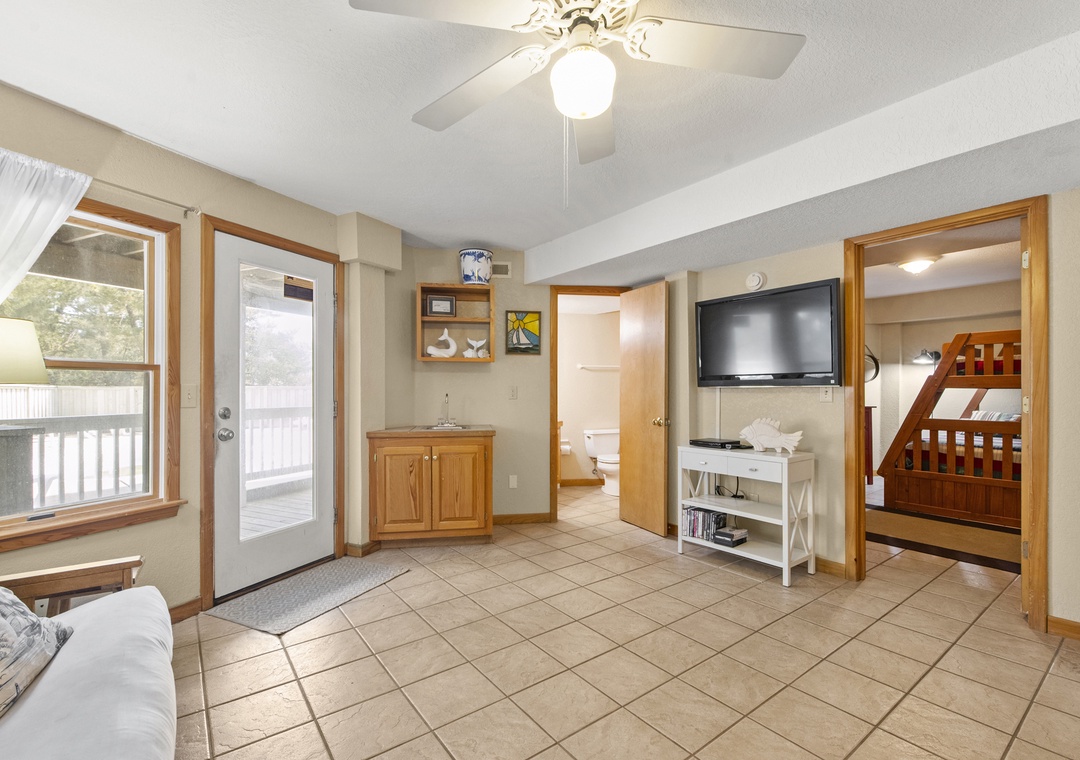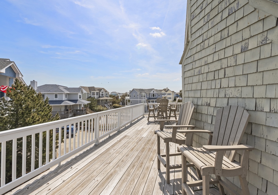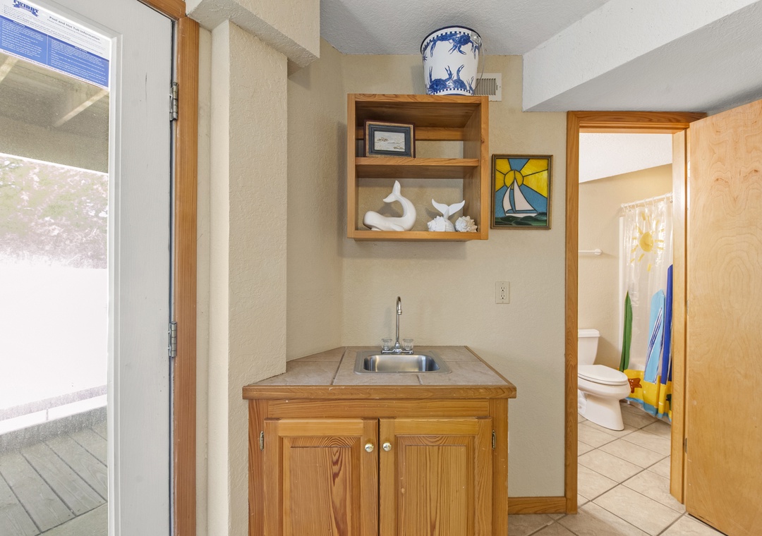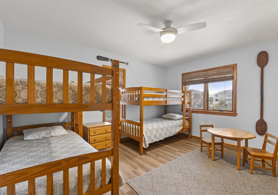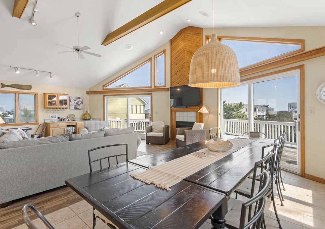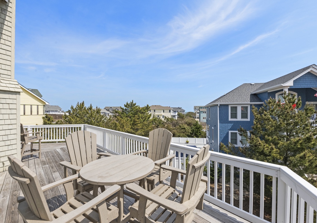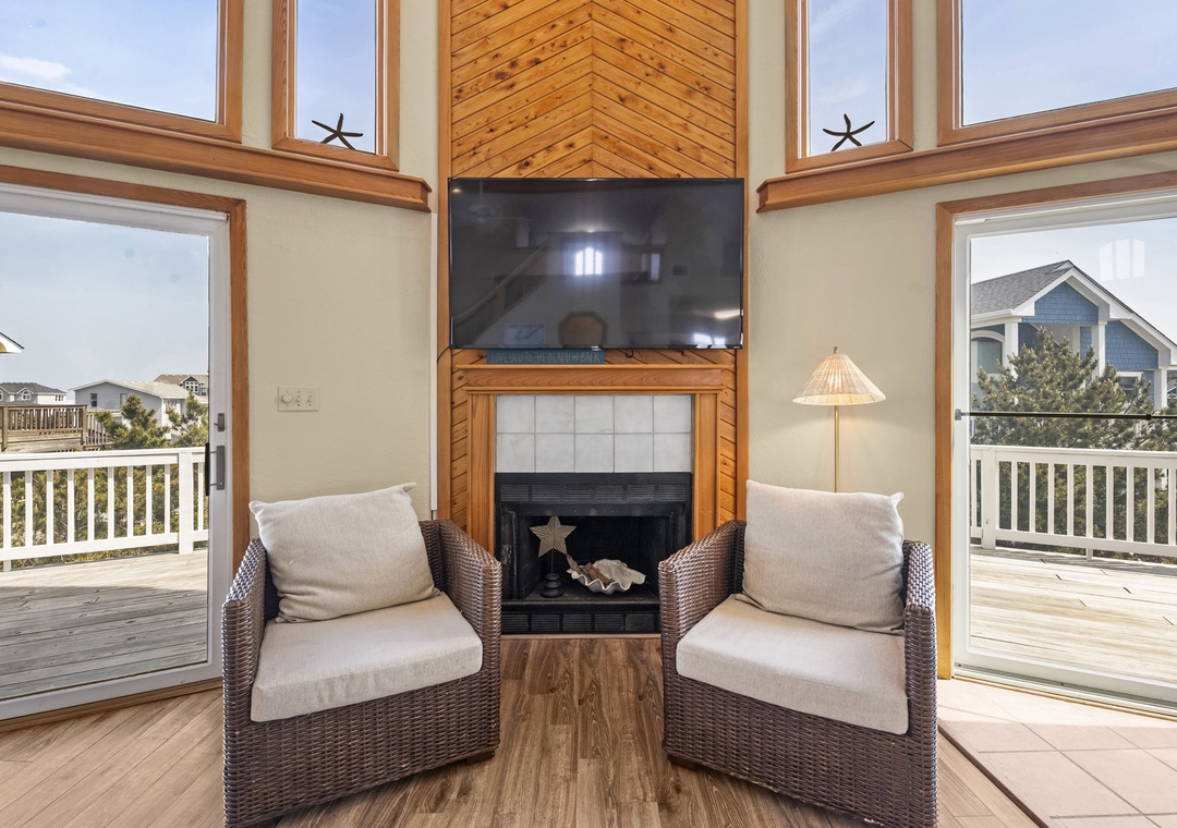 The open-concept great room on the top level opens up to a sun deck overlooking the pool below, as well as a screened porch with outdoor dining area. When you're not trying out one of Corolla's fabulous restaurants, the chef in the family will appreciate the well-equipped kitchen with breakfast bar. Three of the six bedrooms include ensuite baths for plenty of privacy, ideal for multiple or extended families. On the ground level, you'll find a den with a wet bar and additional full-sized fridge for storing extra groceries or the catch of the day.