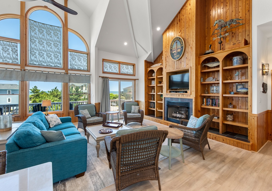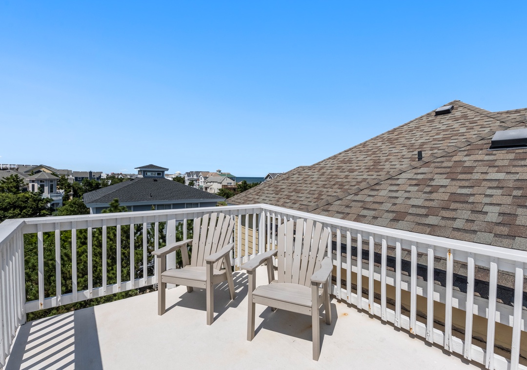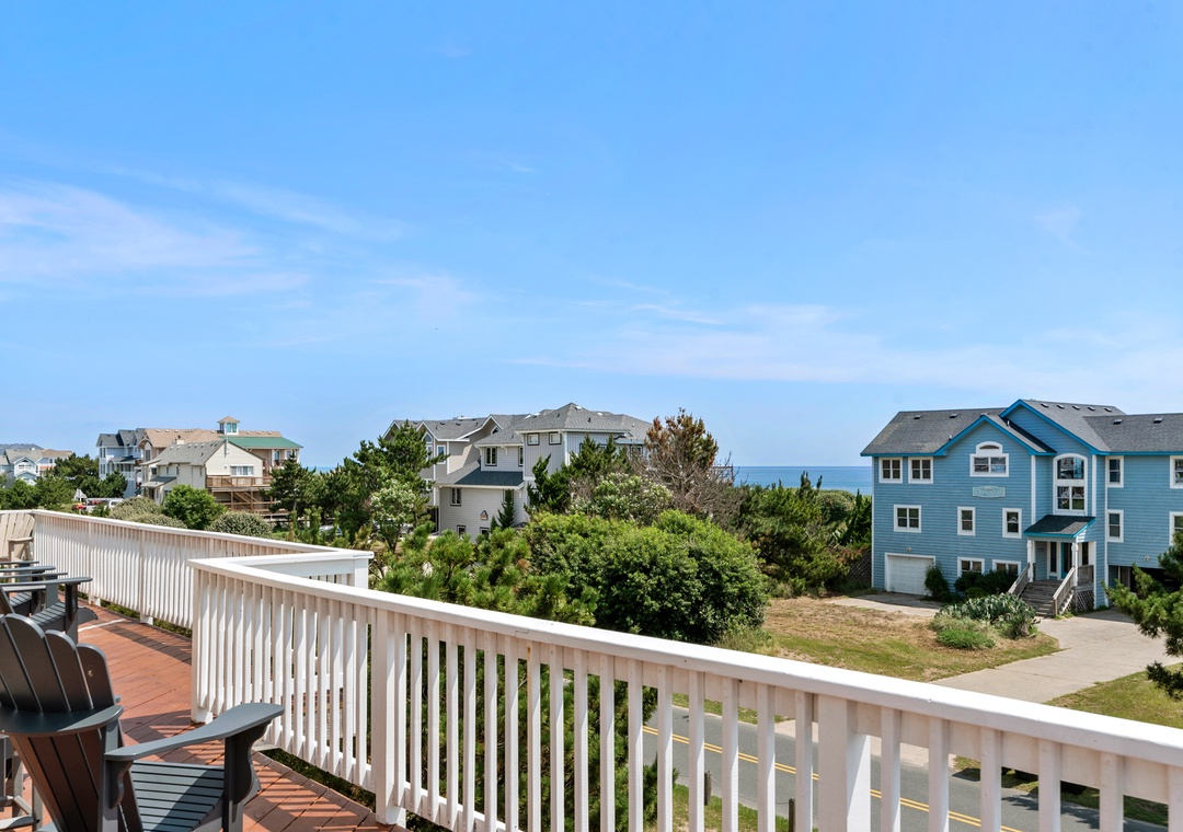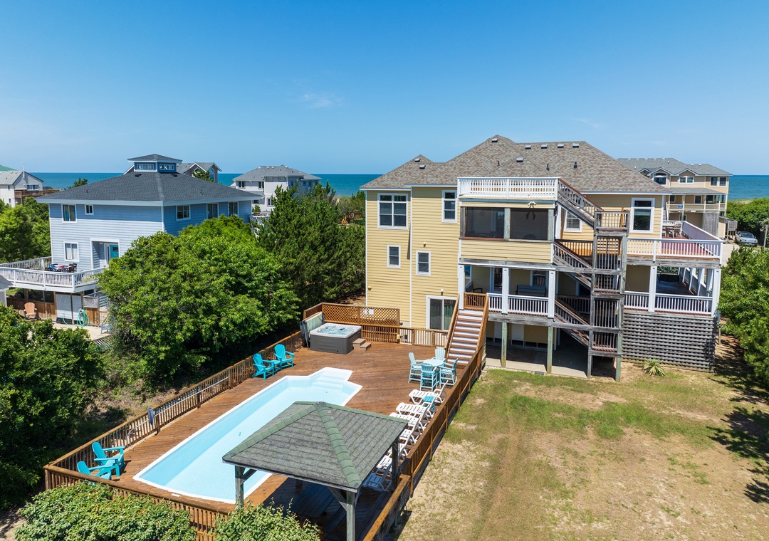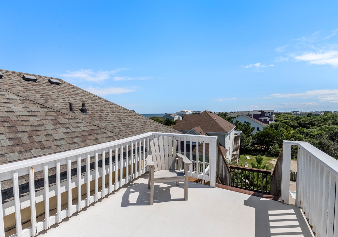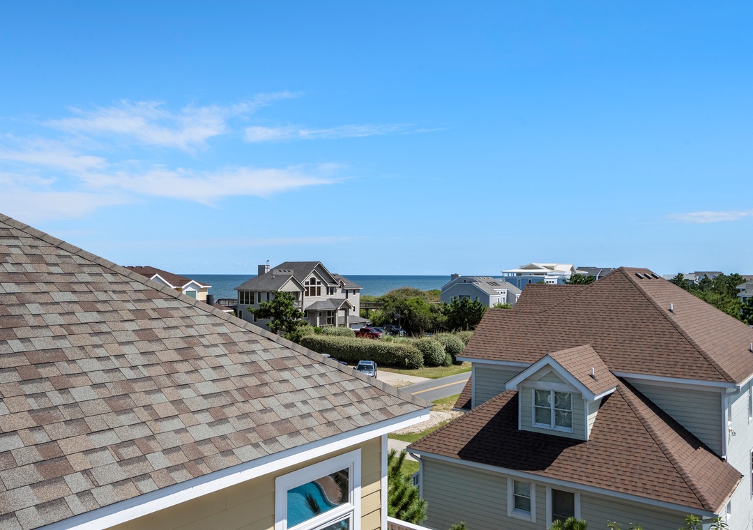 Looking for a beach house with a private pool, ocean view AND easy access to the beach? Then Starboard Home is indeed the right home for you! Drop anchor at this semi-oceanfront home located in the popular Whalehead Beach community of Corolla. The Sturgeon Steet public access is conveniently located just three lots away for a short, safe walk to the beach. Your family will love having a private pool and hot tub for around-the-clock fun and relaxation right in your backyard! Inside, a reverse floorplan and floor-to-ceiling windows maximize the ocean views from the great room. Soaring vaulted ceilings and an abundance of natural light make the entire space feel bright and airy. The chef in the family will especially appreciate the open-concept layout, where they can enjoy the view and be part of the action even while preparing meals. Get cozy in the Ships Watch, where you can curl up with a good book while admiring the ocean view. Three levels of decking including a screened-in porch provide plenty of outdoor space for enjoying the salt air and ocean breezes. Head up to the rooftop deck to the claim the best seats in the house for spectacular sunsets.