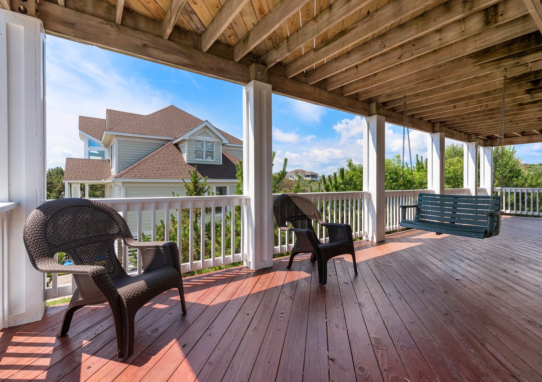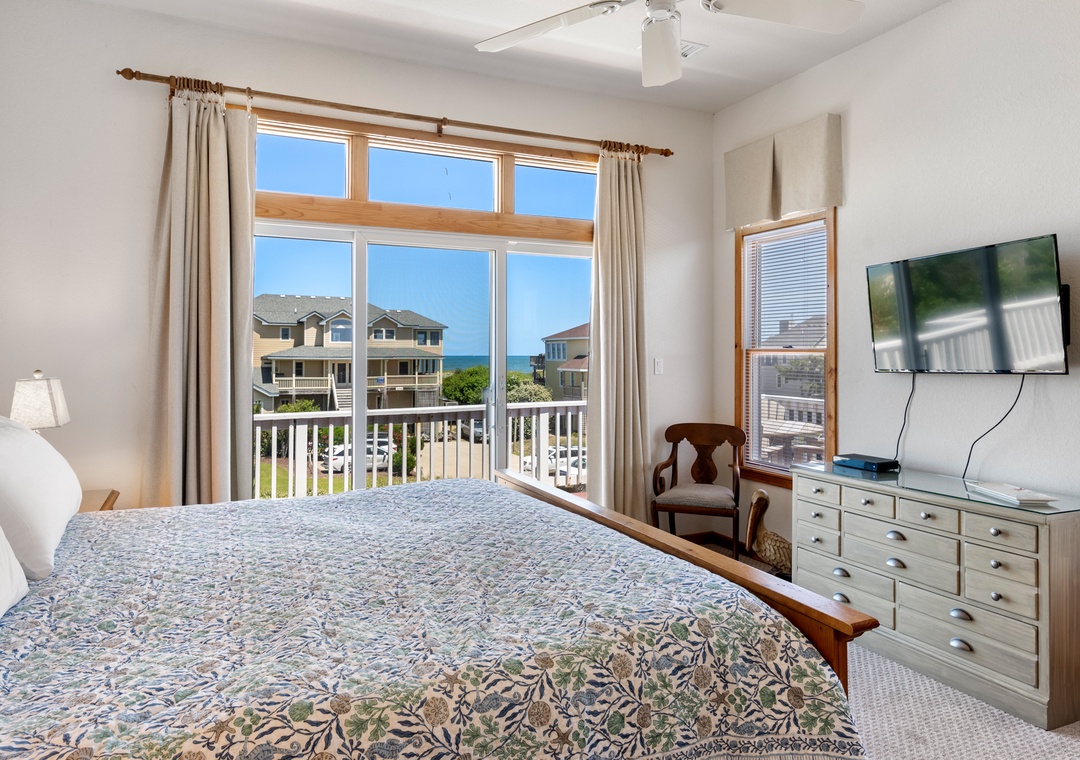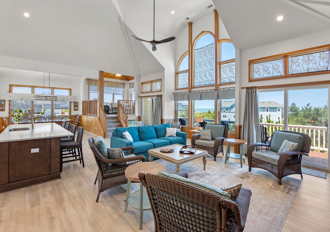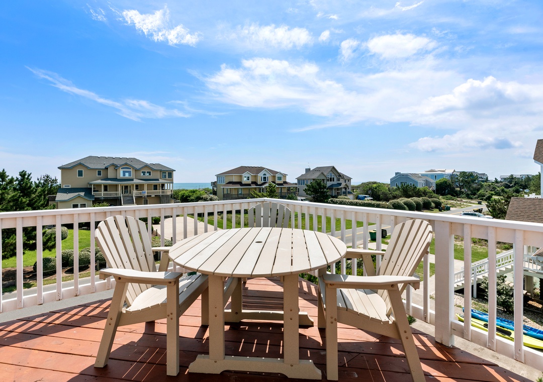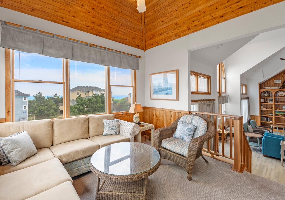 Looking for a beach house with a private pool, ocean view AND easy access to the beach? Then Starboard Home is indeed the right home for you! Drop anchor at this semi-oceanfront home located in the popular Whalehead Beach community of Corolla. The Sturgeon Steet public access is conveniently located just three lots away for a short, safe walk to the beach. Your family will love having a private pool and hot tub for around-the-clock fun and relaxation right in your backyard! Inside, a reverse floorplan and floor-to-ceiling windows maximize the ocean views from the great room. Soaring vaulted ceilings and an abundance of natural light make the entire space feel bright and airy. The chef in the family will especially appreciate the open-concept layout, where they can enjoy the view and be part of the action even while preparing meals. Get cozy in the Ships Watch, where you can curl up with a good book while admiring the ocean view. Three levels of decking including a screened-in porch provide plenty of outdoor space for enjoying the salt air and ocean breezes. Head up to the rooftop deck to the claim the best seats in the house for spectacular sunsets.