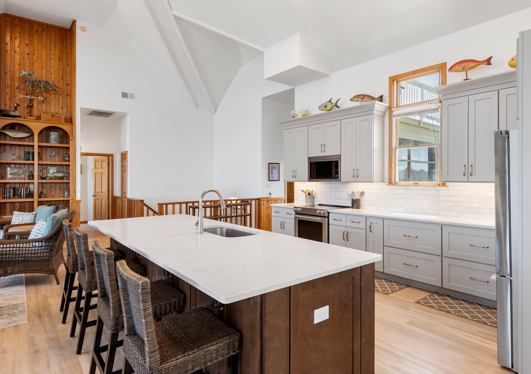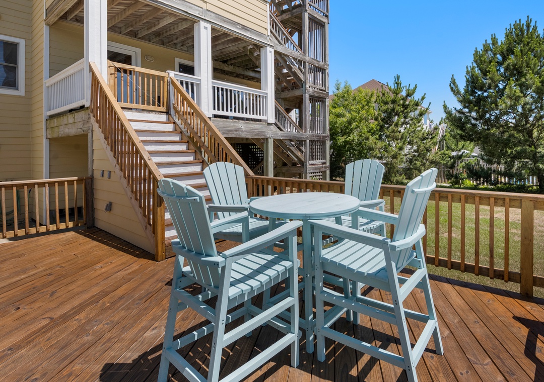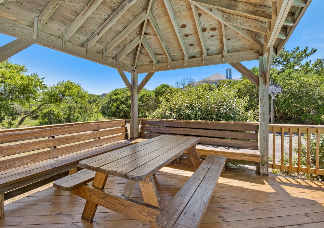 Starboard Home is ideal for extended families or multiple groups vacationing together. With a primary suite on the top level and two additional master bedrooms on the mid-level, everyone will have plenty of space and privacy. The ground level den can serve as a second living area or hang-out space for the kids. Use the wet bar with full-size fridge to serve poolside drinks and snacks at the picnic table under the gazebo.