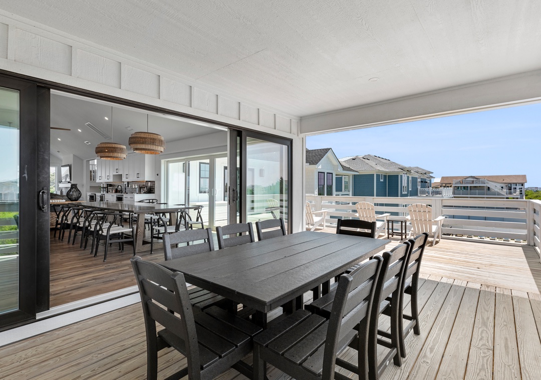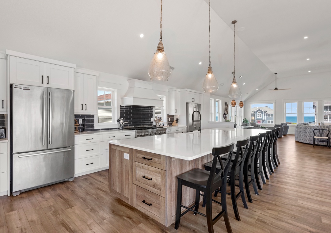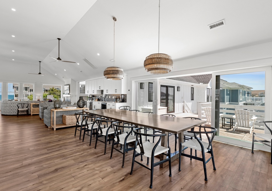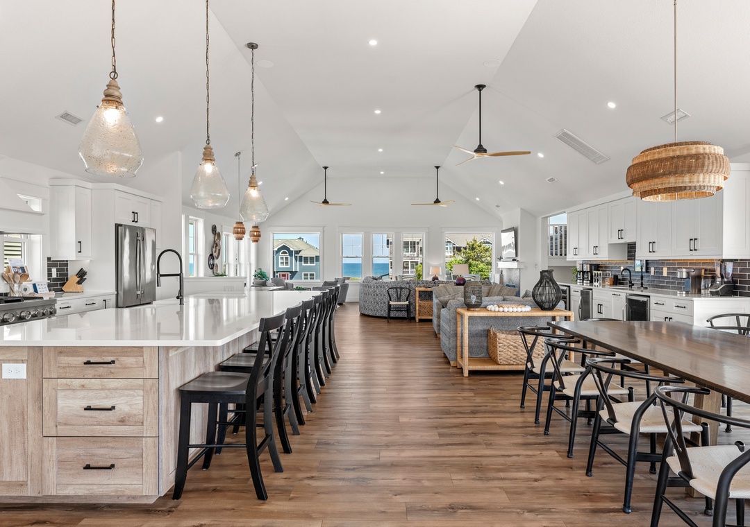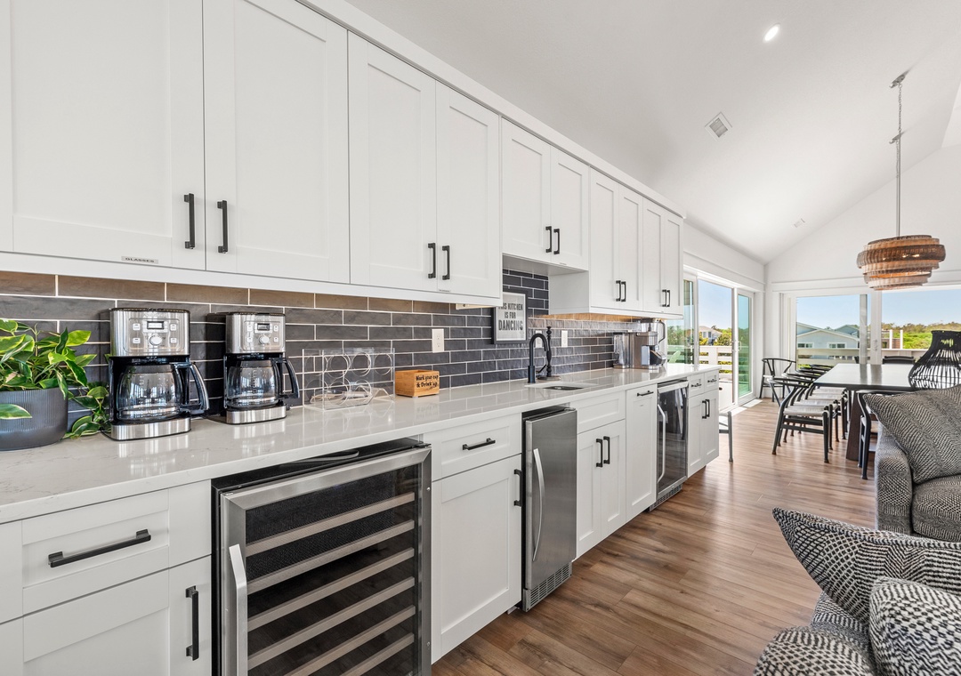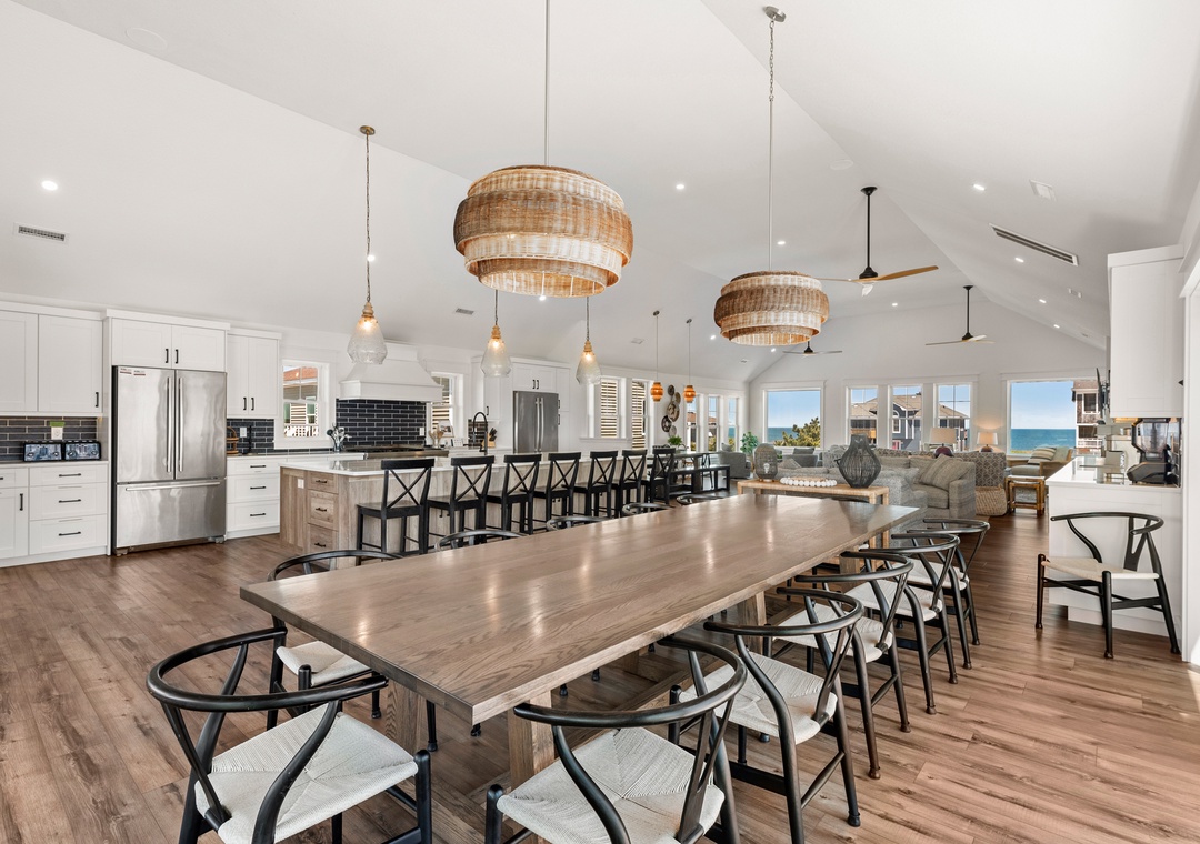 Inside, bask in a spacious living area with an electric fireplace, entertainment at your fingertips including a surround sound via Sonos throughout the house and outdoor spaces with multiple zones to control from your phone. Enjoy cooking? Take advantage of all the kitchen has to offer starting with the granite countertops, bar area, two refrigerators, and a wall oven/ gas range with a large hood. When the cooking is all done and you're ready for a beach house family dinner, gather around the 14-seat dining room table in the dining room that has rear deck access. Above the top level is ships watch that offers views of the ocean far and wide! Within the top level there are three king master bedrooms, two with private deck accesses and a hall half bathroom.