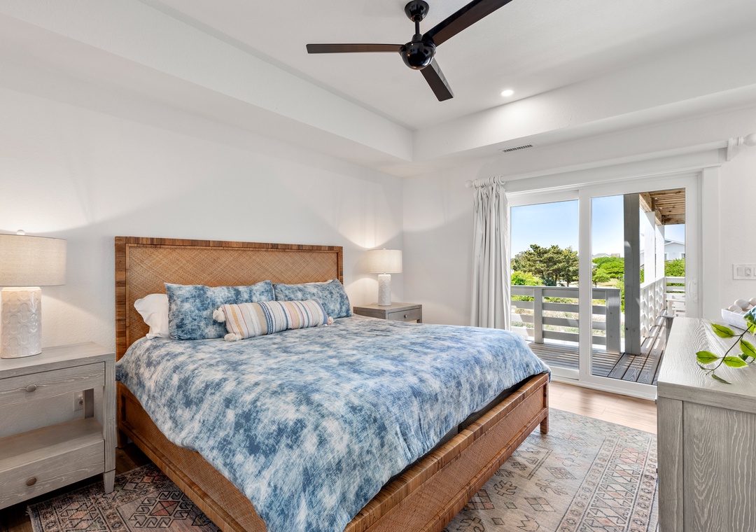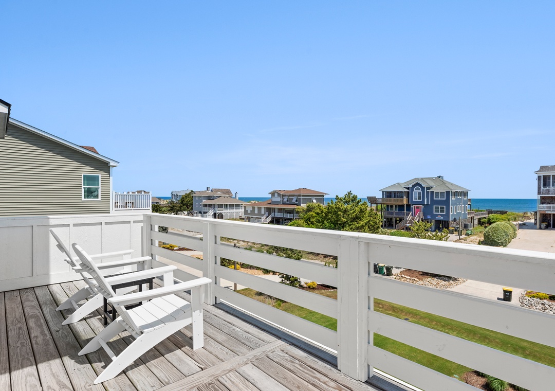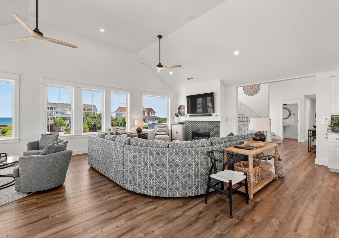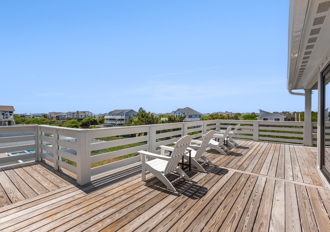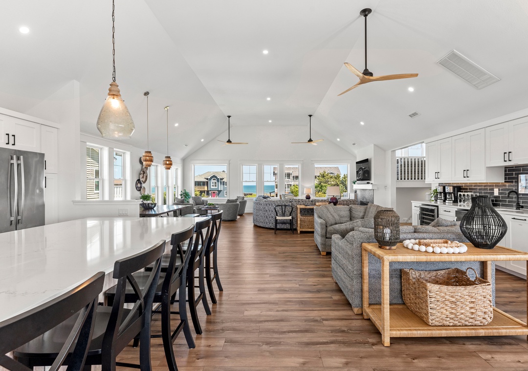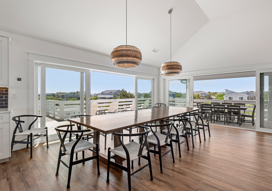 Inside, bask in a spacious living area with an electric fireplace, entertainment at your fingertips including a surround sound via Sonos throughout the house and outdoor spaces with multiple zones to control from your phone. Enjoy cooking? Take advantage of all the kitchen has to offer starting with the granite countertops, bar area, two refrigerators, and a wall oven/ gas range with a large hood. When the cooking is all done and you're ready for a beach house family dinner, gather around the 14-seat dining room table in the dining room that has rear deck access. Above the top level is ships watch that offers views of the ocean far and wide! Within the top level there are three king master bedrooms, two with private deck accesses and a hall half bathroom.
