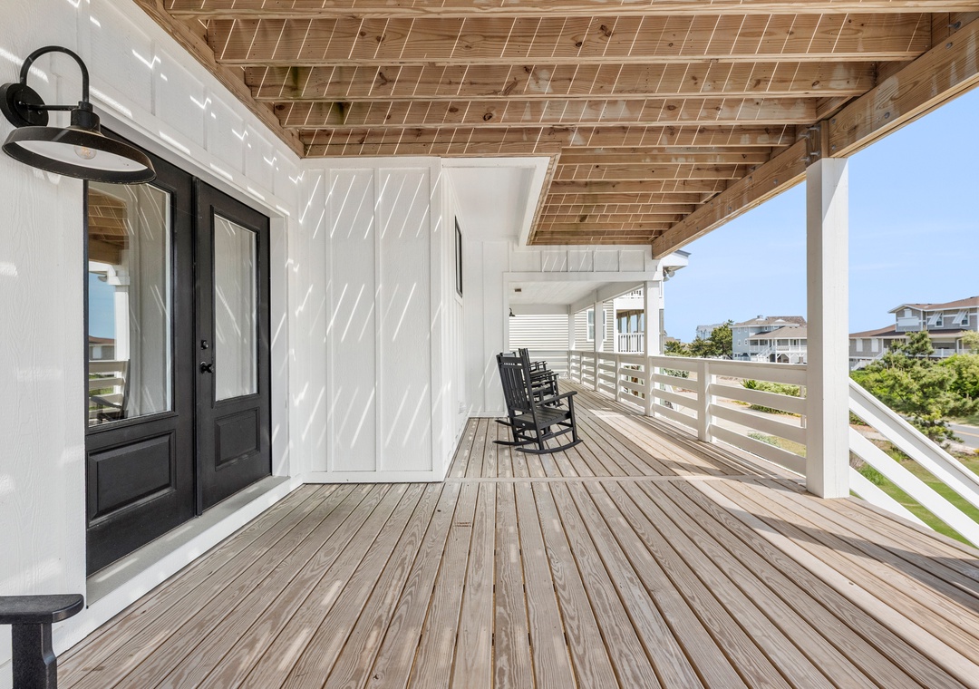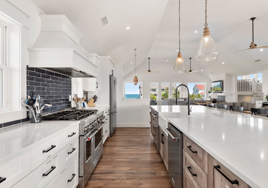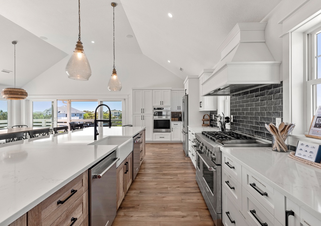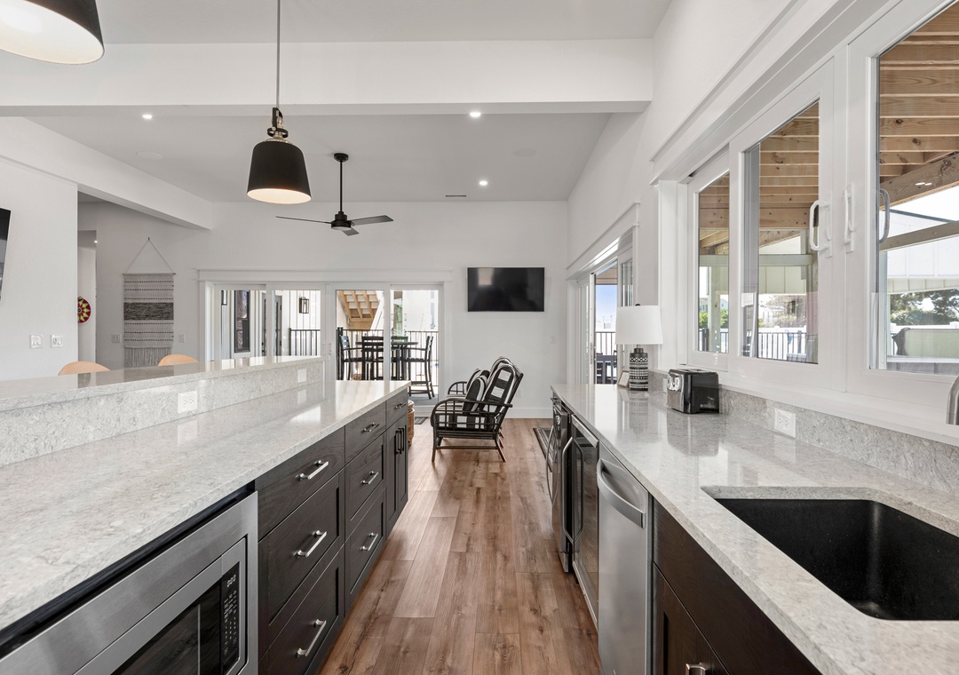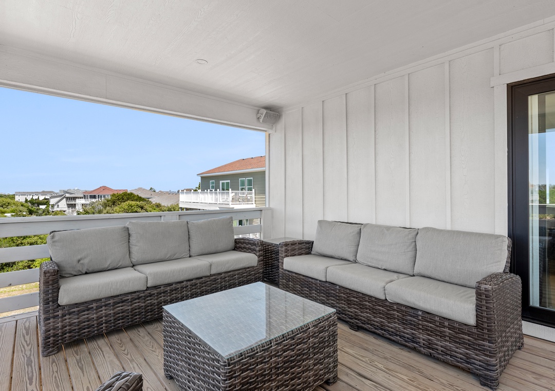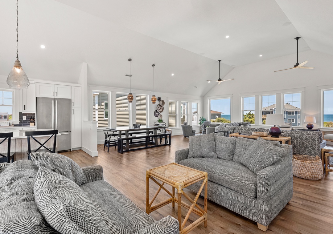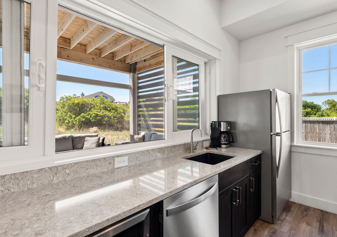 Inside, bask in a spacious living area with an electric fireplace, entertainment at your fingertips including a surround sound via Sonos throughout the house and outdoor spaces with multiple zones to control from your phone. Enjoy cooking? Take advantage of all the kitchen has to offer starting with the granite countertops, bar area, two refrigerators, and a wall oven/ gas range with a large hood. When the cooking is all done and you're ready for a beach house family dinner, gather around the 14-seat dining room table in the dining room that has rear deck access. Above the top level is ships watch that offers views of the ocean far and wide! Within the top level there are three king master bedrooms, two with private deck accesses and a hall half bathroom.
