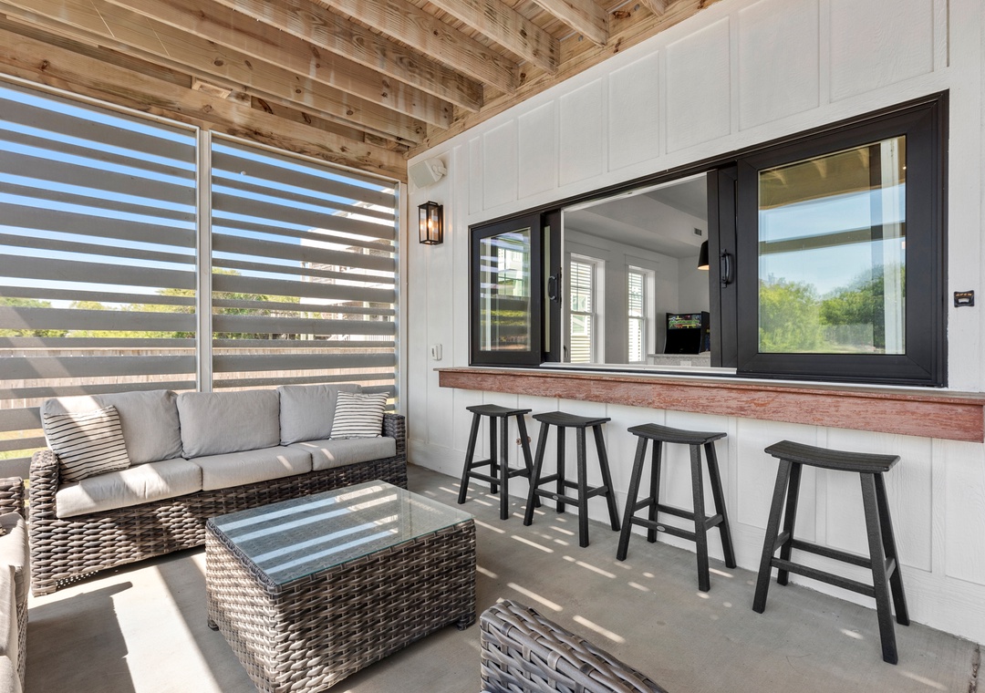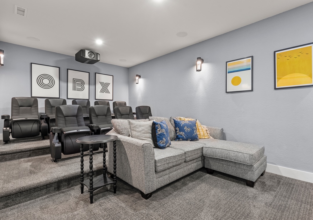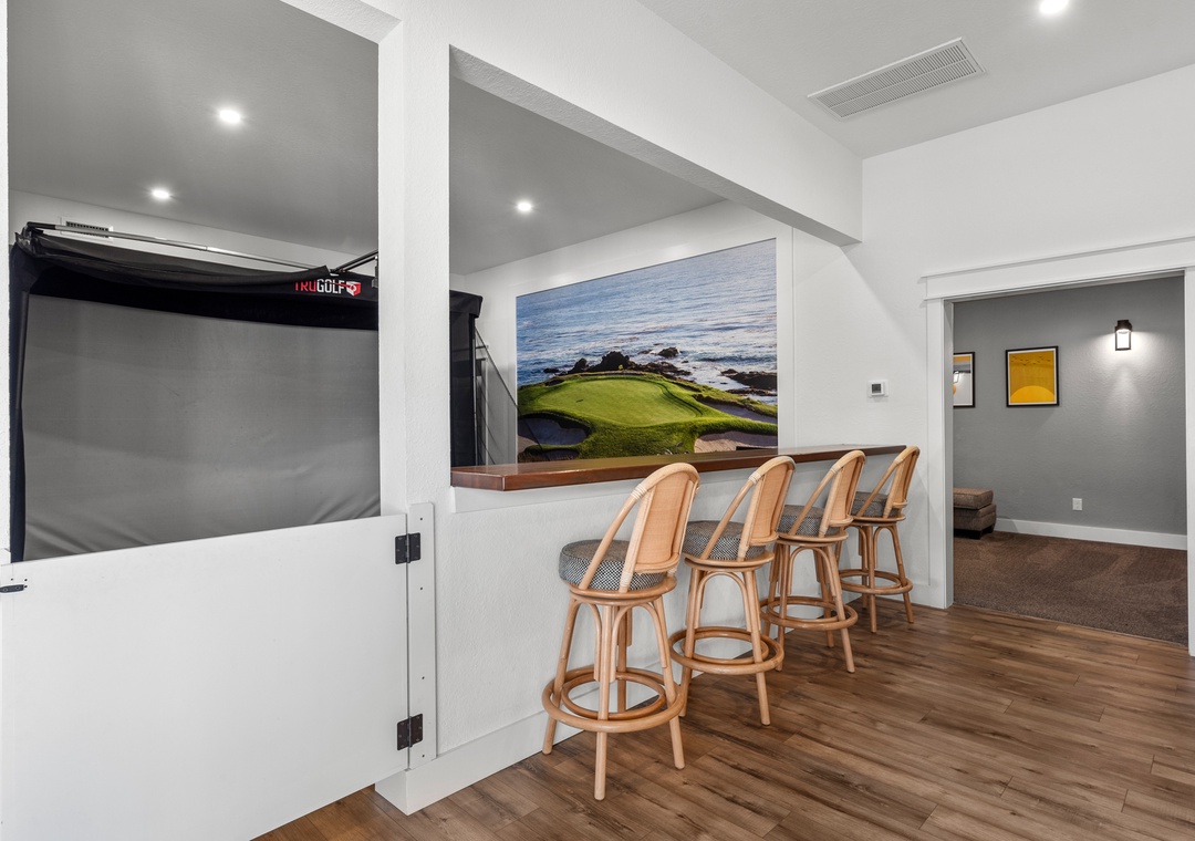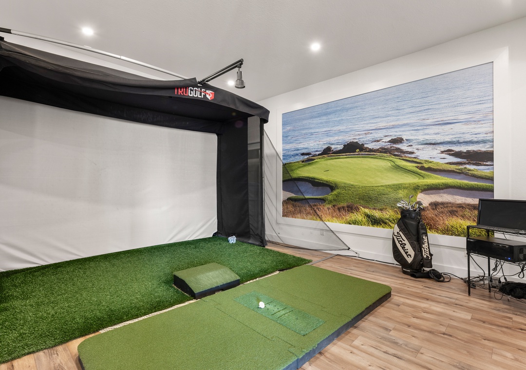 On the ground floor you have another king master bedroom, an additional washer and dryer closet, a game room with a shuffleboard, arcade, huge kitchenette, a half bathroom and access both a screened and unscreened porch where you can make your way out to the heated private saltwater pool and hot tub. Want more? Check out the Luxury golf simulator experience (TruGolf Brand with 90+ courses available for play) with a 4-seater bar and the three row theater room!