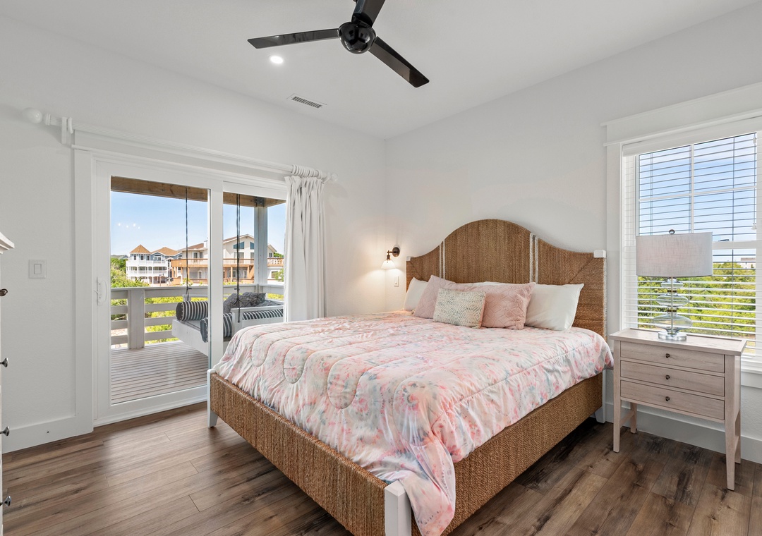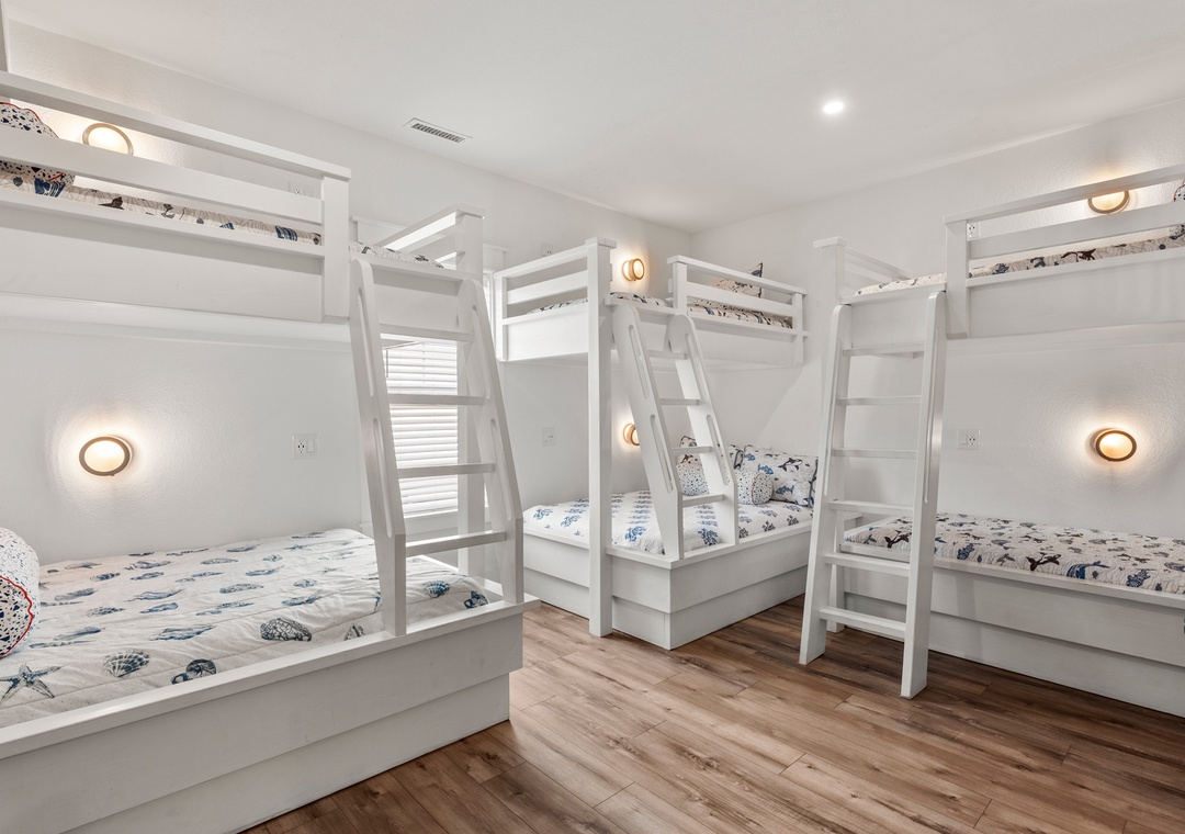Moving through to the middle level you will find a laundry room with a sink and 2 sets of stackable washer and dryers. There are six king master bedrooms with deck accesses and one of the king masters has a large tile shower and two sinks! Want a place for just the kids? Check out the 3-pyramid bunk bedroom room that is also a master with 2 sinks!