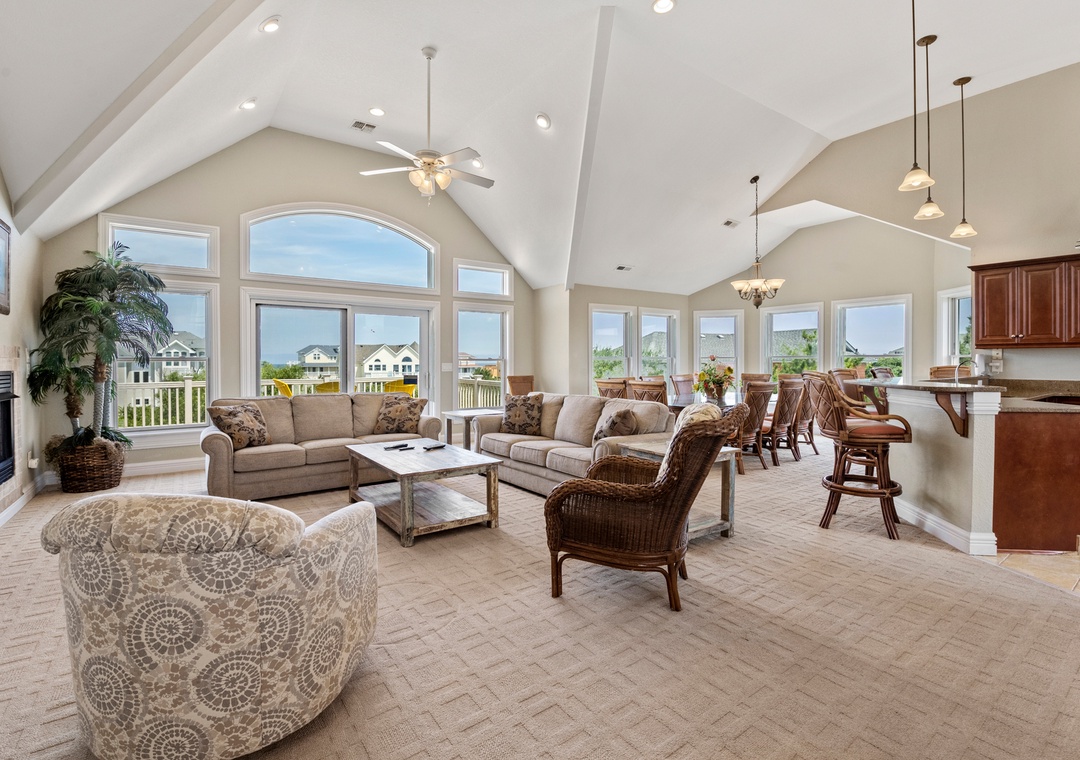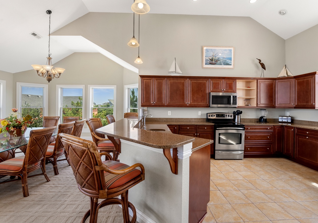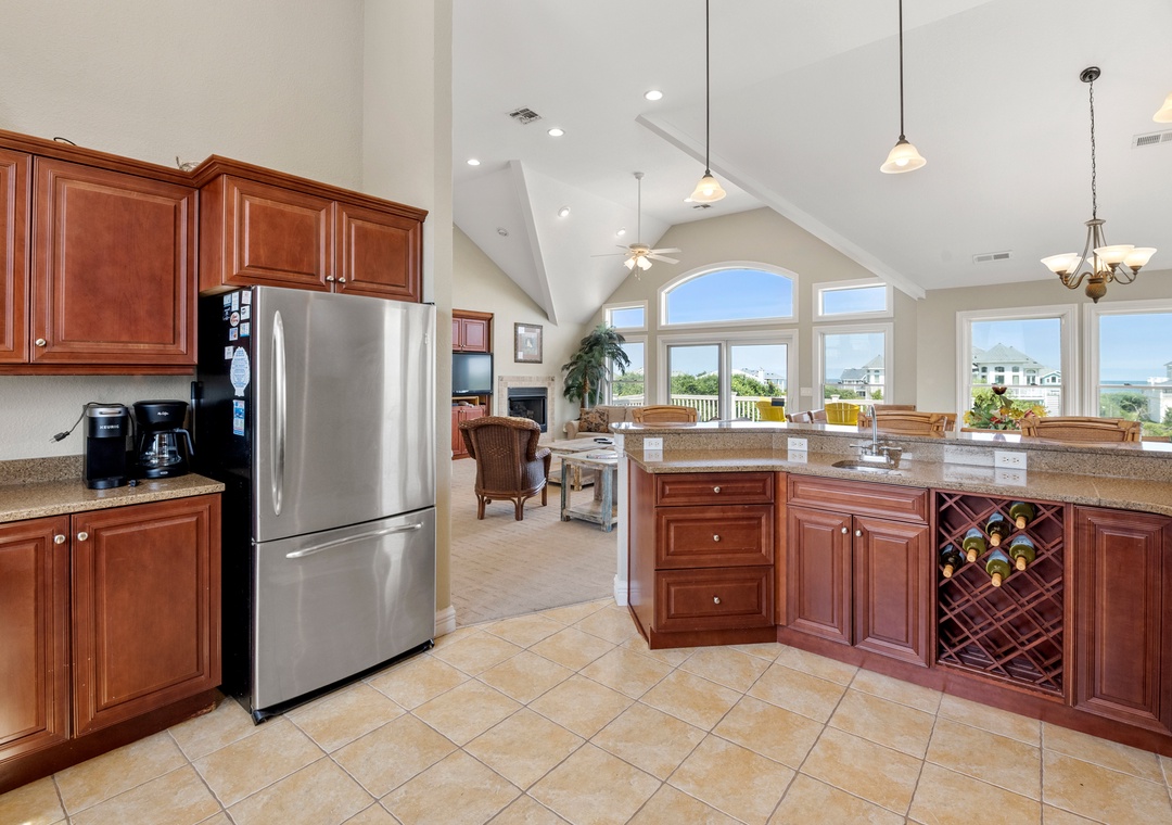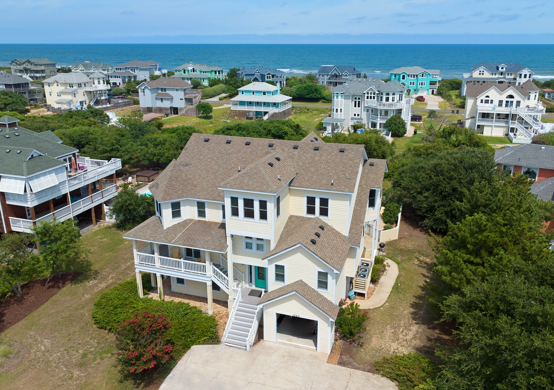 The tastefully appointed open-concept great room boasts an ocean view, vaulted ceilings and plenty of space for gathering. When you're not dining out at one of Corolla's fabulous restaurants, prepare meals at home in the kitchen featuring granite countertops and stainless steel appliances. Two generously sized king suites are located on the top level and each include a private bath. With five more bedrooms located on the mid-level (three of which are ensuite) and two more on the ground floor, this spacious retreat is ideal for multiple or extended families. Even the canine members of your tribe can join you since Mi Casa Bella is dog-friendly.