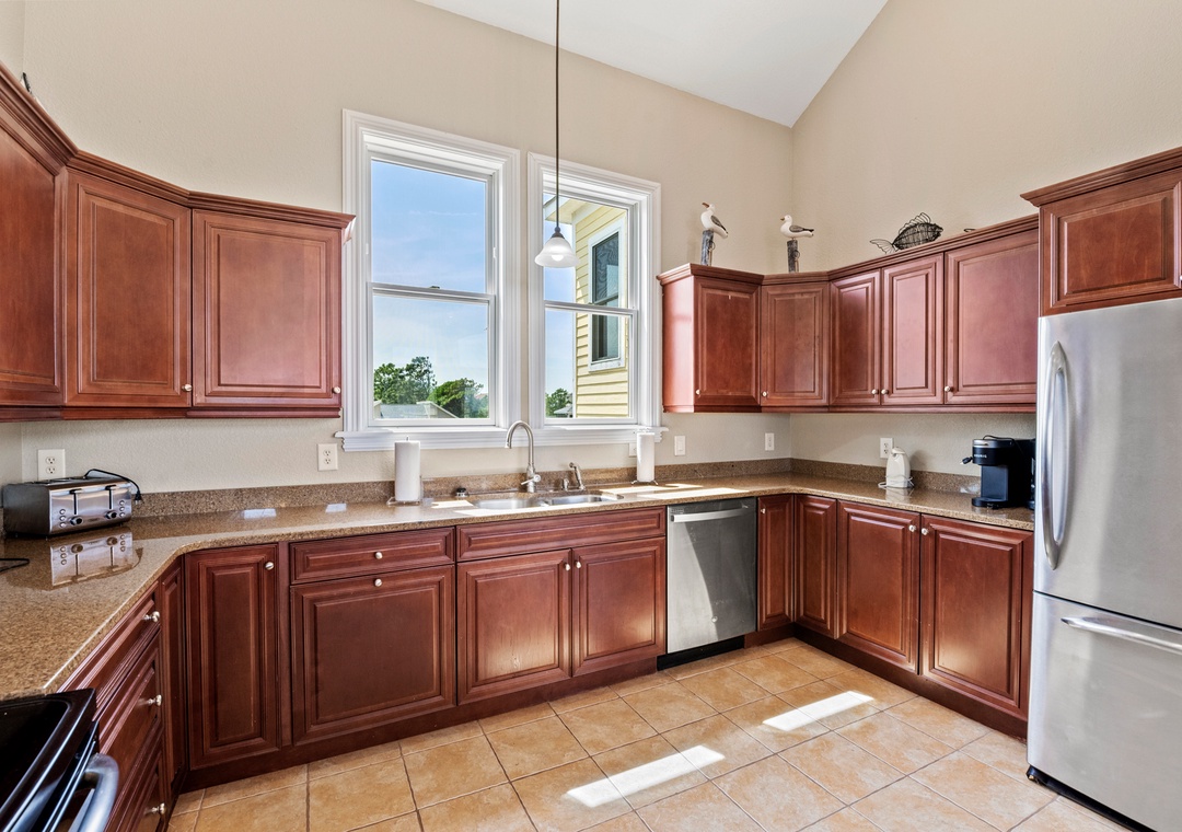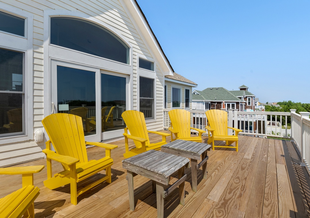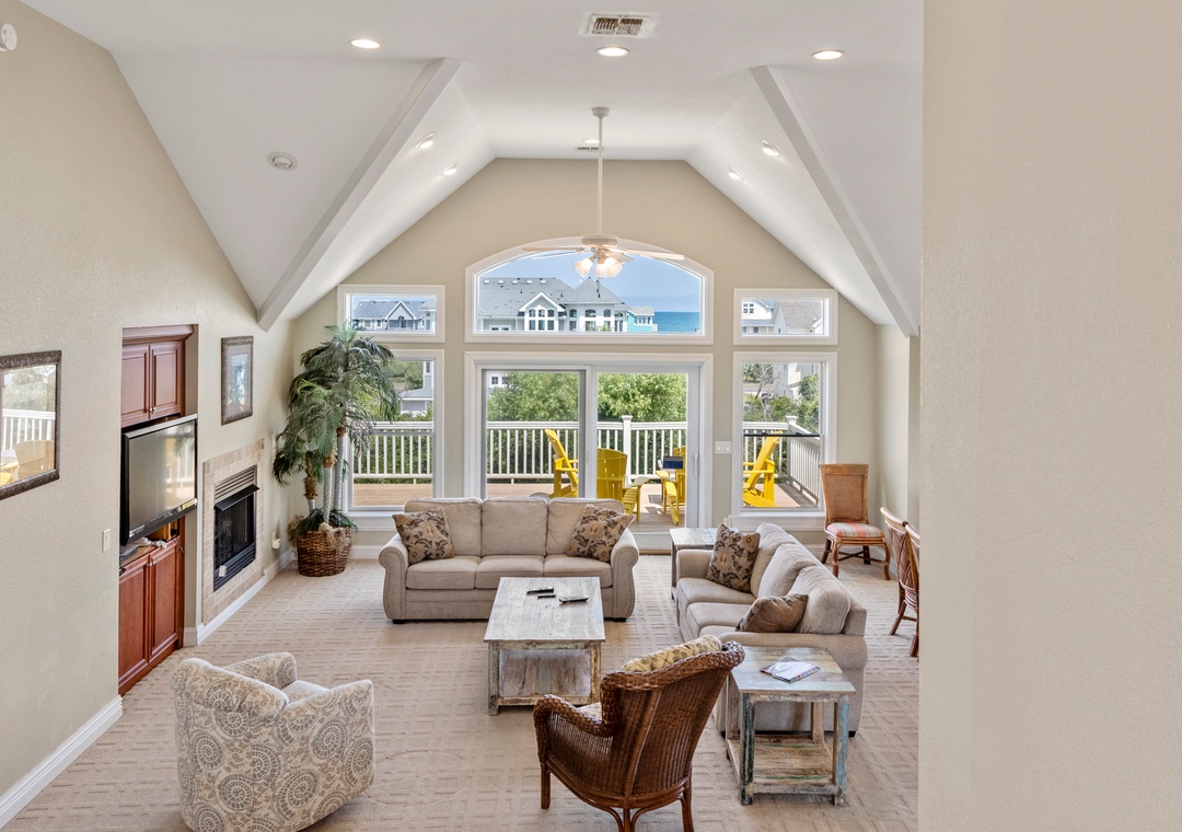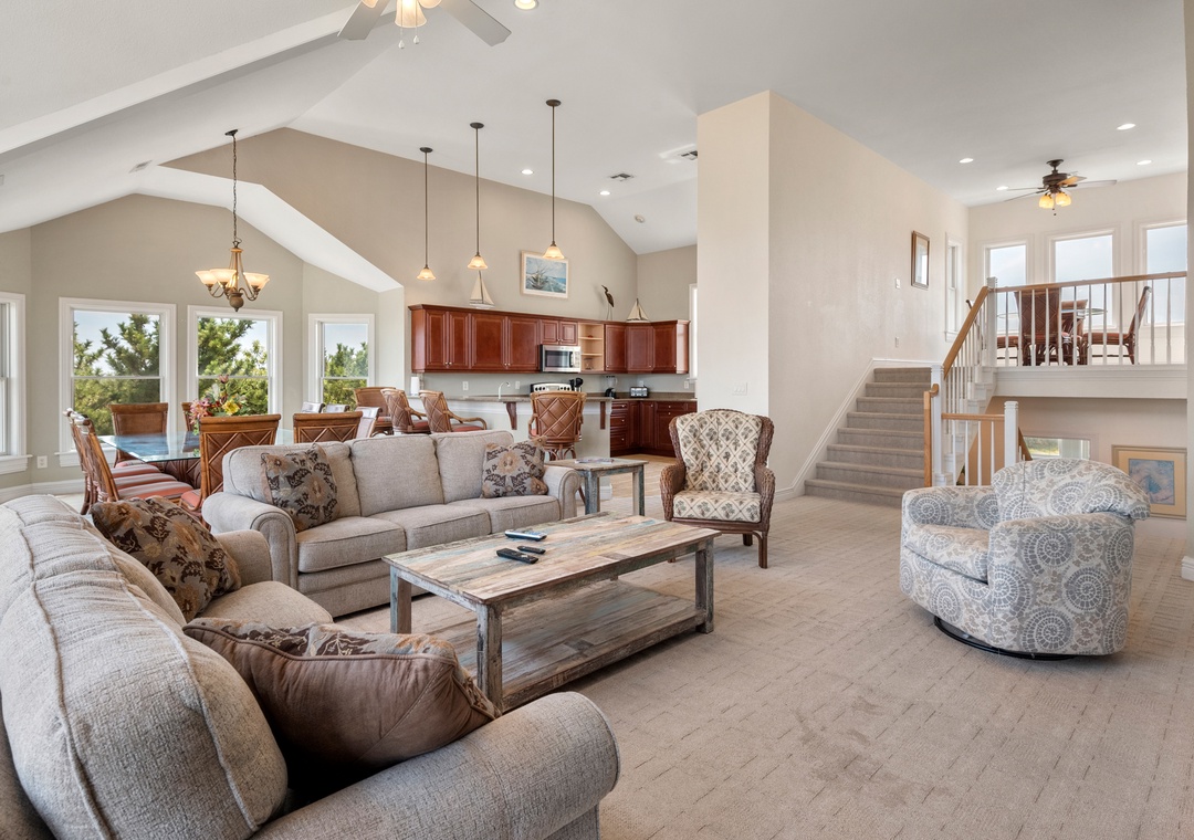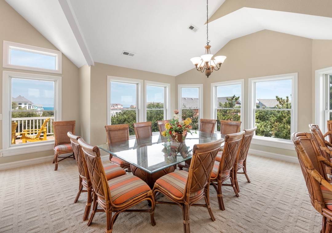 The tastefully appointed open-concept great room boasts an ocean view, vaulted ceilings and plenty of space for gathering. When you're not dining out at one of Corolla's fabulous restaurants, prepare meals at home in the kitchen featuring granite countertops and stainless steel appliances. Two generously sized king suites are located on the top level and each include a private bath. With five more bedrooms located on the mid-level (three of which are ensuite) and two more on the ground floor, this spacious retreat is ideal for multiple or extended families. Even the canine members of your tribe can join you since Mi Casa Bella is dog-friendly.