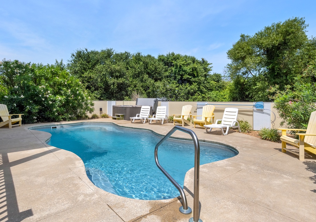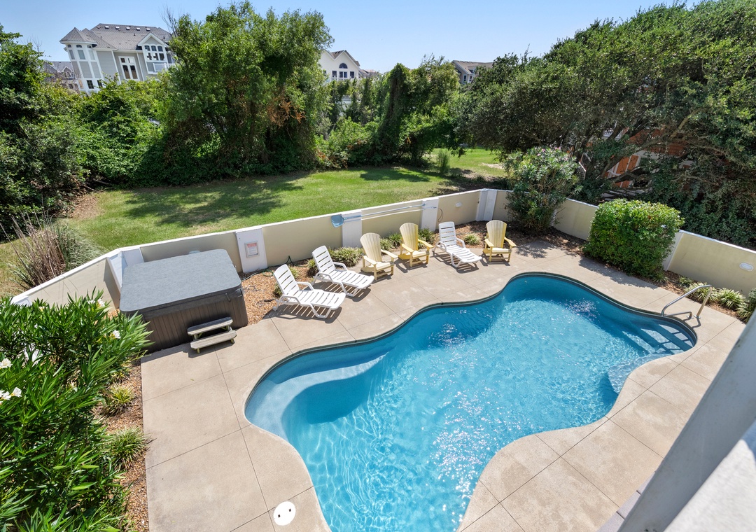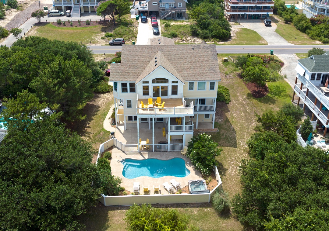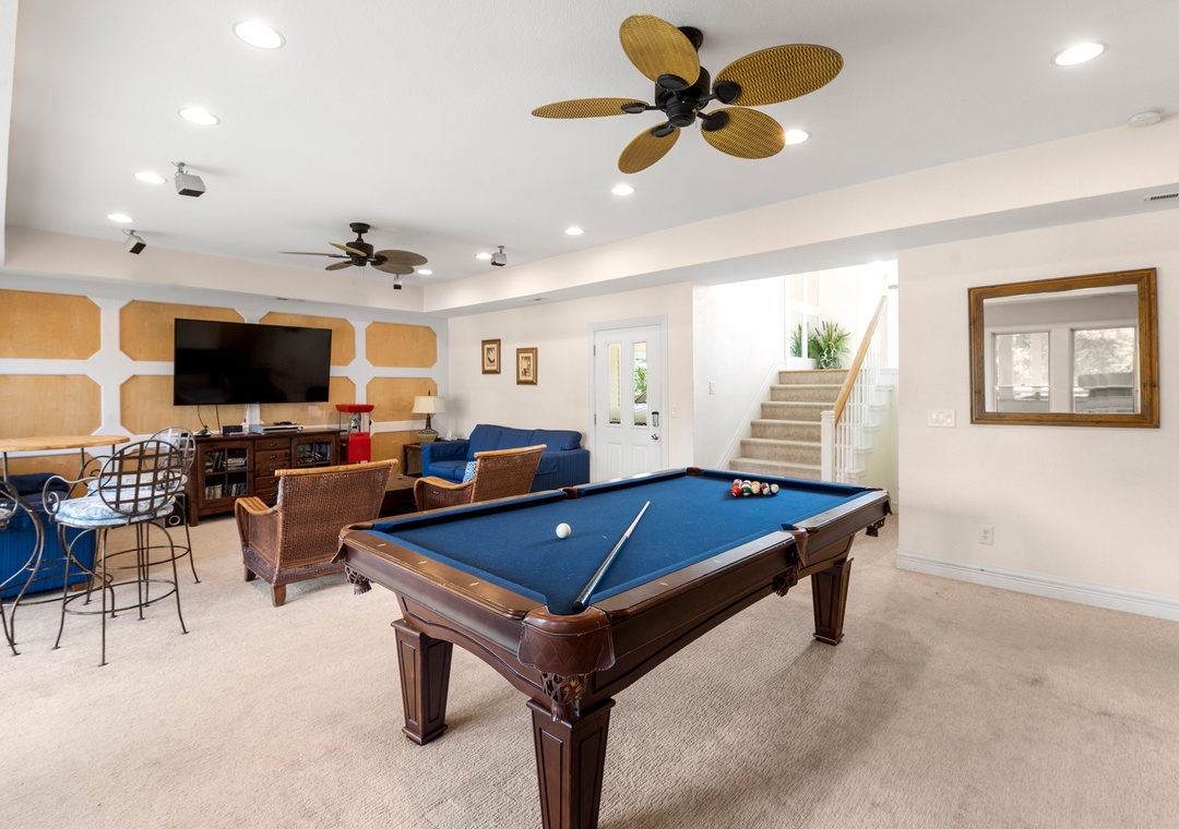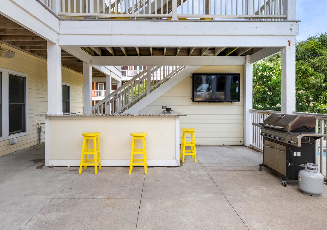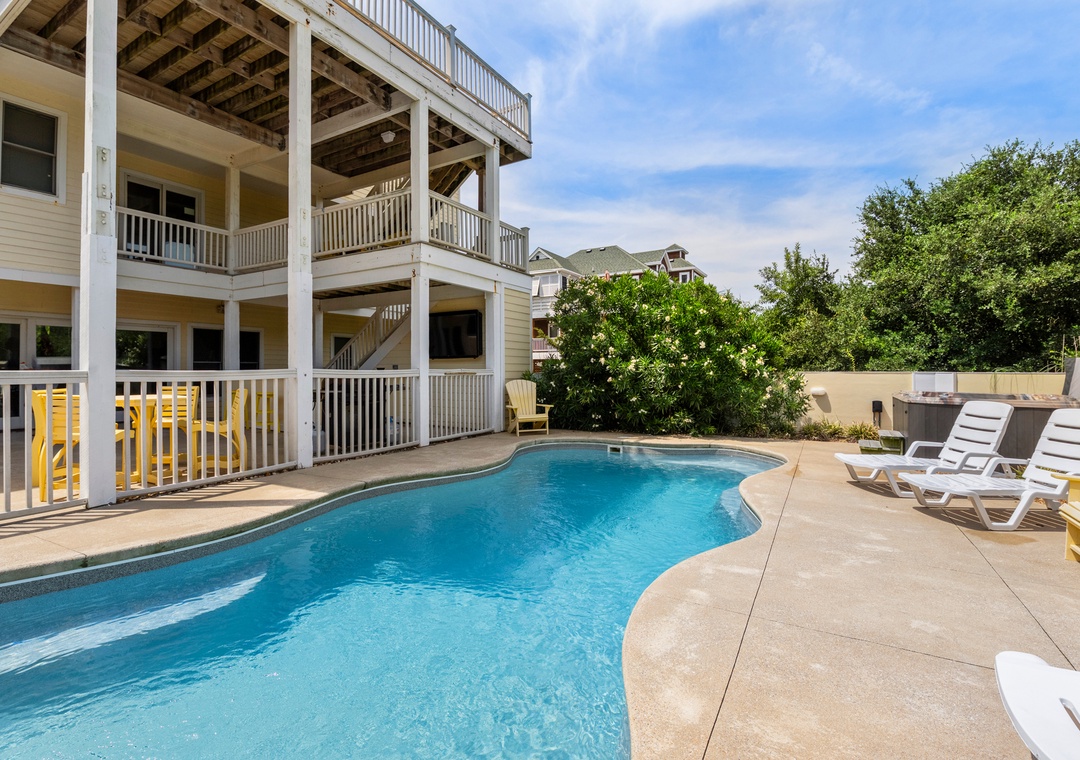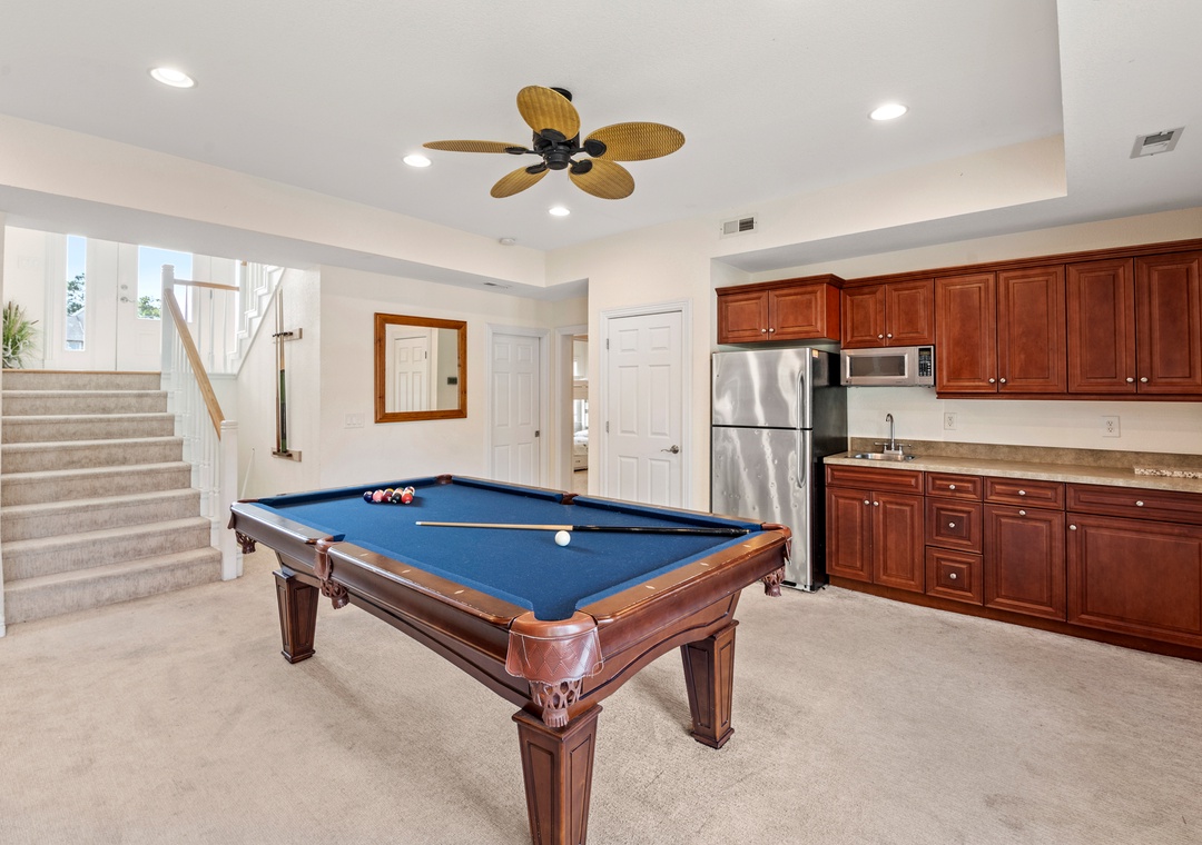 Downstairs is where the fun will continue after a day at the beach. An expansive rec room is equipped with a pool table for hours of indoor entertainment, along with a comfortable seating area and TV that can serve as a second living space. There's also a wet bar for convenient poolside drinks and snacks, with an additional full-size fridge is for storing extra groceries or the catch of the day. The rec room provides direct access to the private backdoor oasis, where your family can splash in the pool or take a relaxing soak in the hot tub. Fire up the grill for a surf-and-turf cookout or gather around the tiki bar for an outdoor happy hour anytime of the day.