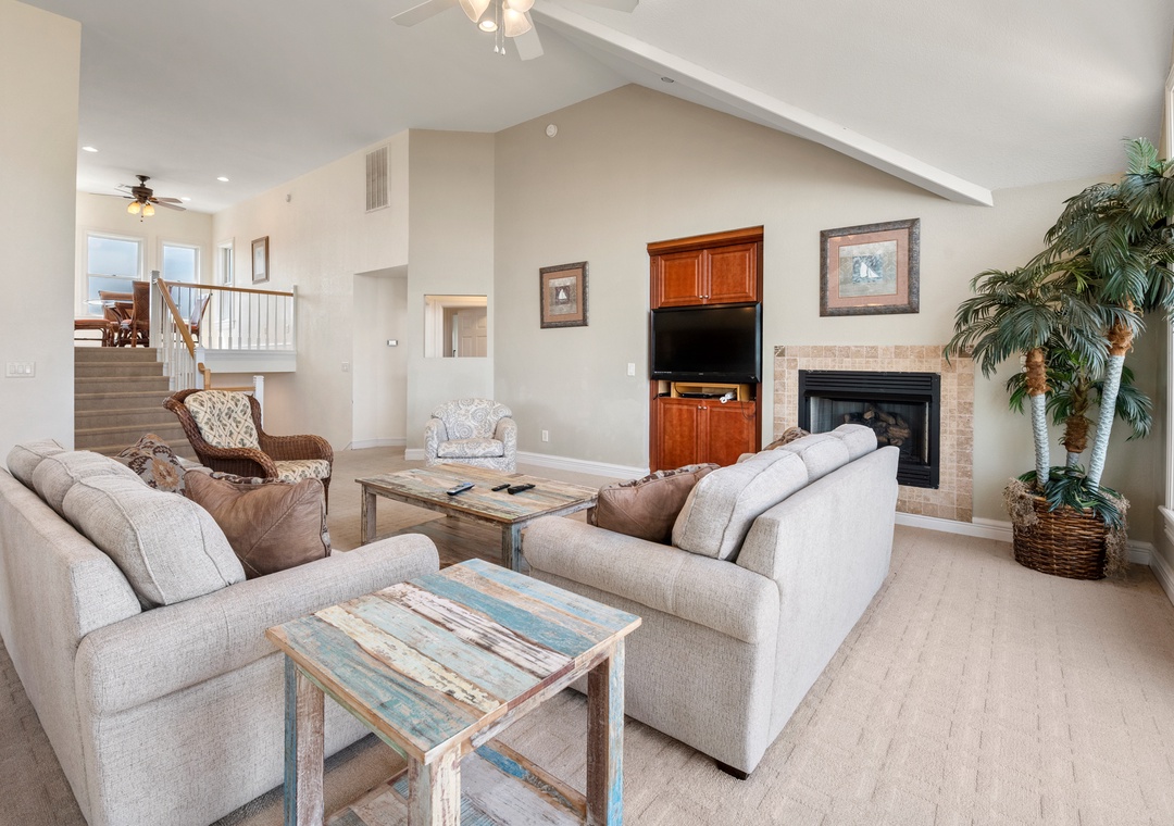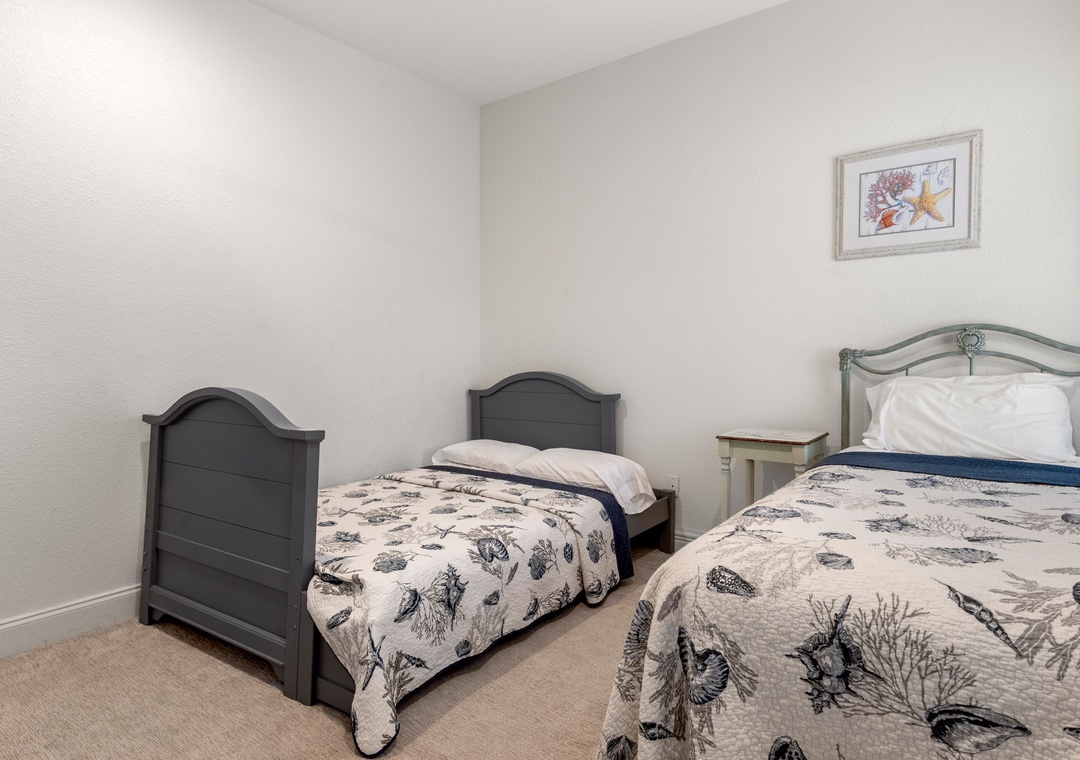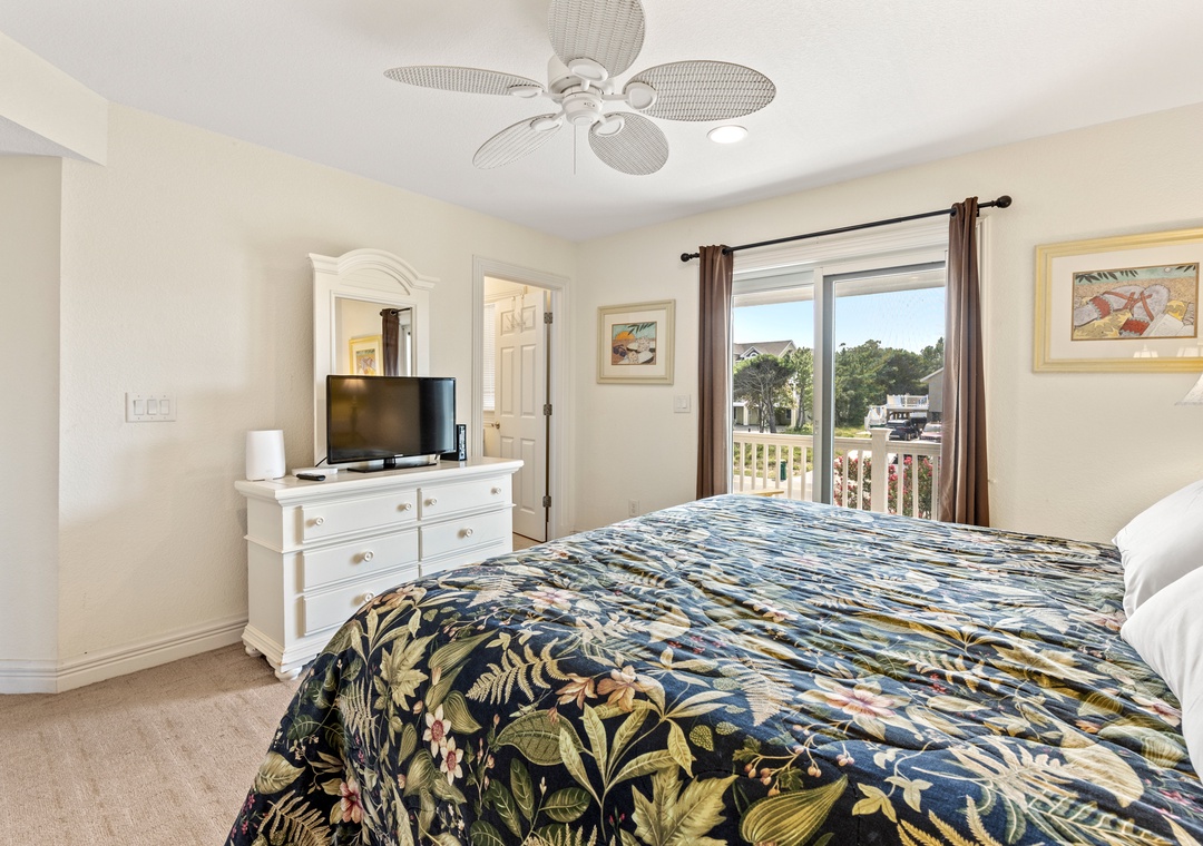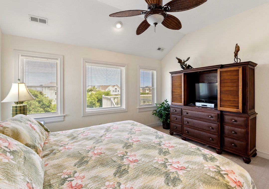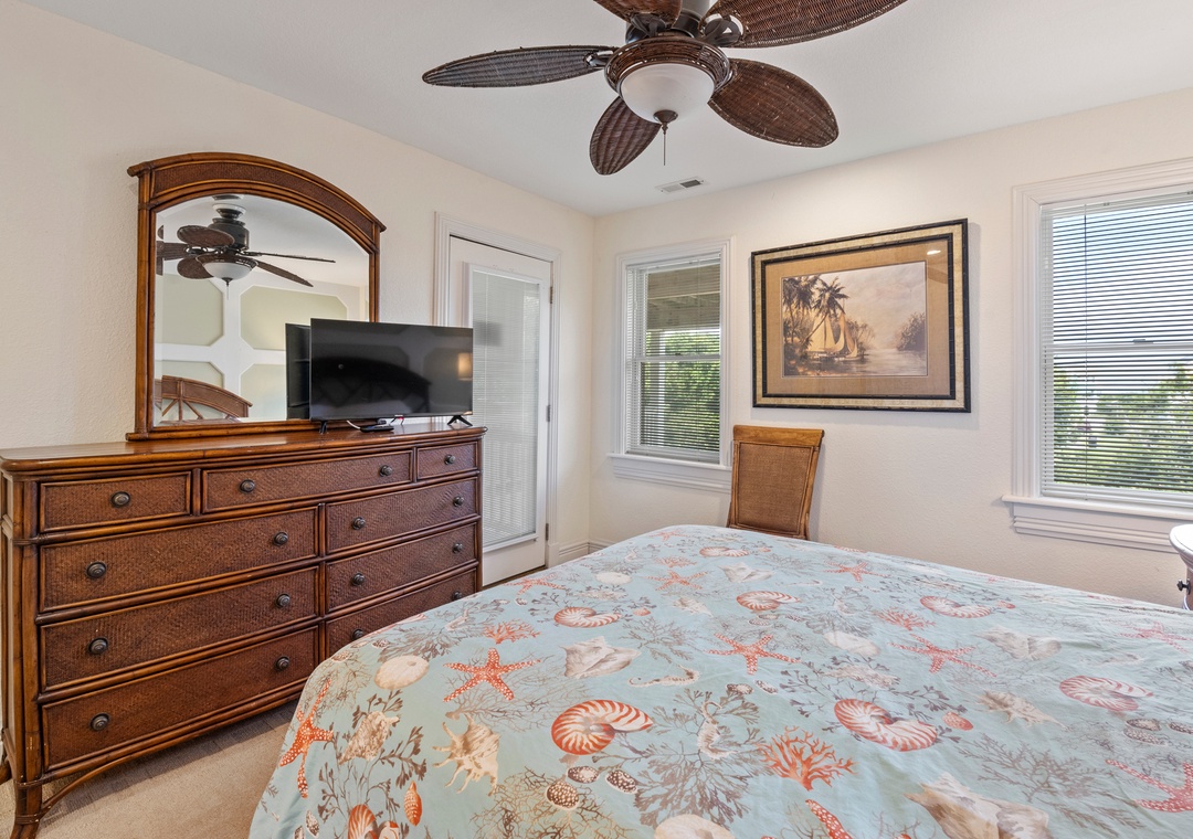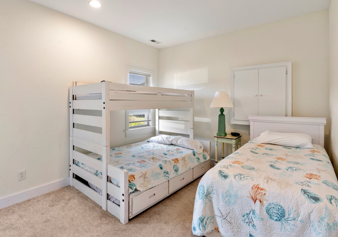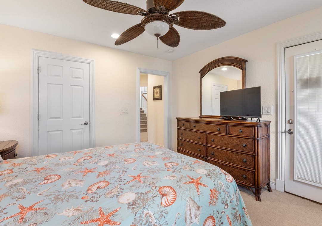 Downstairs is where the fun will continue after a day at the beach. An expansive rec room is equipped with a pool table for hours of indoor entertainment, along with a comfortable seating area and TV that can serve as a second living space. There's also a wet bar for convenient poolside drinks and snacks, with an additional full-size fridge is for storing extra groceries or the catch of the day. The rec room provides direct access to the private backdoor oasis, where your family can splash in the pool or take a relaxing soak in the hot tub. Fire up the grill for a surf-and-turf cookout or gather around the tiki bar for an outdoor happy hour anytime of the day.