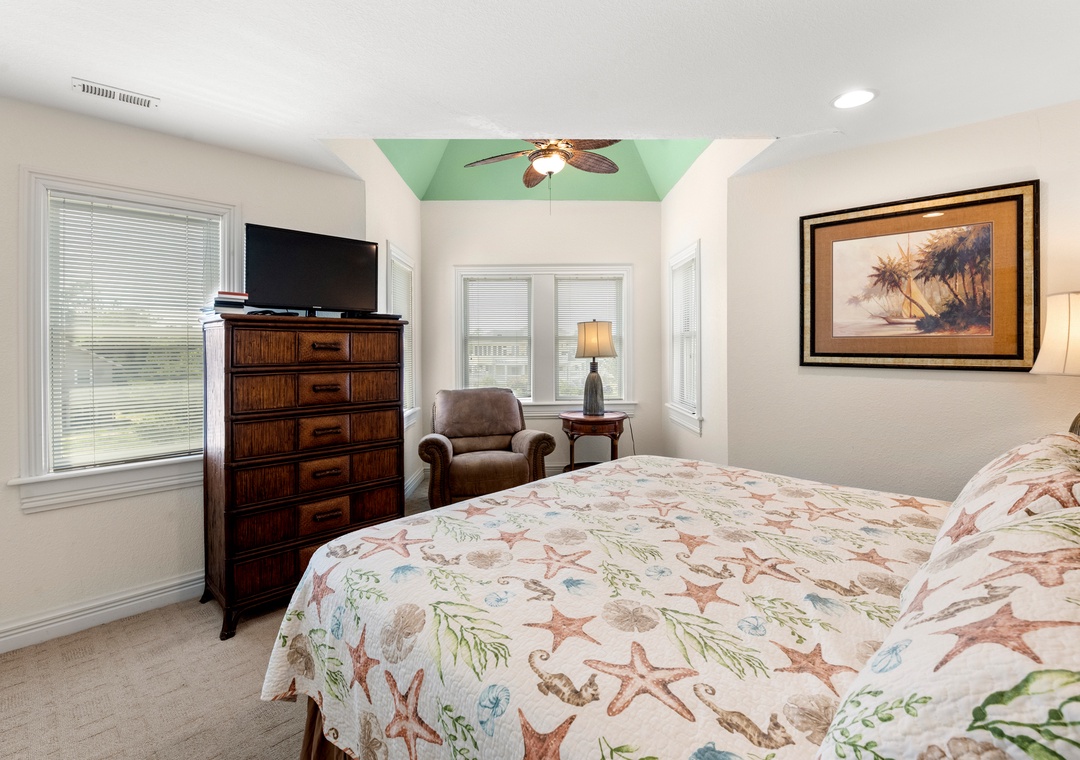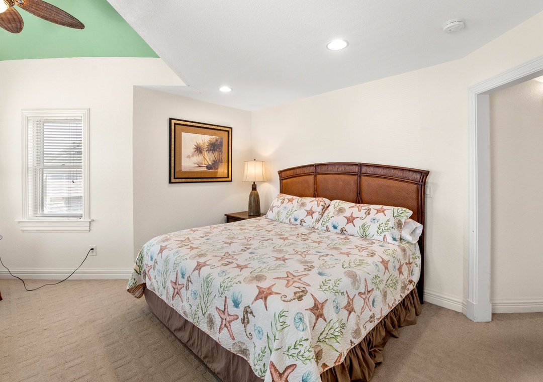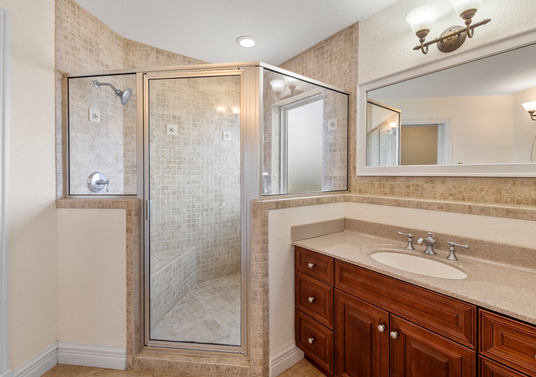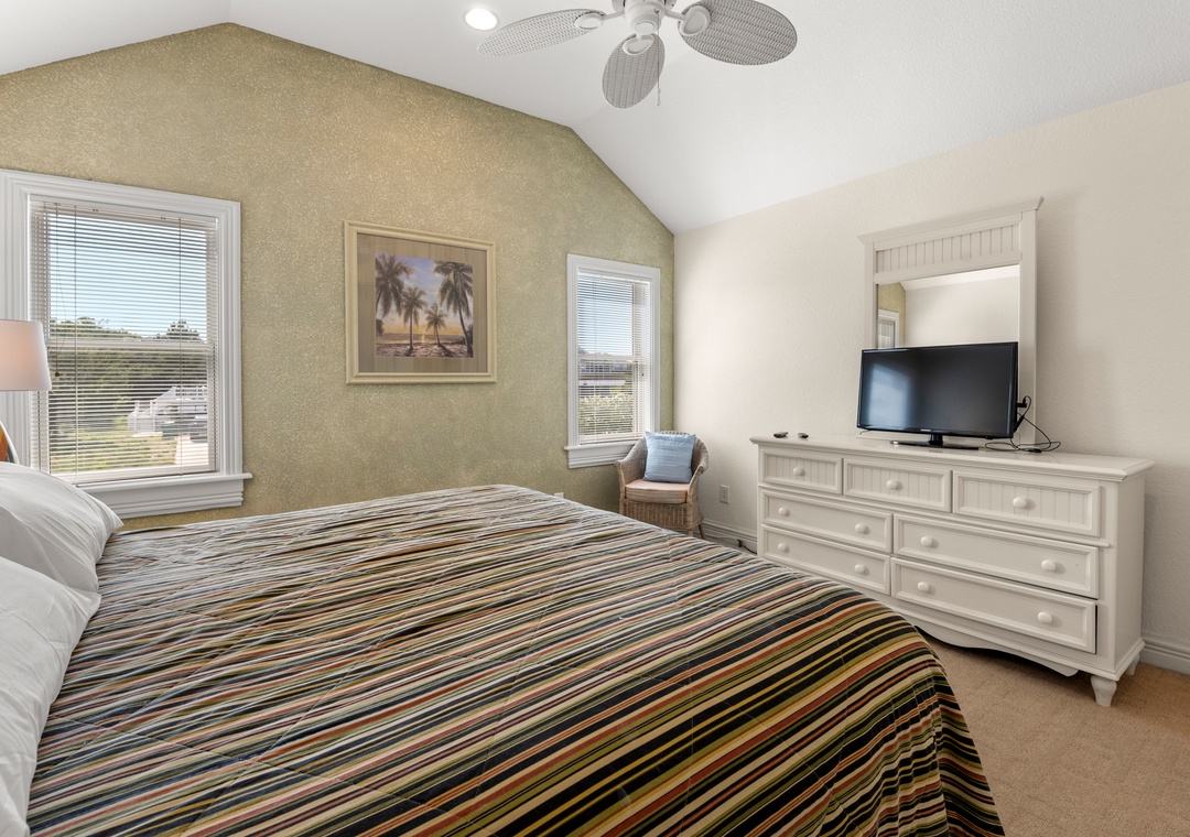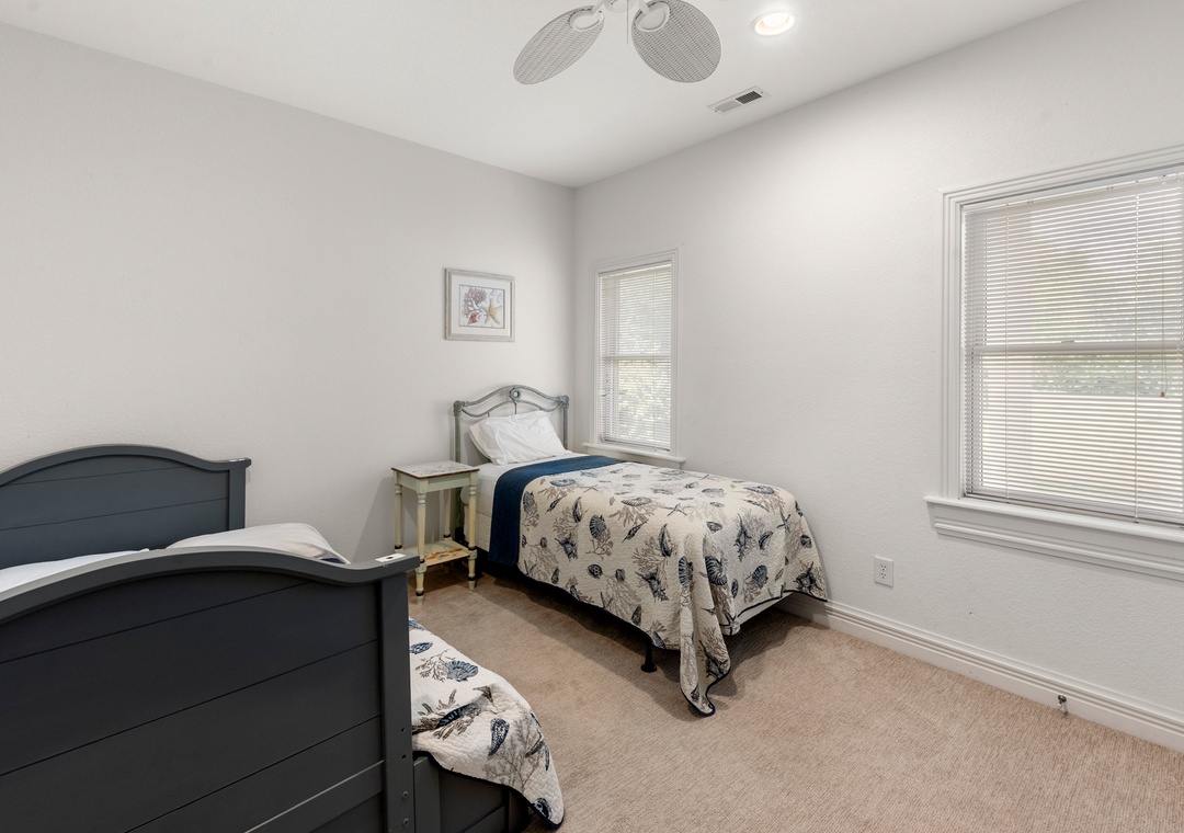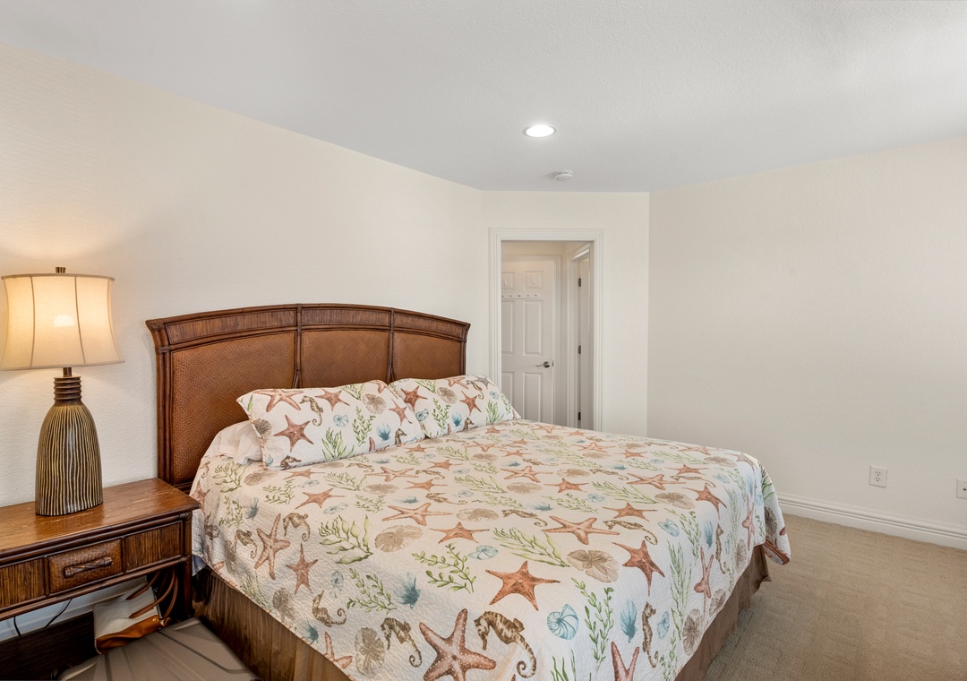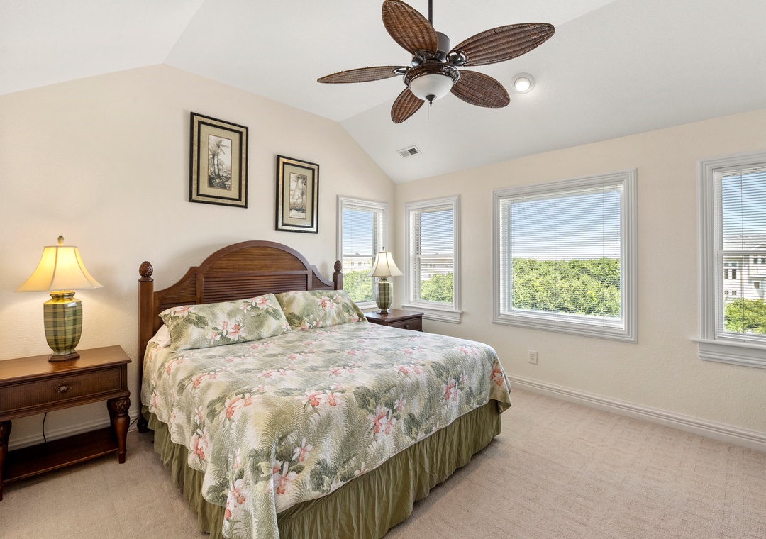 Downstairs is where the fun will continue after a day at the beach. An expansive rec room is equipped with a pool table for hours of indoor entertainment, along with a comfortable seating area and TV that can serve as a second living space. There's also a wet bar for convenient poolside drinks and snacks, with an additional full-size fridge is for storing extra groceries or the catch of the day. The rec room provides direct access to the private backdoor oasis, where your family can splash in the pool or take a relaxing soak in the hot tub. Fire up the grill for a surf-and-turf cookout or gather around the tiki bar for an outdoor happy hour anytime of the day.