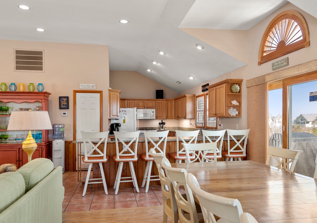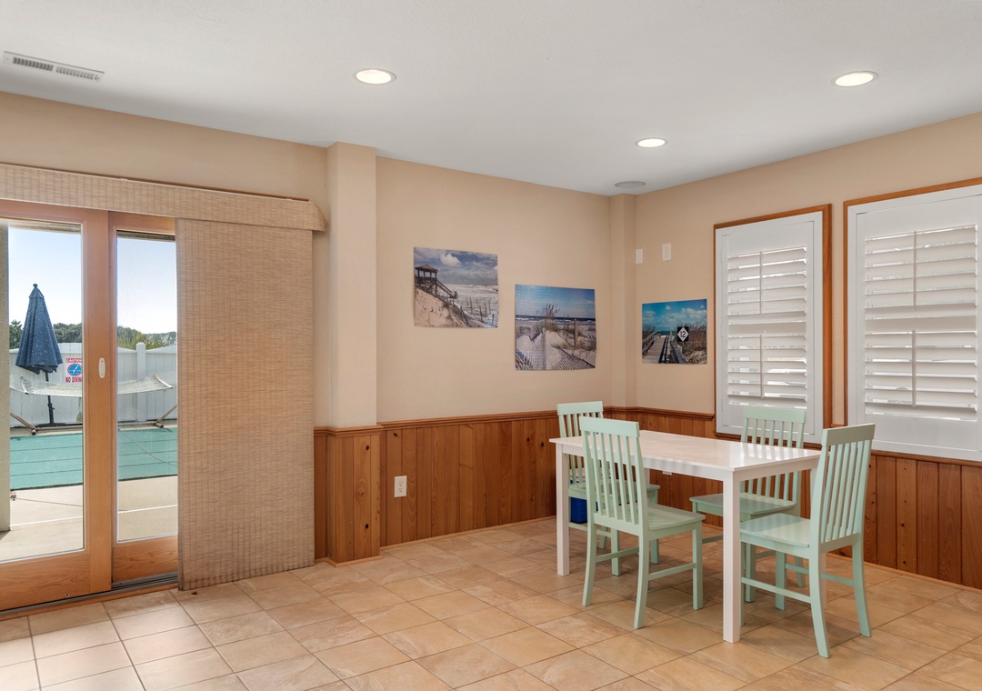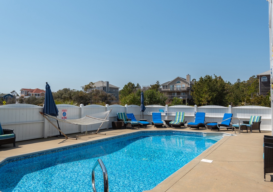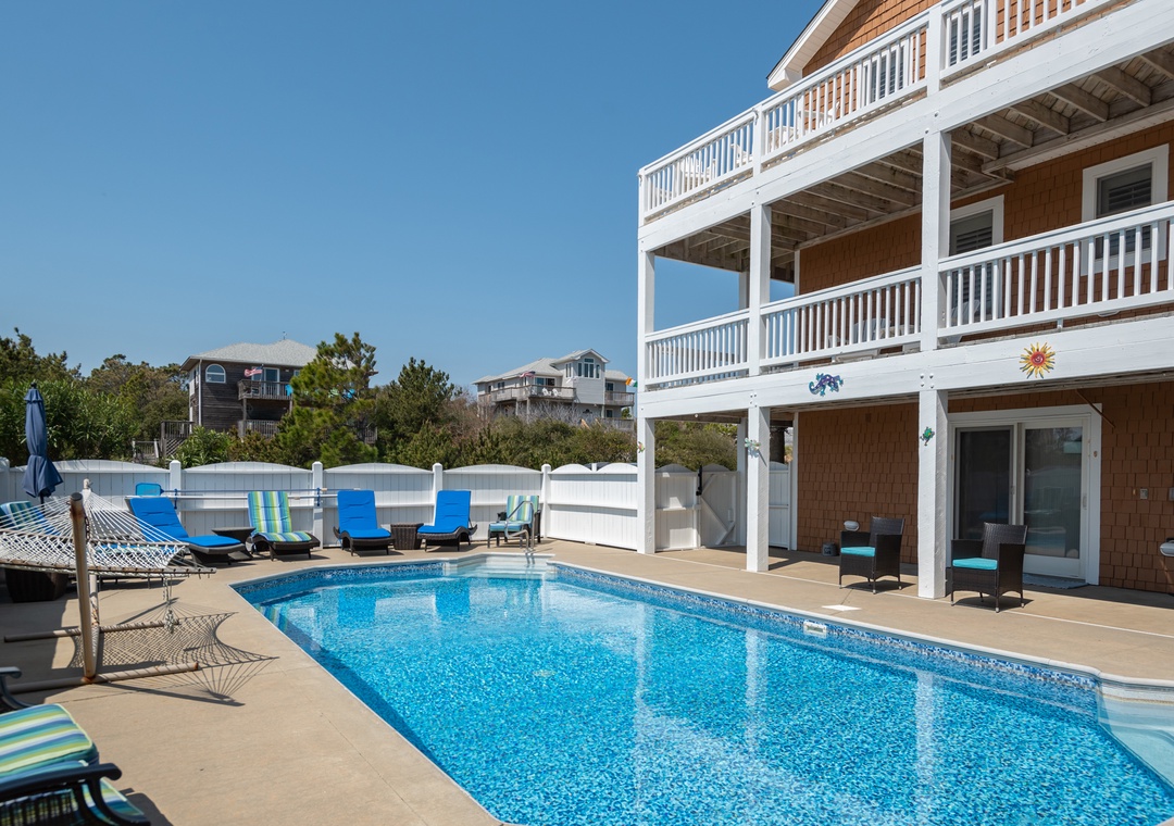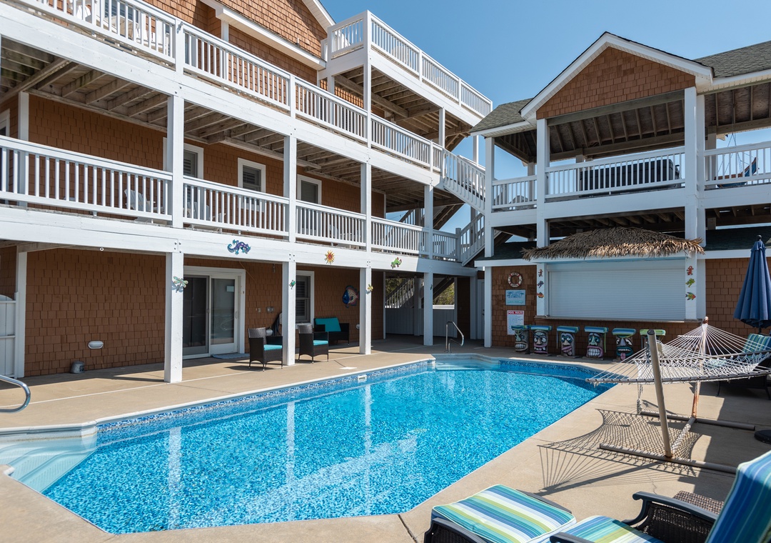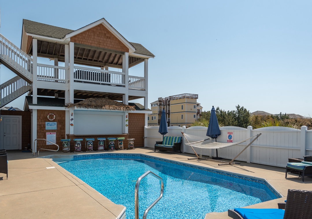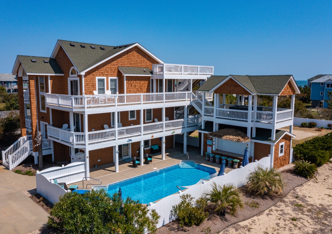The home was perfect for our family of 8 adults and 5 children! We were able to enjoy the wonderful pool and fun tiki bar; and the ocean was a quick walk from the house (less than 1000 feet). The home was very clean and comfortable- and the kitchen well stocked with all the necessities (plates/bowls, drink ware, pots/pans, platters, etc). We appreciated that there were plenty of beach chairs and some other beach accessories for adults and kids. Multiple decks and plenty of Adirondack chairs gave our family space to kick back and relax. The bedrooms were very nice and beds comfortable. The bathrooms were average (they could use an update). We all loved the framed puzzles and enjoyed playing games and eating our meals at the large dining room table. The owners love of their home is evident and we can’t thank them enough for sharing it with us! We would love to come back again!!!- Reviewed On: 7/1/2022