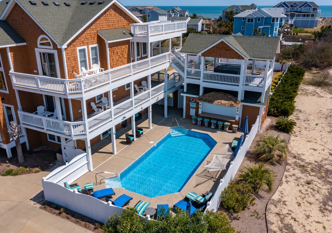 The home was perfect for our family of 8 adults and 5 children! We were able to enjoy the wonderful pool and fun tiki bar; and the ocean was a quick walk from the house (less than 1000 feet). The home was very clean and comfortable- and the kitchen well stocked with all the necessities (plates/bowls, drink ware, pots/pans, platters, etc). We appreciated that there were plenty of beach chairs and some other beach accessories for adults and kids. Multiple decks and plenty of Adirondack chairs gave our family space to kick back and relax. The bedrooms were very nice and beds comfortable. The bathrooms were average (they could use an update). We all loved the framed puzzles and enjoyed playing games and eating our meals at the large dining room table. The owners love of their home is evident and we can’t thank them enough for sharing it with us! We would love to come back again!!!- Posted: 7/1/2022