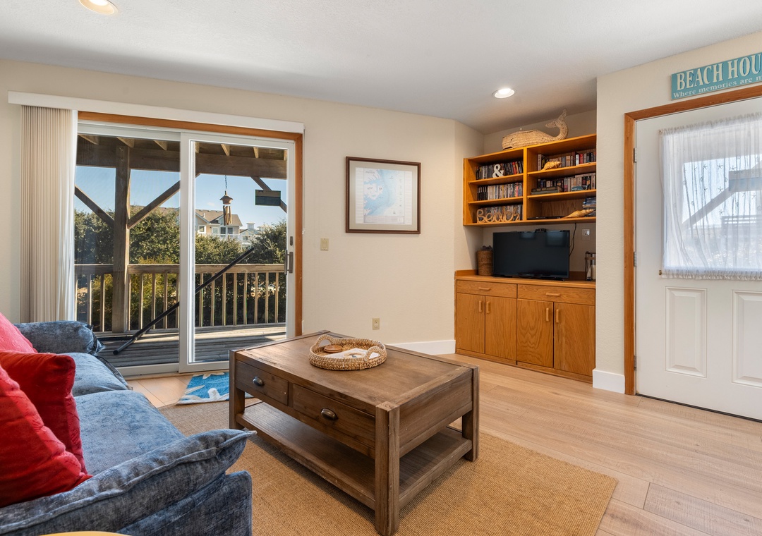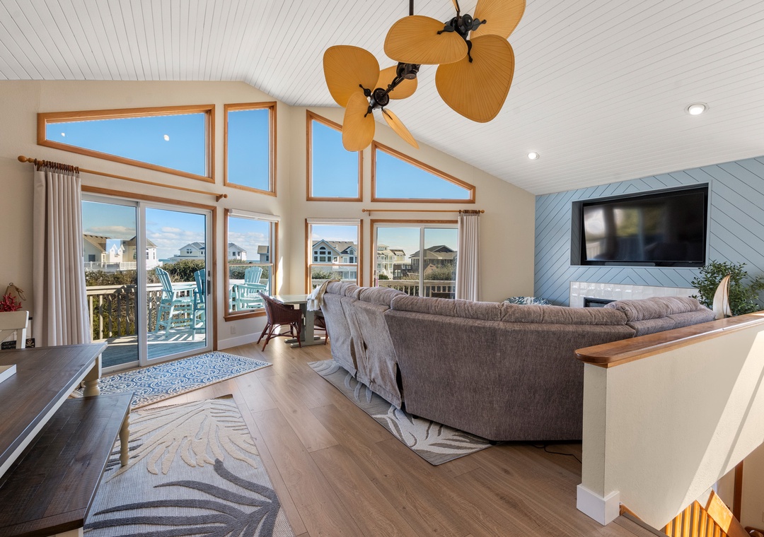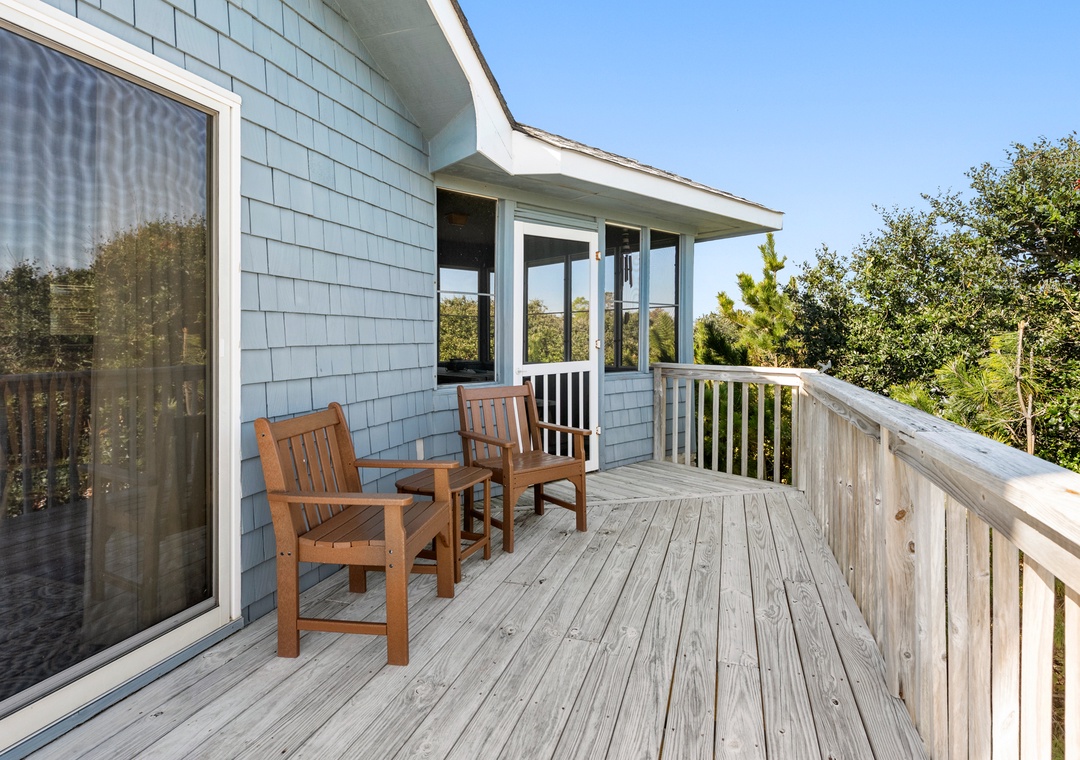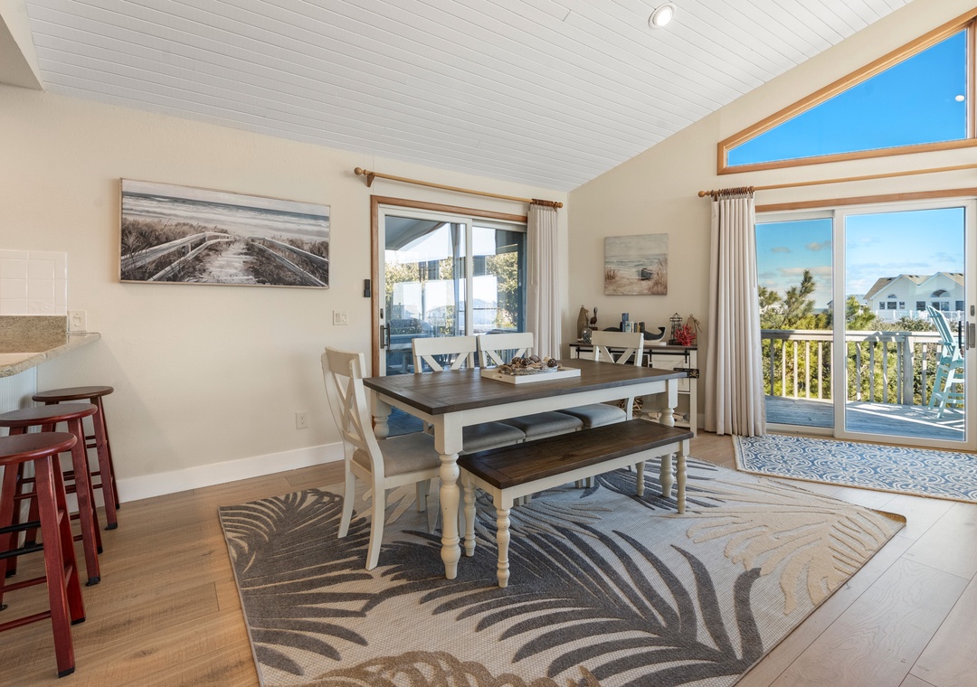When you come home from the beach, relax in the comfortably furnished living area featuring an open-concept layout, hardwood flooring and vaulted ceilings. It leads out to an east-facing sun deck where you can enjoy a horizon view of the ocean and a refreshing coastal breeze. When you're not dining out, prepare meals in the well-stocked kitchen and serve at the dining table for eight or al fresco on the screened porch. The top-level primary bedroom also provides deck access as well as an ensuite bath for plenty of privacy. Three additional bedrooms on the mid-level (including a second ensuite) will comfortably accommodate family and friends, and the den can be used as a second living area or kid's hangout space.
